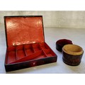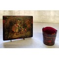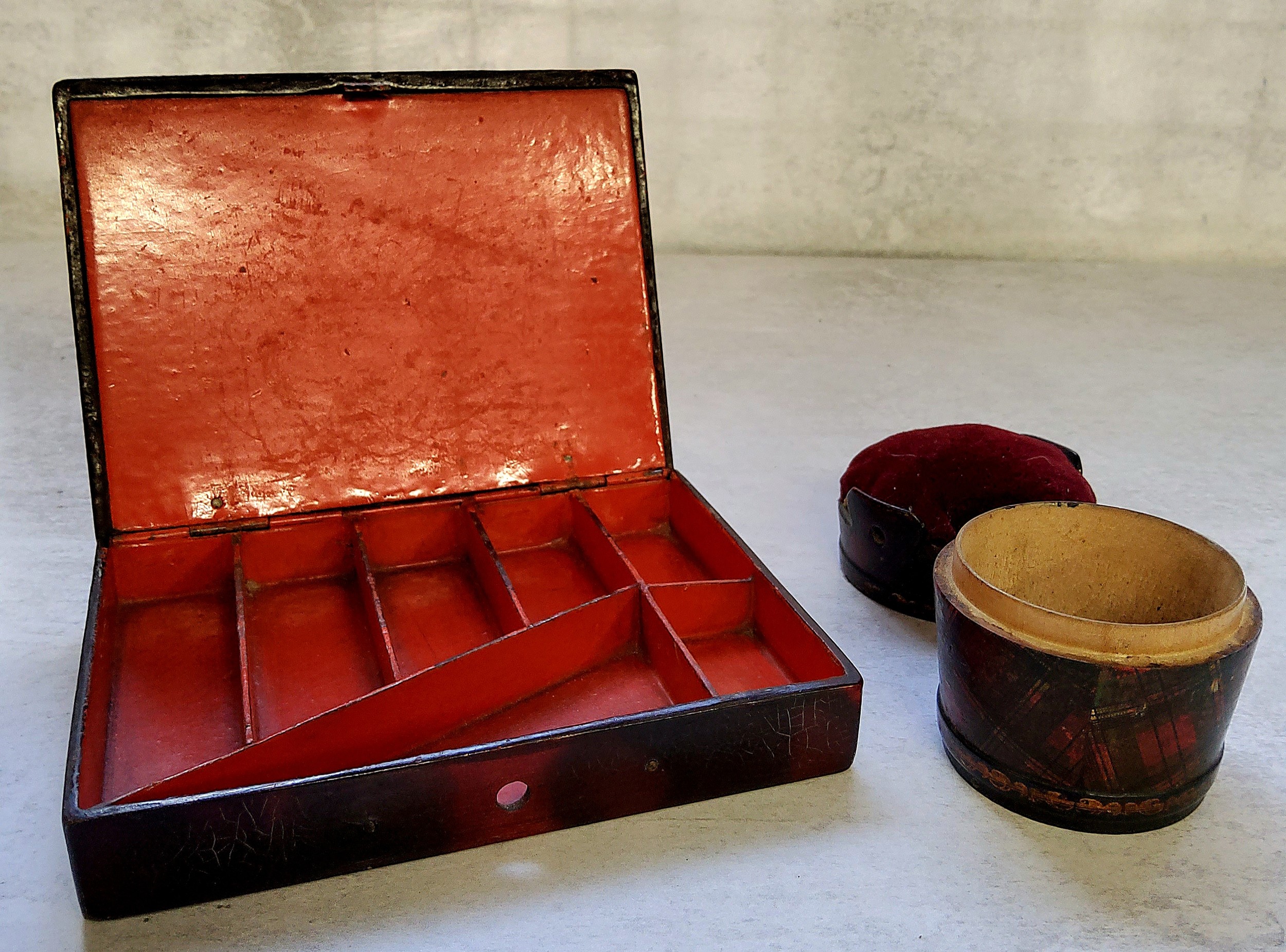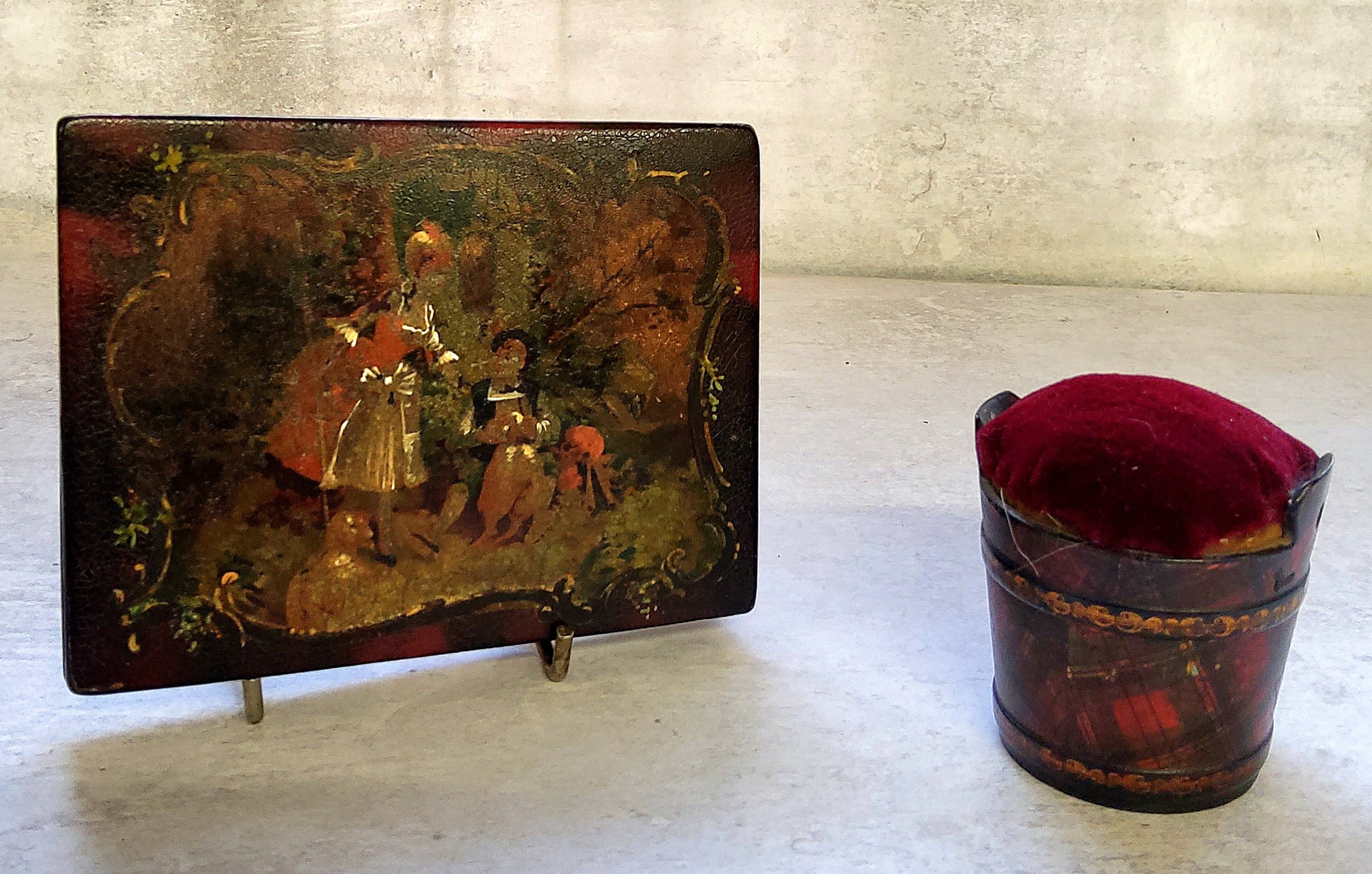 A Victorian Tartanware pin cushion in the form of a a two handled banded pail, labelled Prince Charlie; a lacquered metal wax seal box, decorated with a classical scene, the fitted interior enamalled in red
