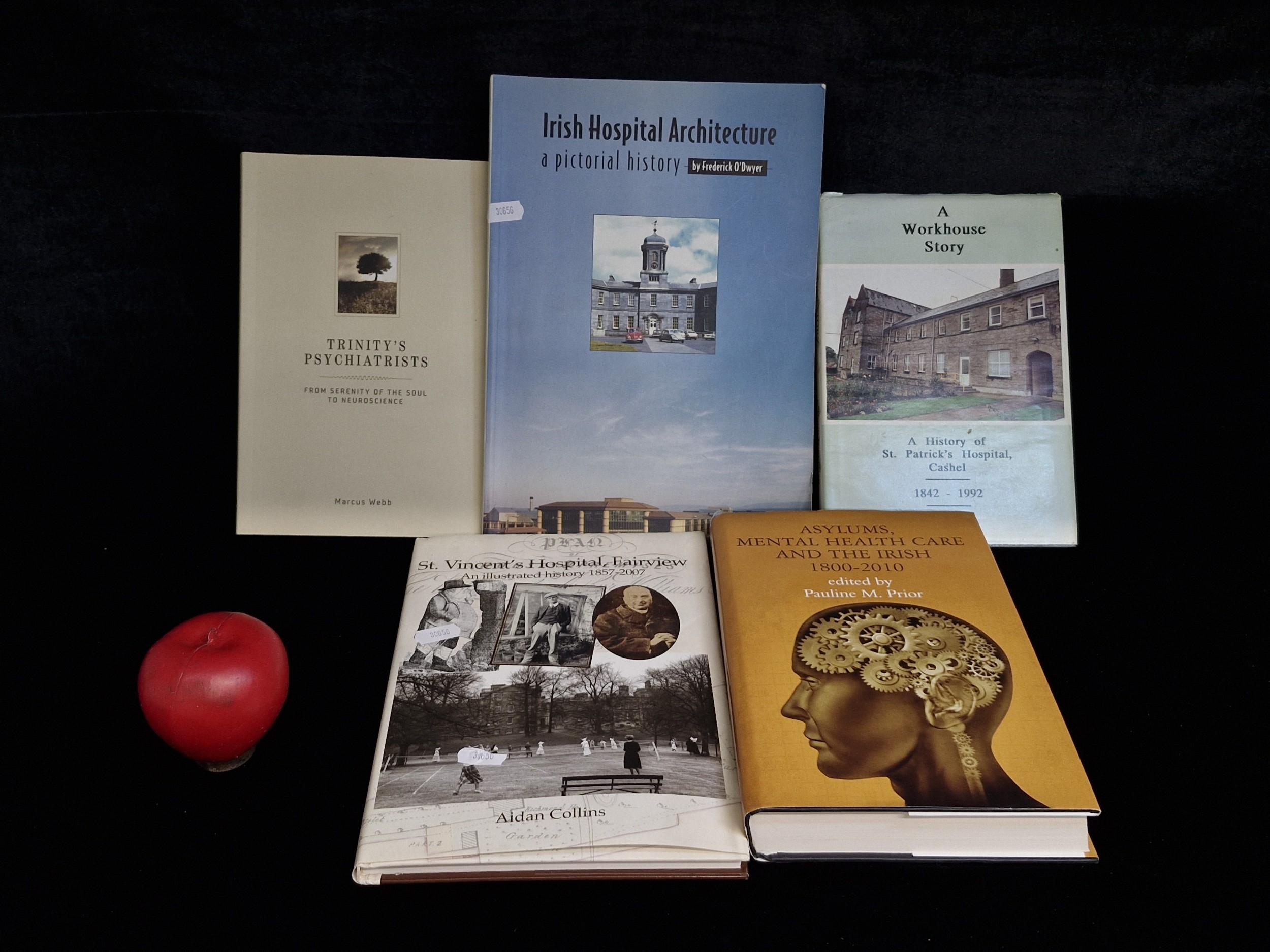 Five books including Pauline M. Prior Asylums, Mental Health Care and the Irish 1800-2010, Eamonn Lonergan A Workhouse Story A History of St. Patricks Hospital, Marcus Webb Trinitys Psychiatrists from serenity of the soul to neuroscience.
