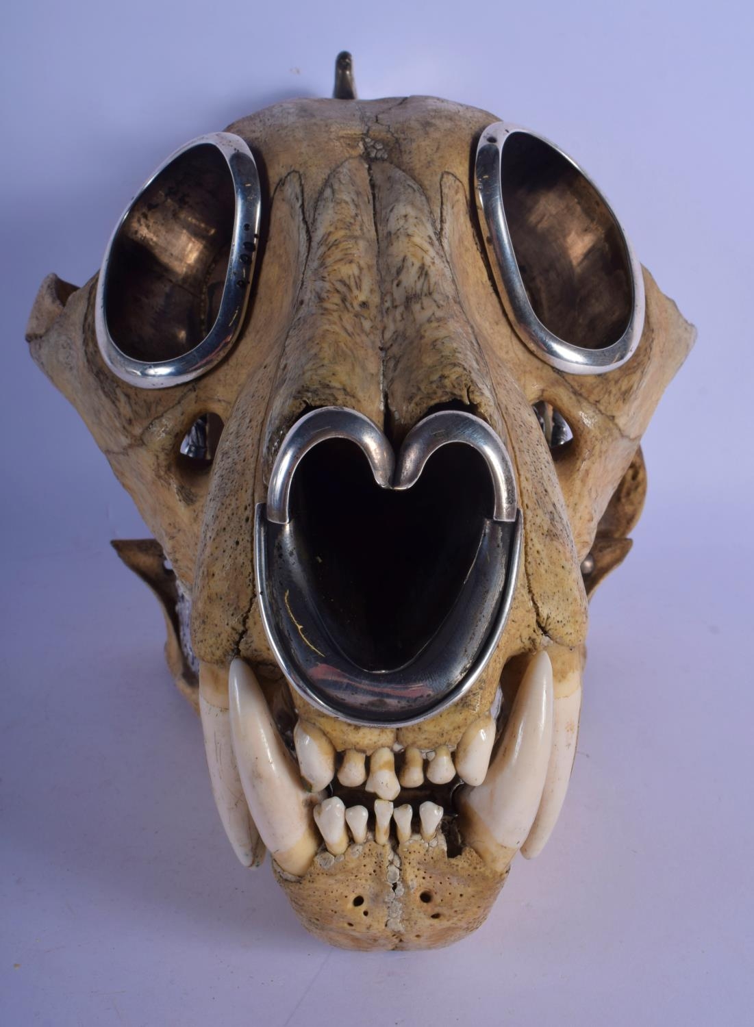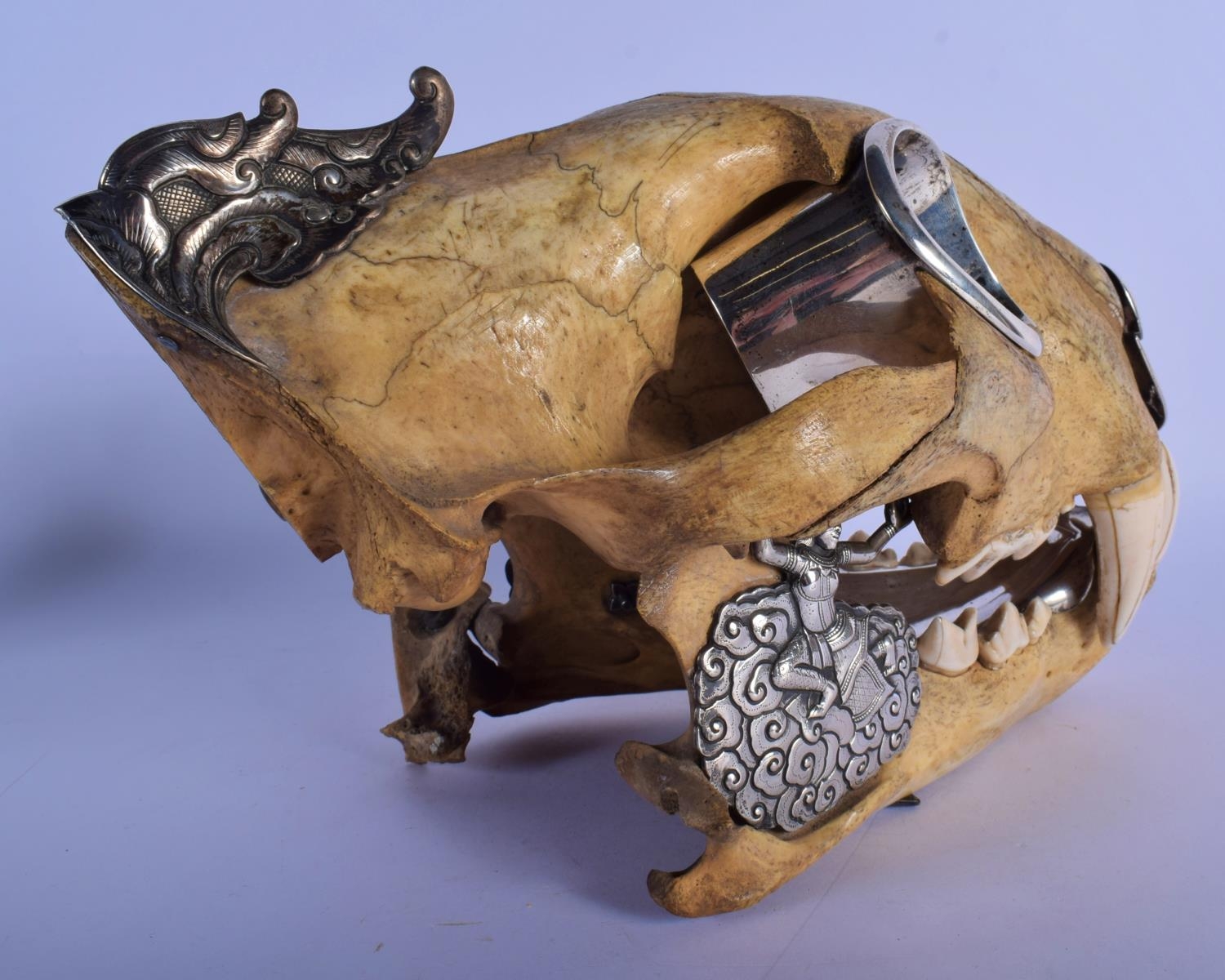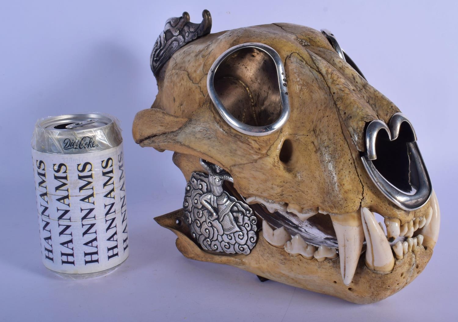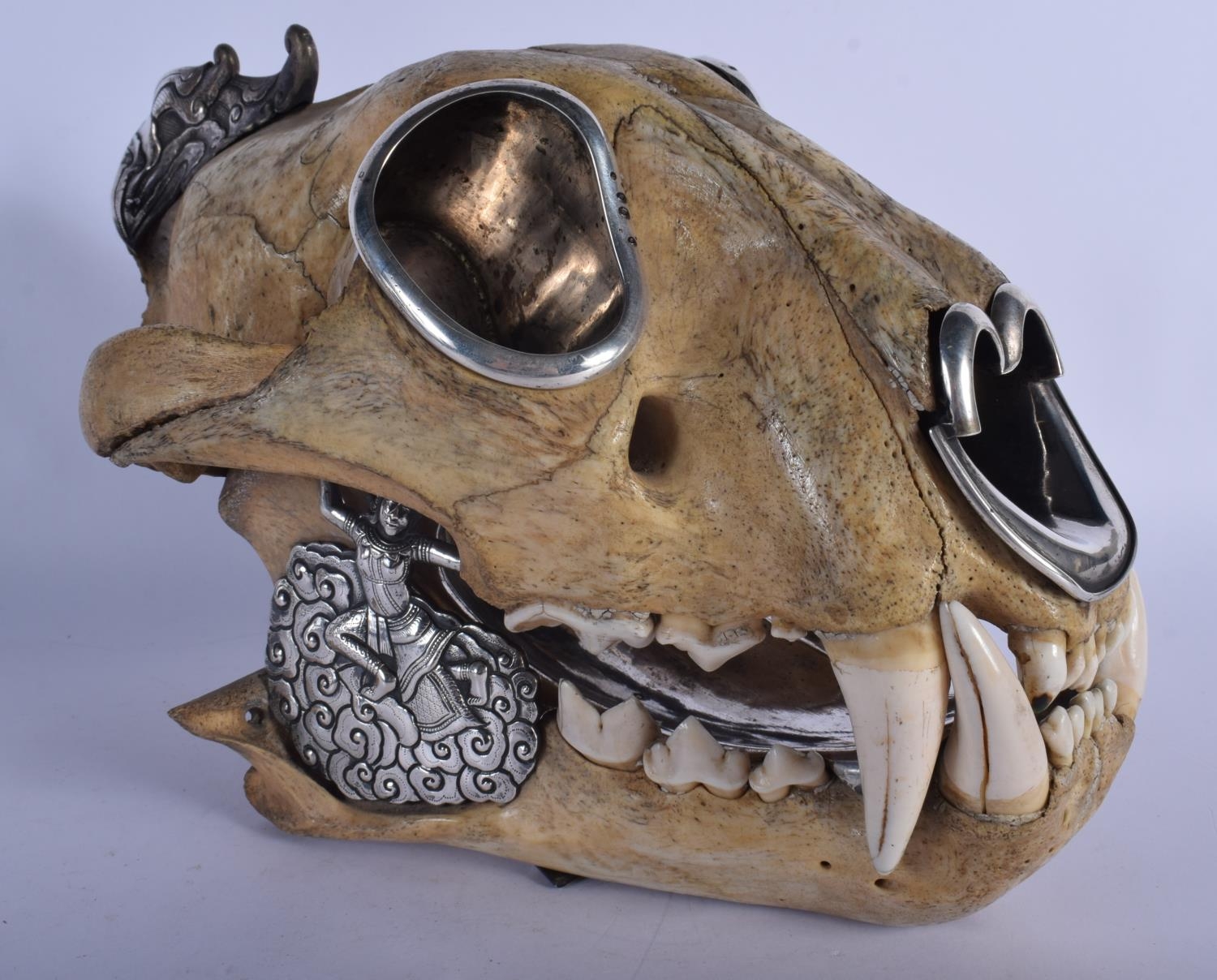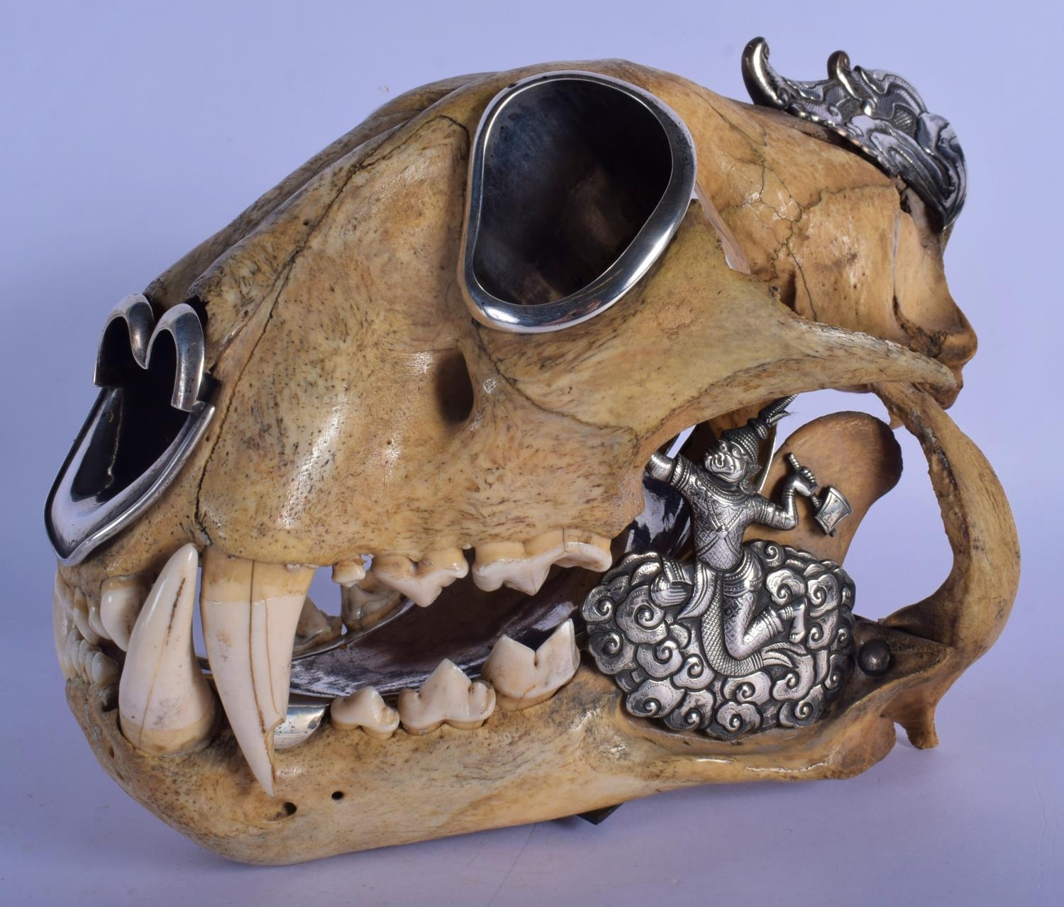A FINE AND RARE EARLY 20TH CENTURY SILVER MOUNTED MIDDLE EASTER TIGER SKULL probably Thai, formed as a smoking compendium, with intact teeth. 30 cm x 20 cm. Note: During the early party of the 20th century, it was a rare occurrence for Military personnel and hunters to form there trophies as smokers compendiums, for use within library's of officers quarters.