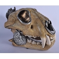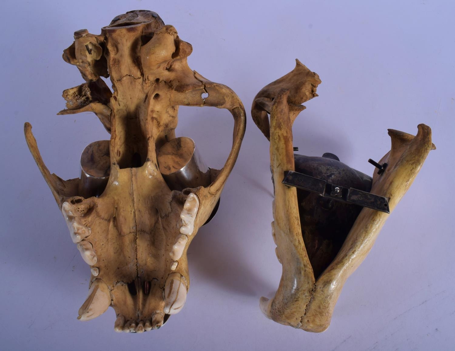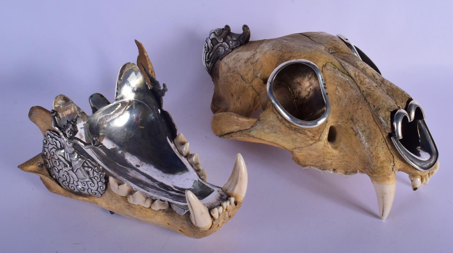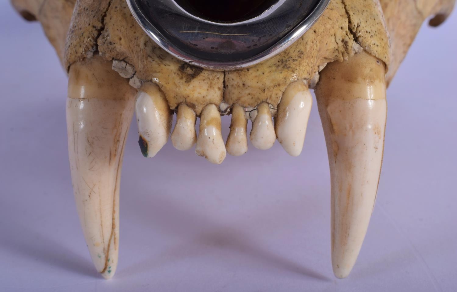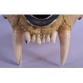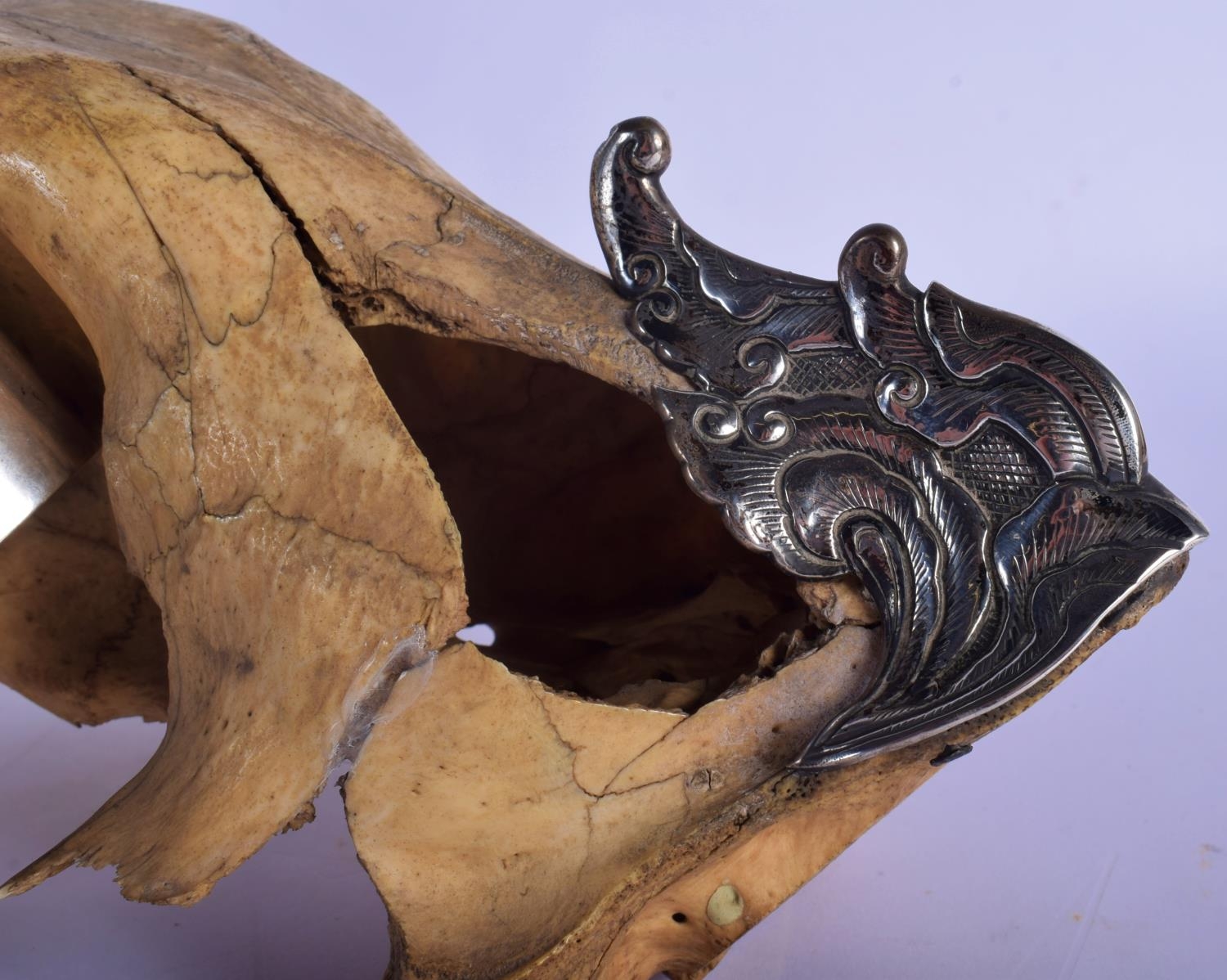 A FINE AND RARE EARLY 20TH CENTURY SILVER MOUNTED MIDDLE EASTER TIGER SKULL probably Thai, formed as a smoking compendium, with intact teeth. 30 cm x 20 cm. Note: During the early party of the 20th century, it was a rare occurrence for Military personnel and hunters to form there trophies as smokers compendiums, for use within library's of officers quarters.