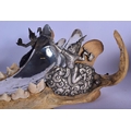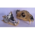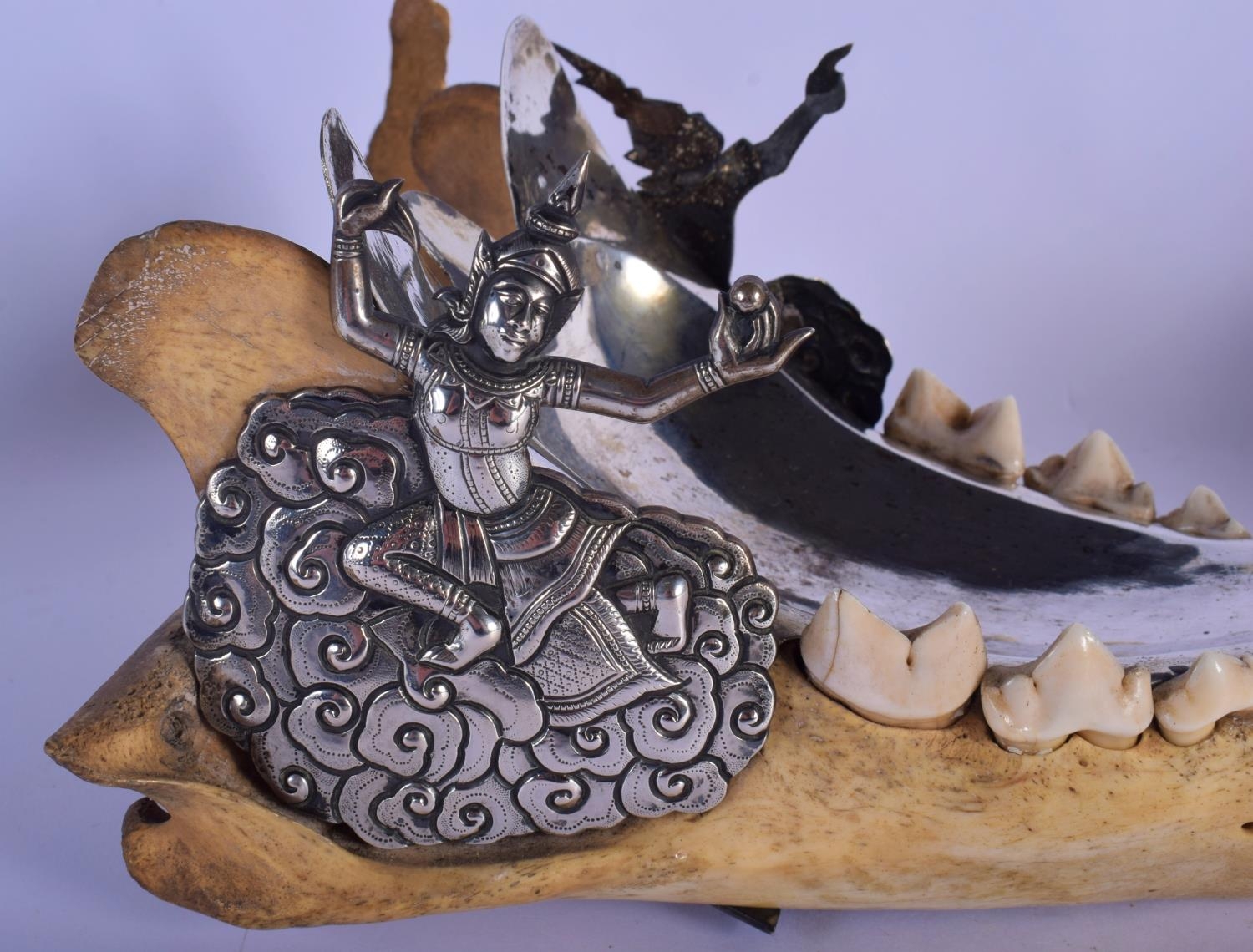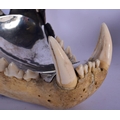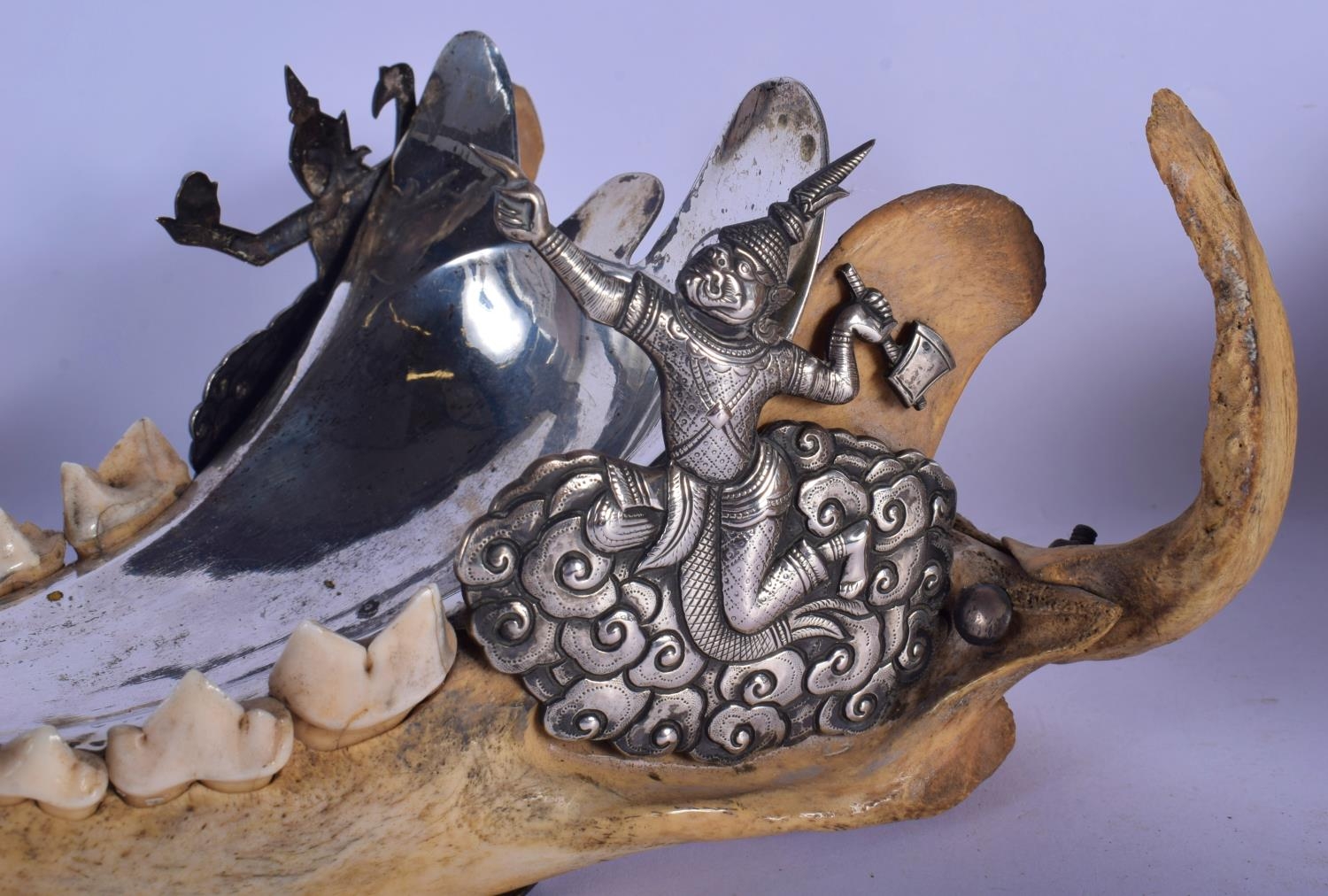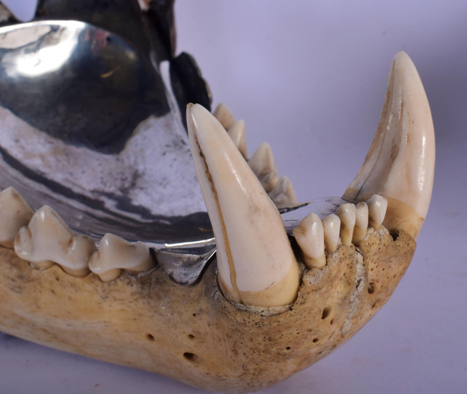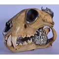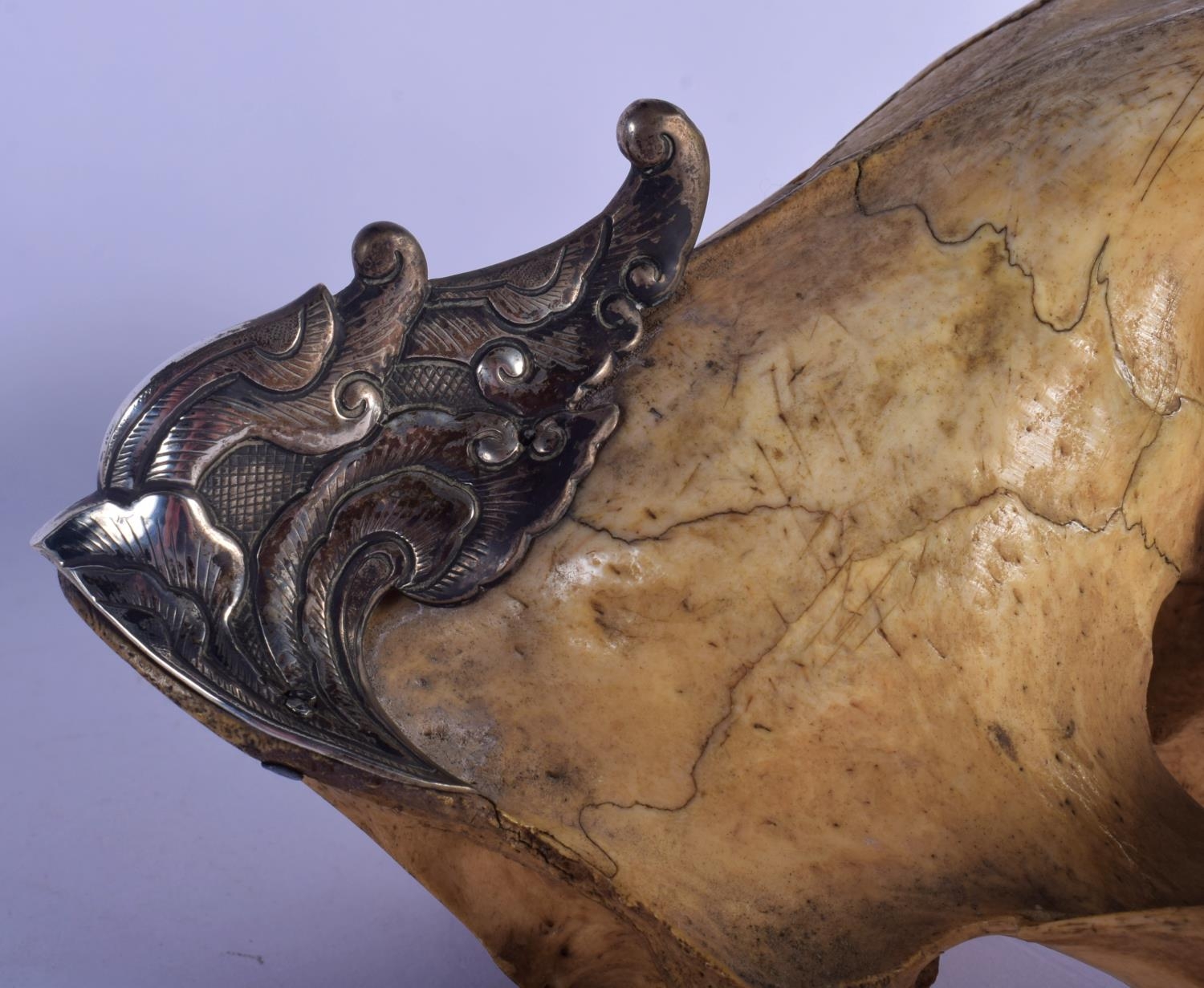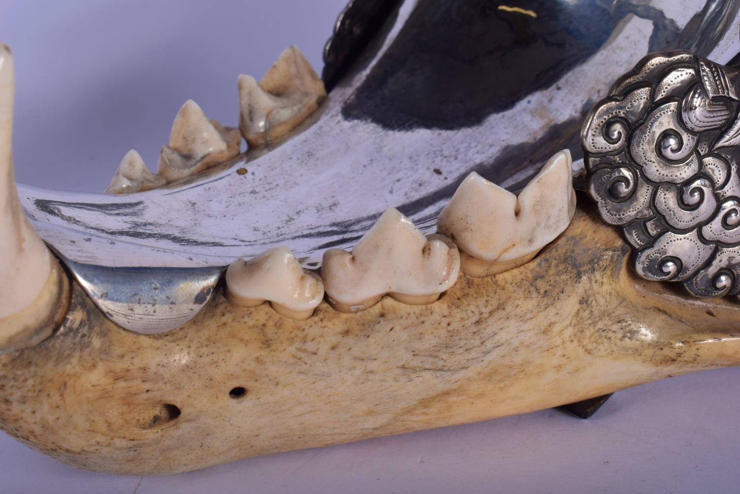 A FINE AND RARE EARLY 20TH CENTURY SILVER MOUNTED MIDDLE EASTER TIGER SKULL probably Thai, formed as a smoking compendium, with intact teeth. 30 cm x 20 cm. Note: During the early party of the 20th century, it was a rare occurrence for Military personnel and hunters to form there trophies as smokers compendiums, for use within library's of officers quarters.