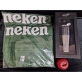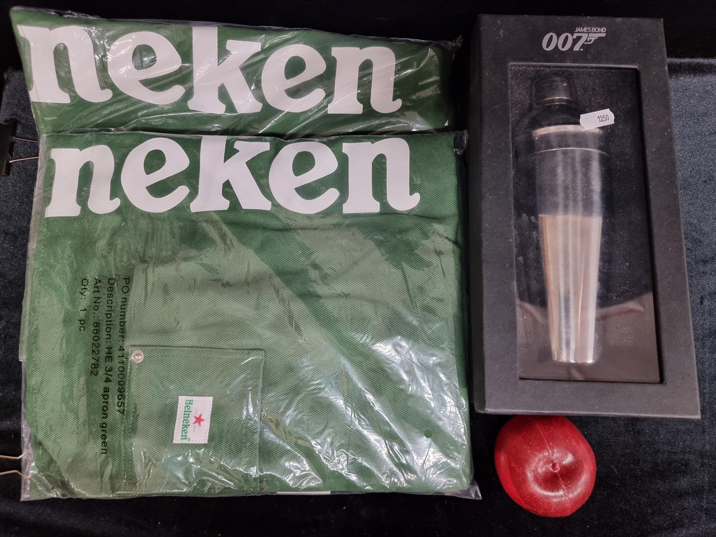 Three items consisting of a boxed James Bond 007 vesper martini cocktail shaker and two Heineken branded 3/4 length aprons.