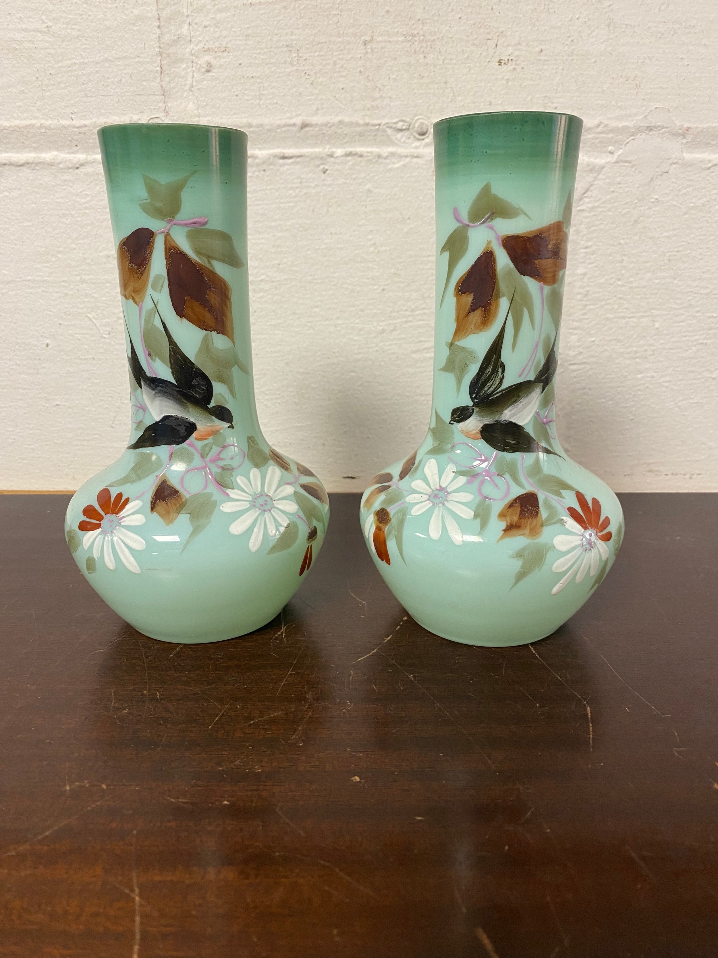 A pair of Edwardian enamelled glass vases -