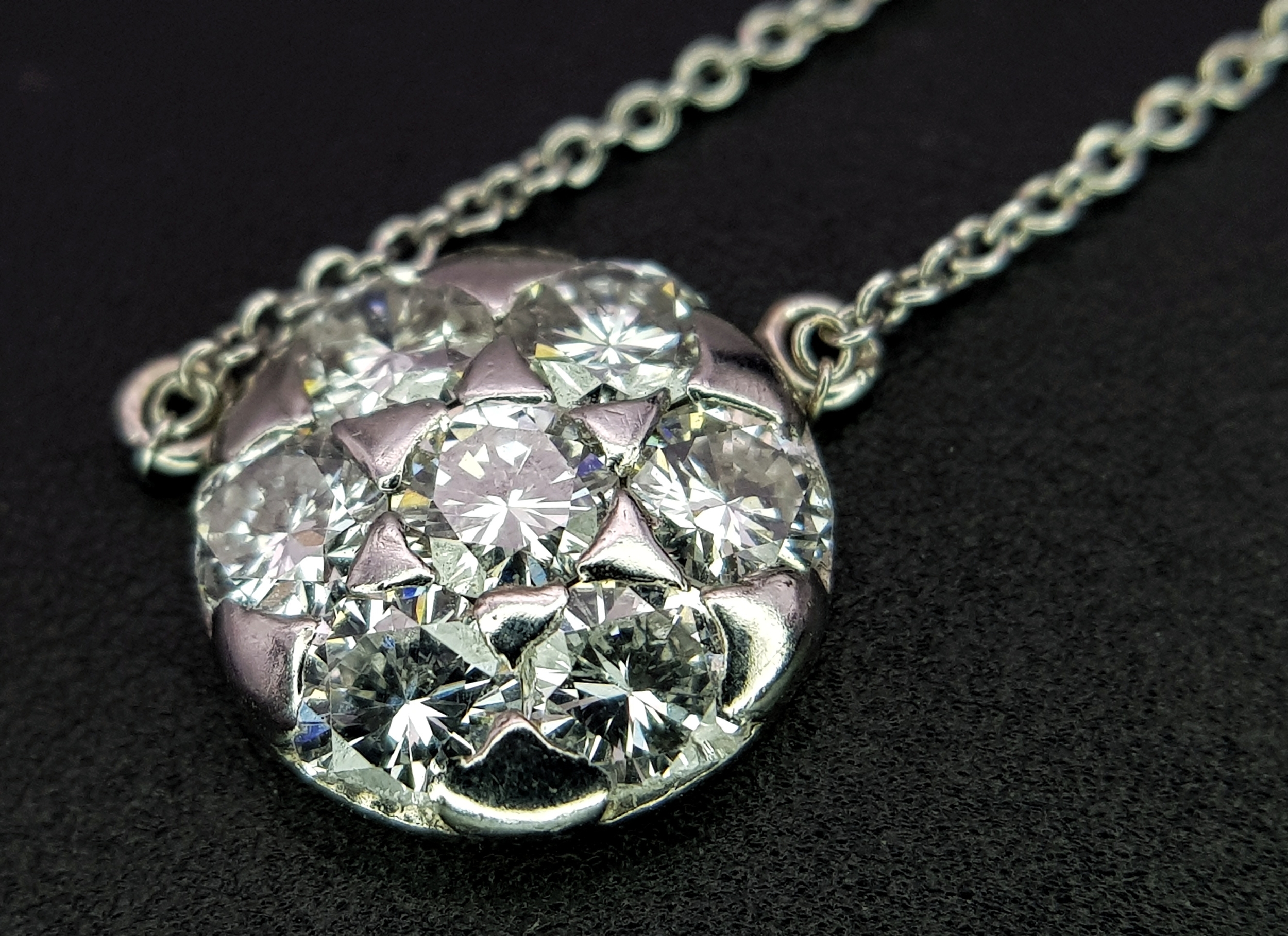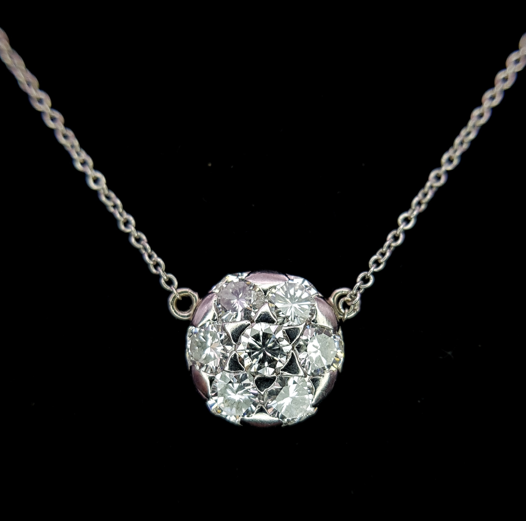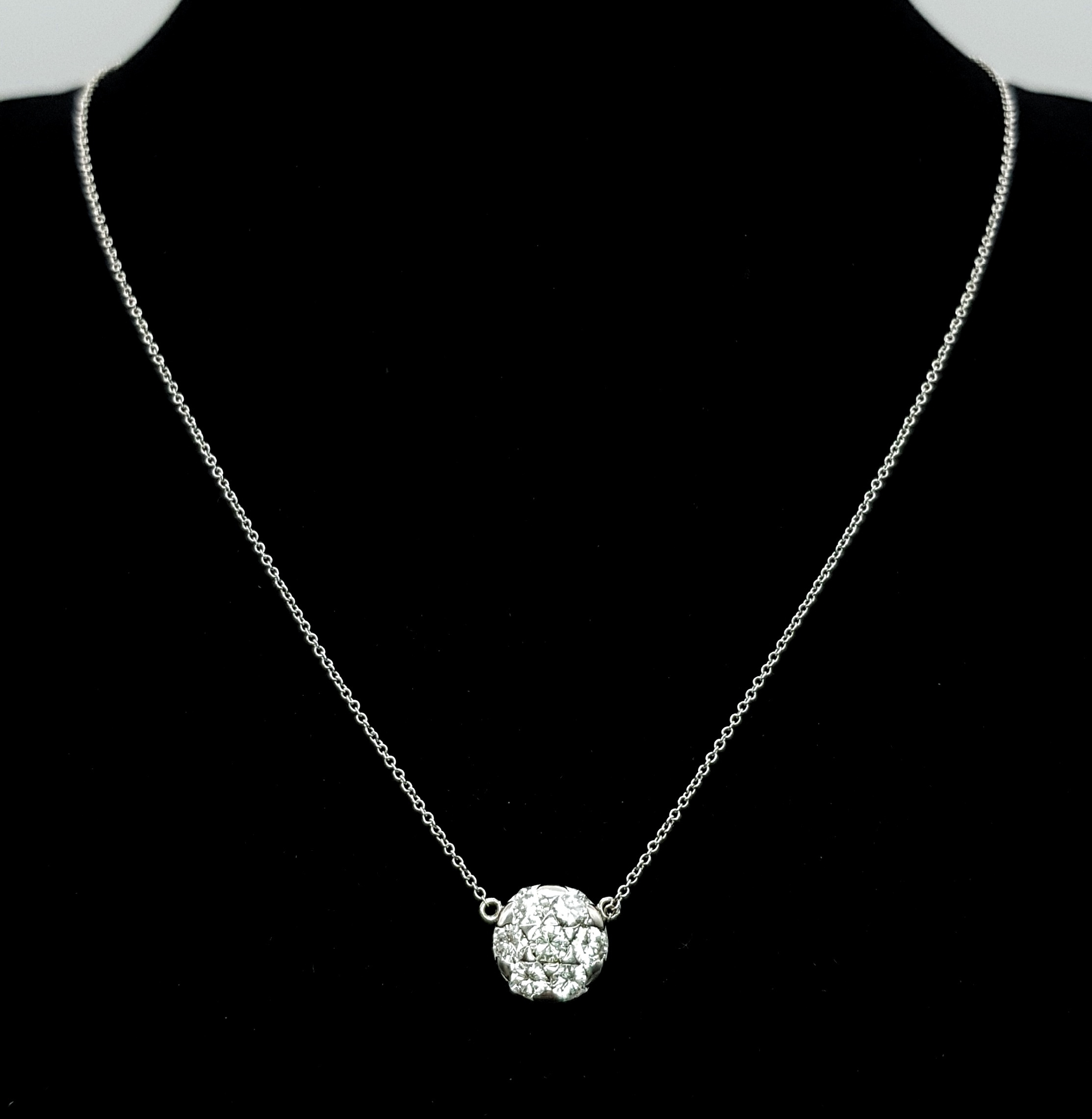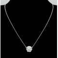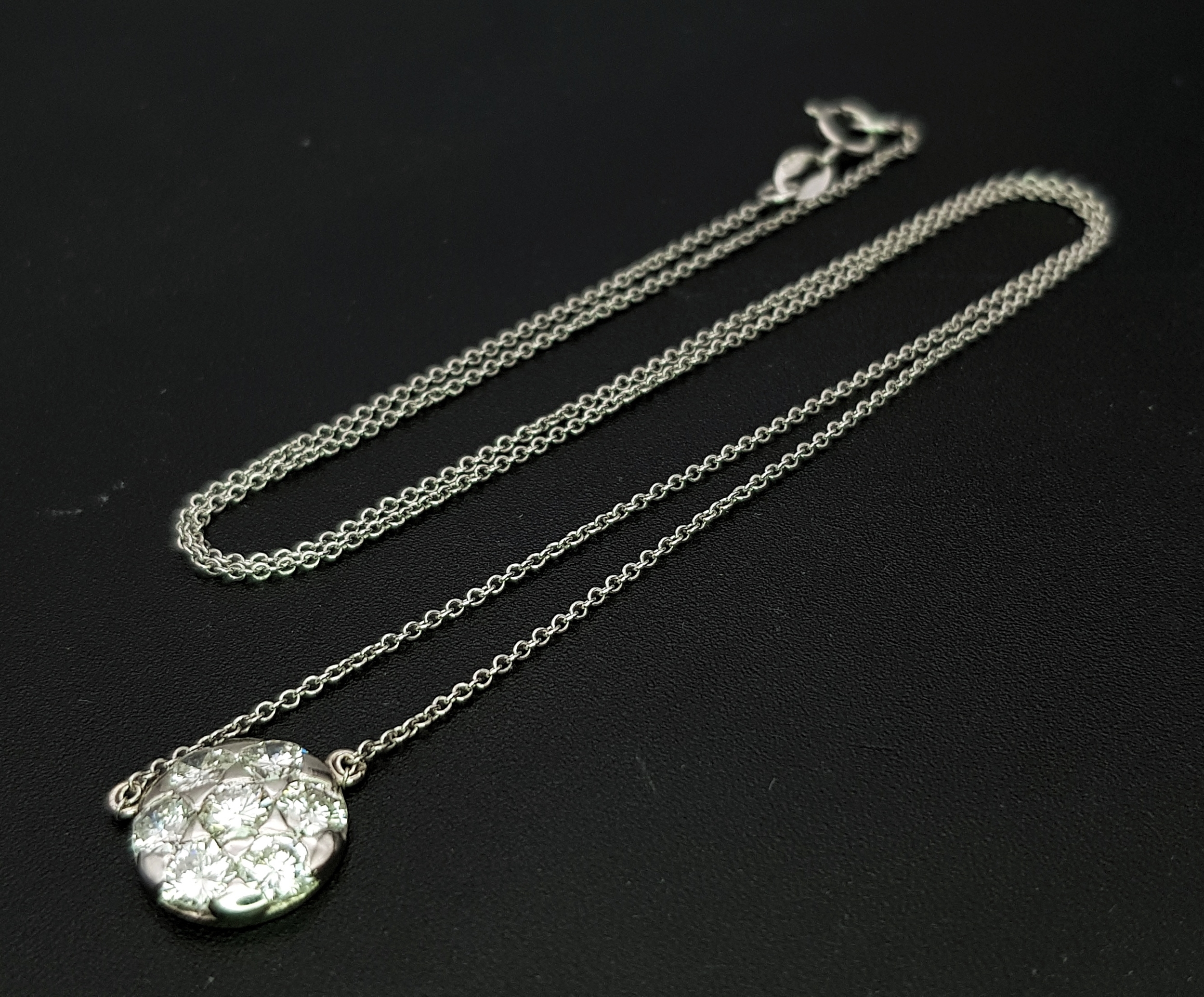 An 18K White Gold and Diamond Circular Lavaliere Pendant on an 18K White Gold Chain. c 1.2ctw of round brilliant cut diamonds having G-H colour with VS2 clarity. 11mm diameter pendant. 42cm chain. 2.8g total weight. MT36.