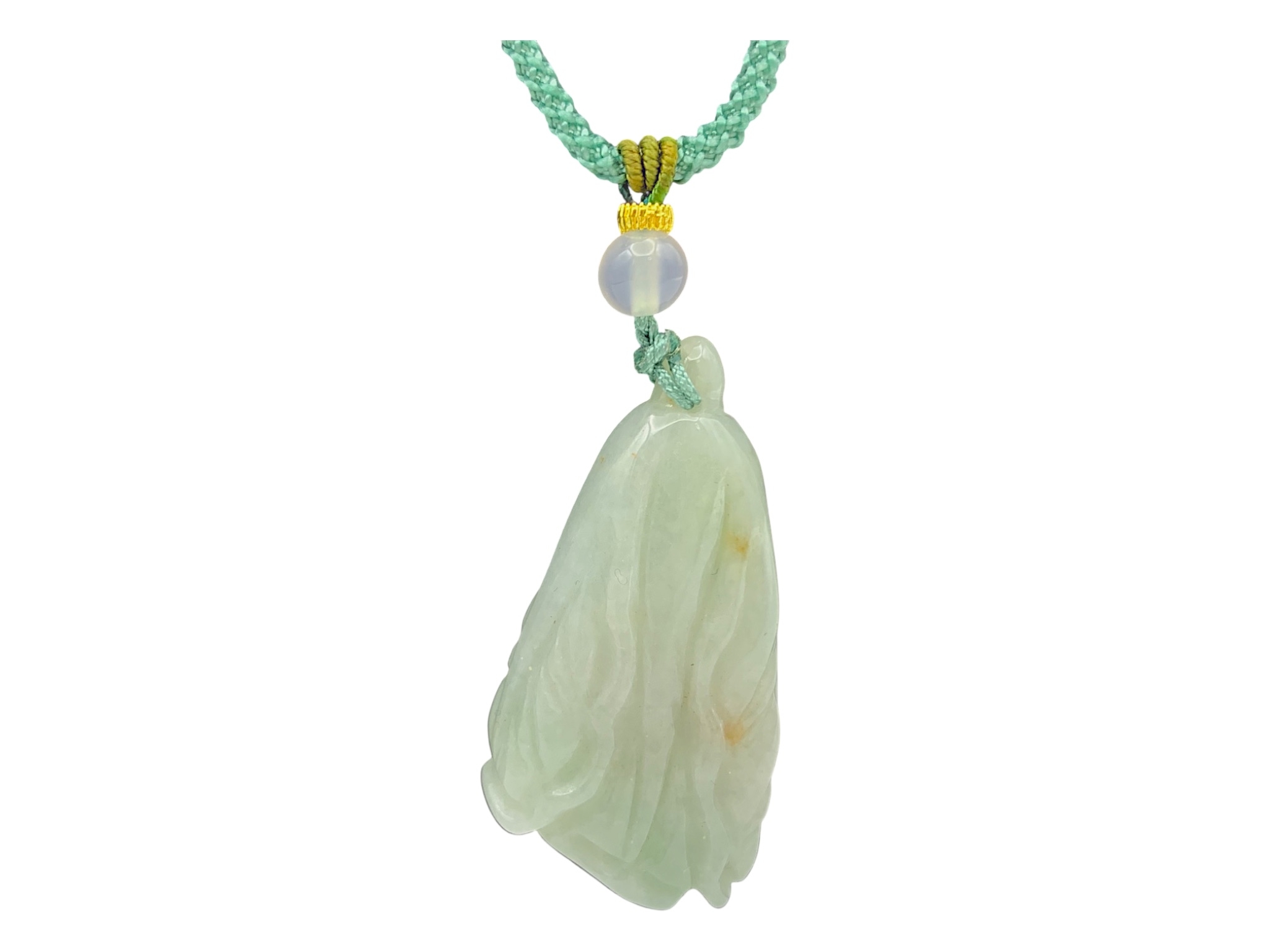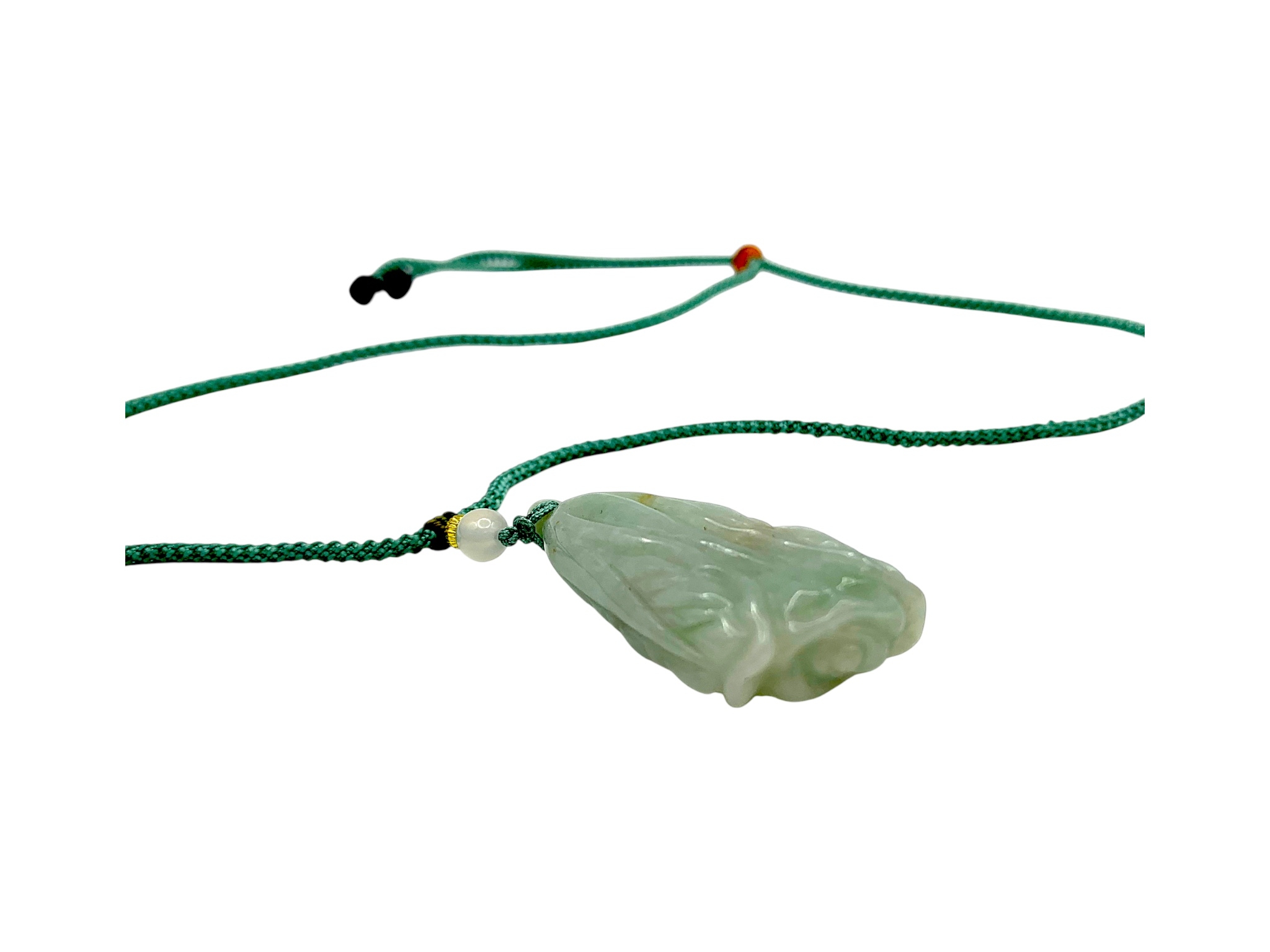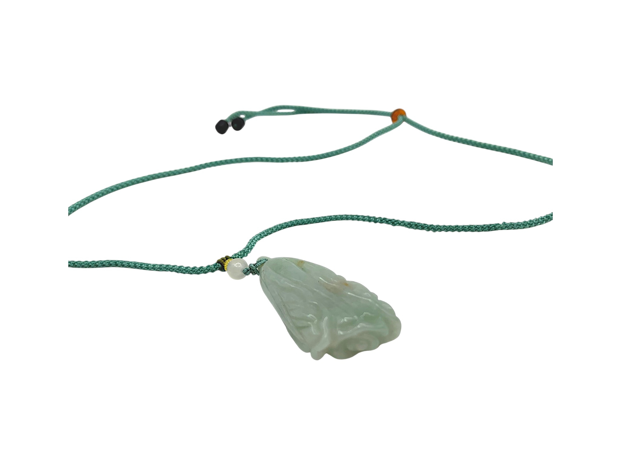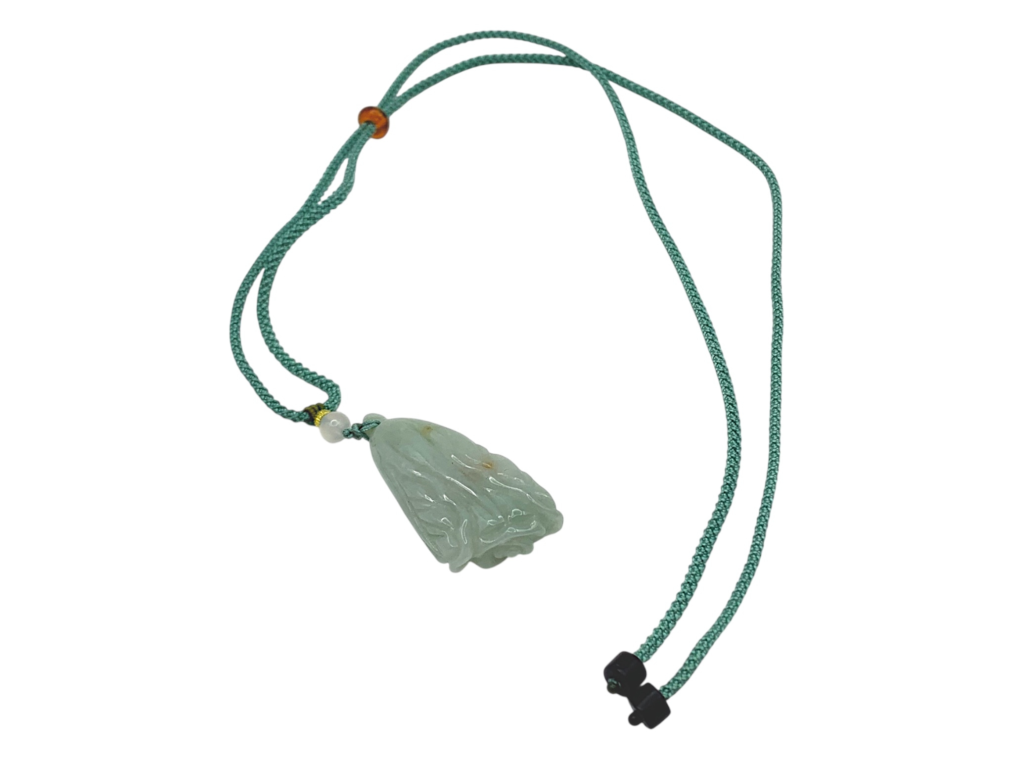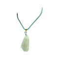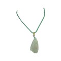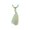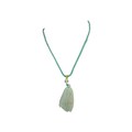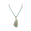 A Jade Pendant Necklace. The celadon-green jade pendant finely carved in a flowing, organic form, suspended from an adjustable cord. Pendant: approx. 4 × 2 cm; max. length: approx. 35 cm; weight: approx. 22 g.