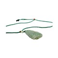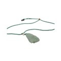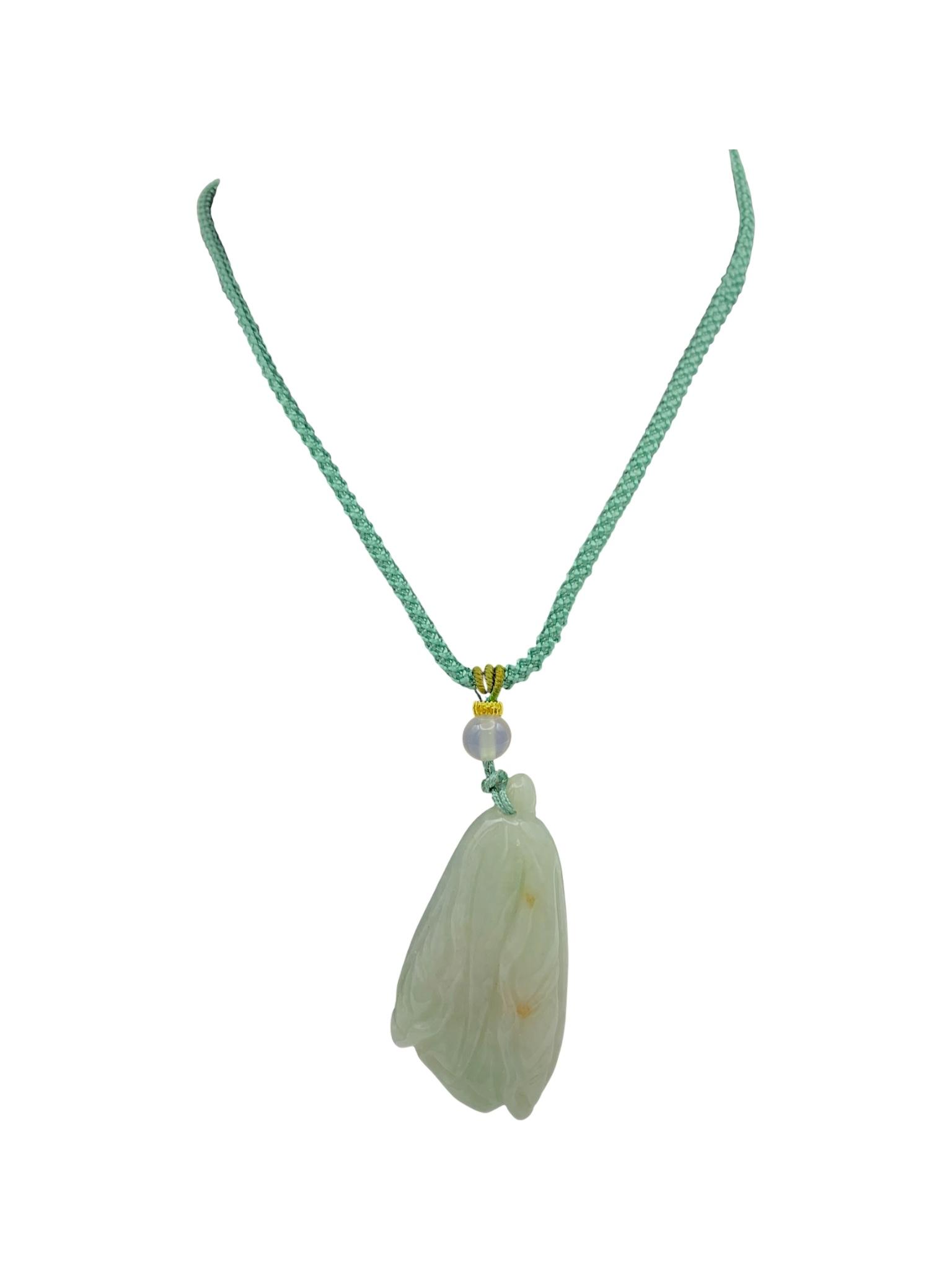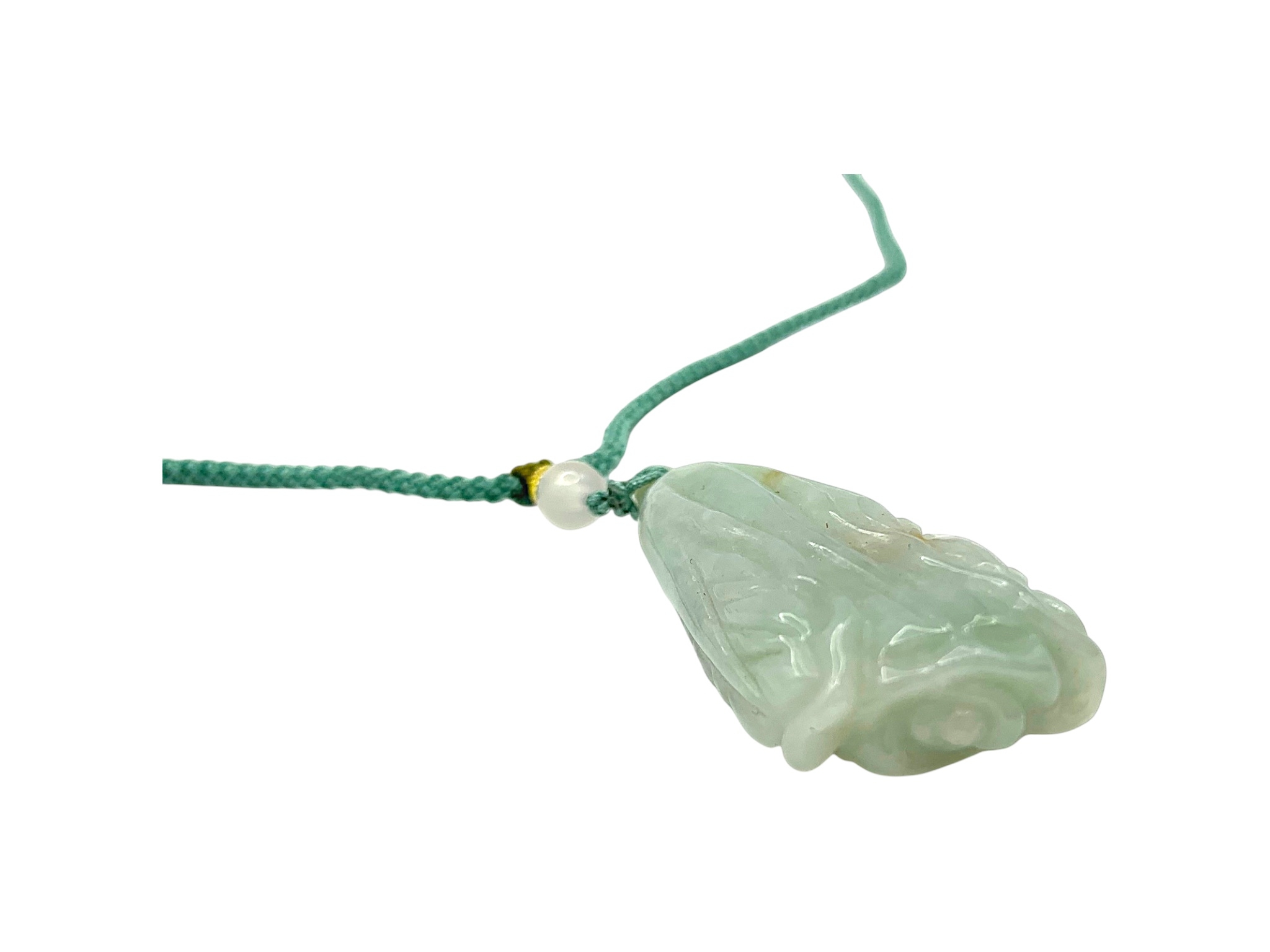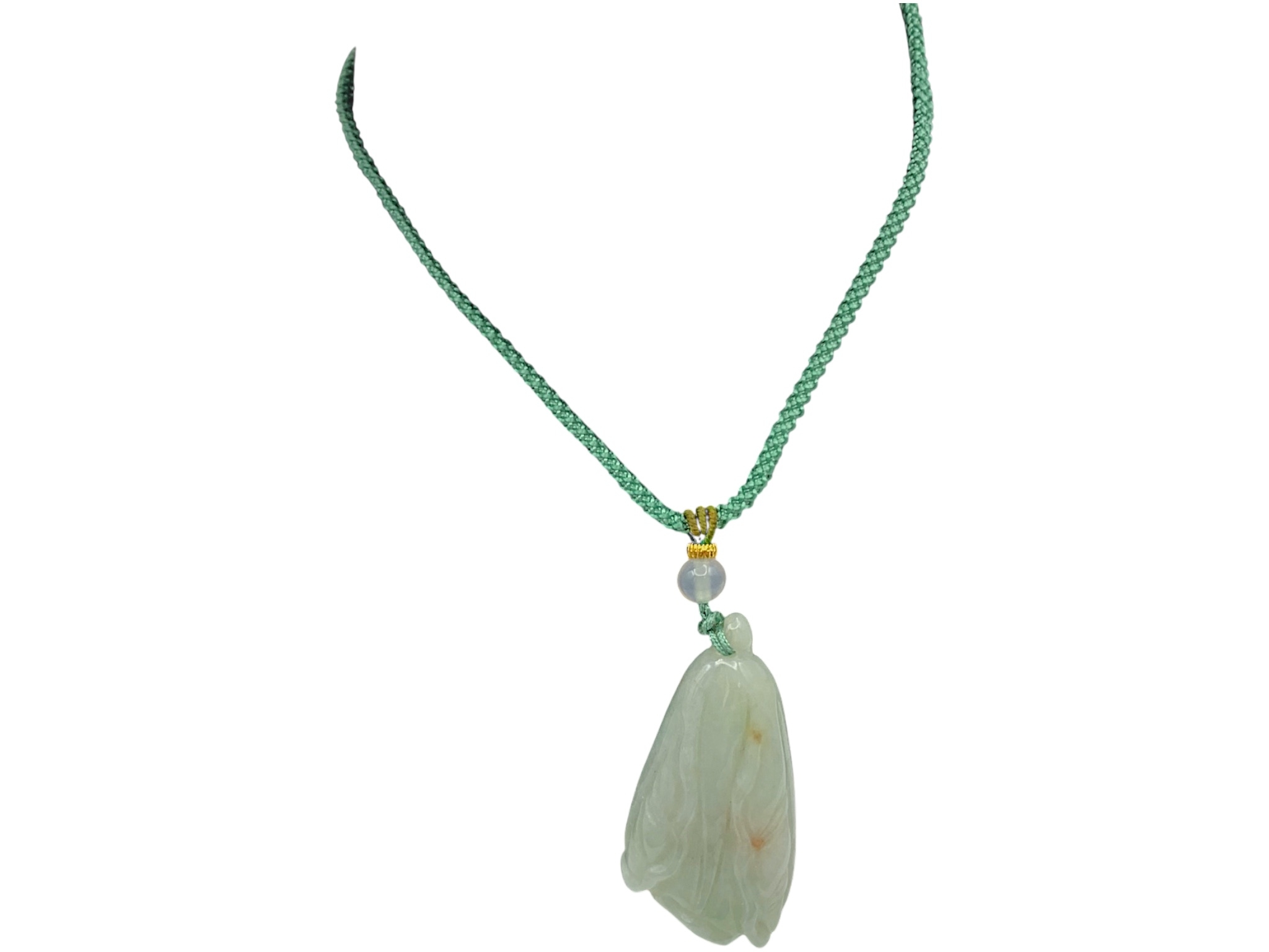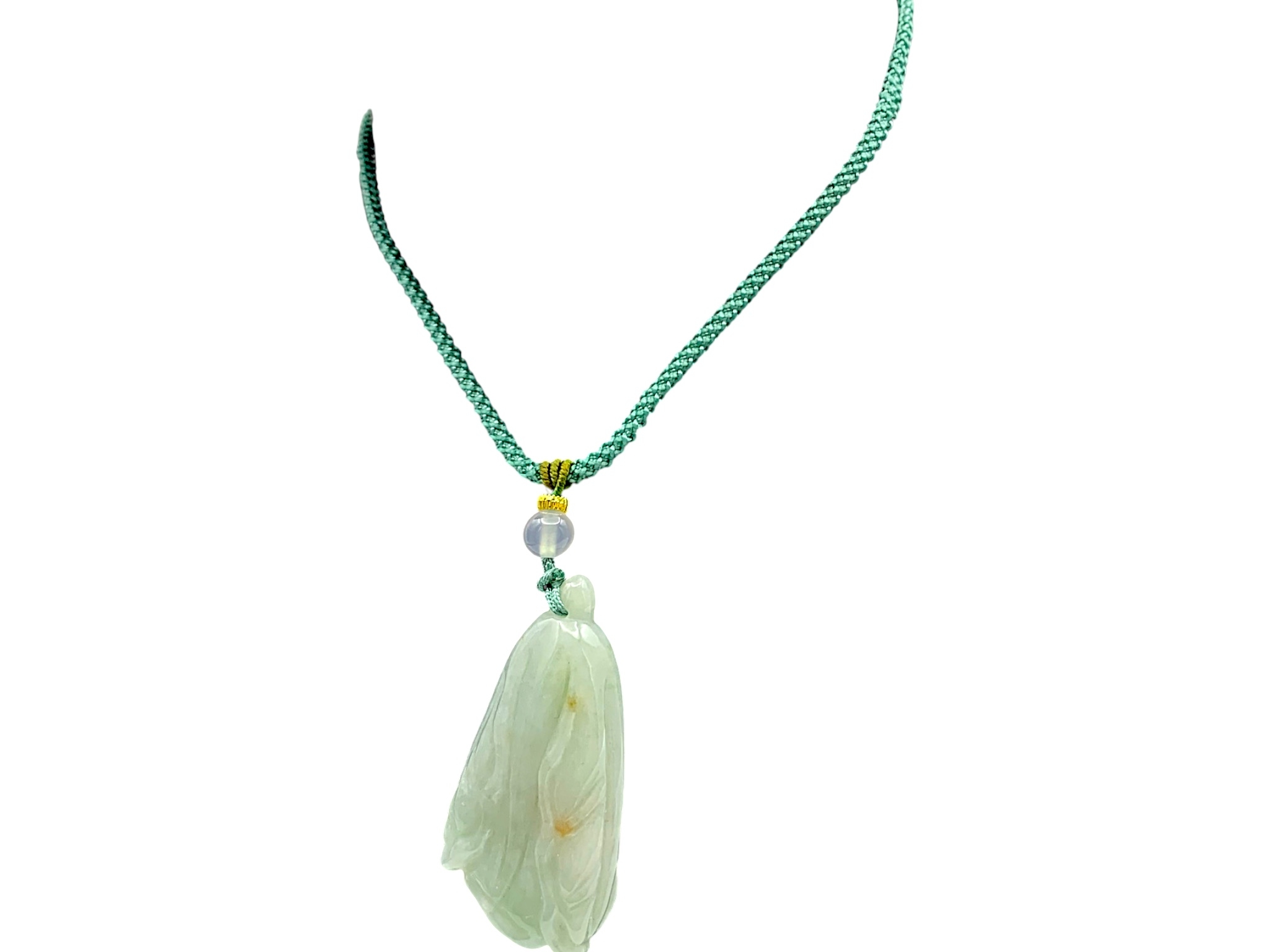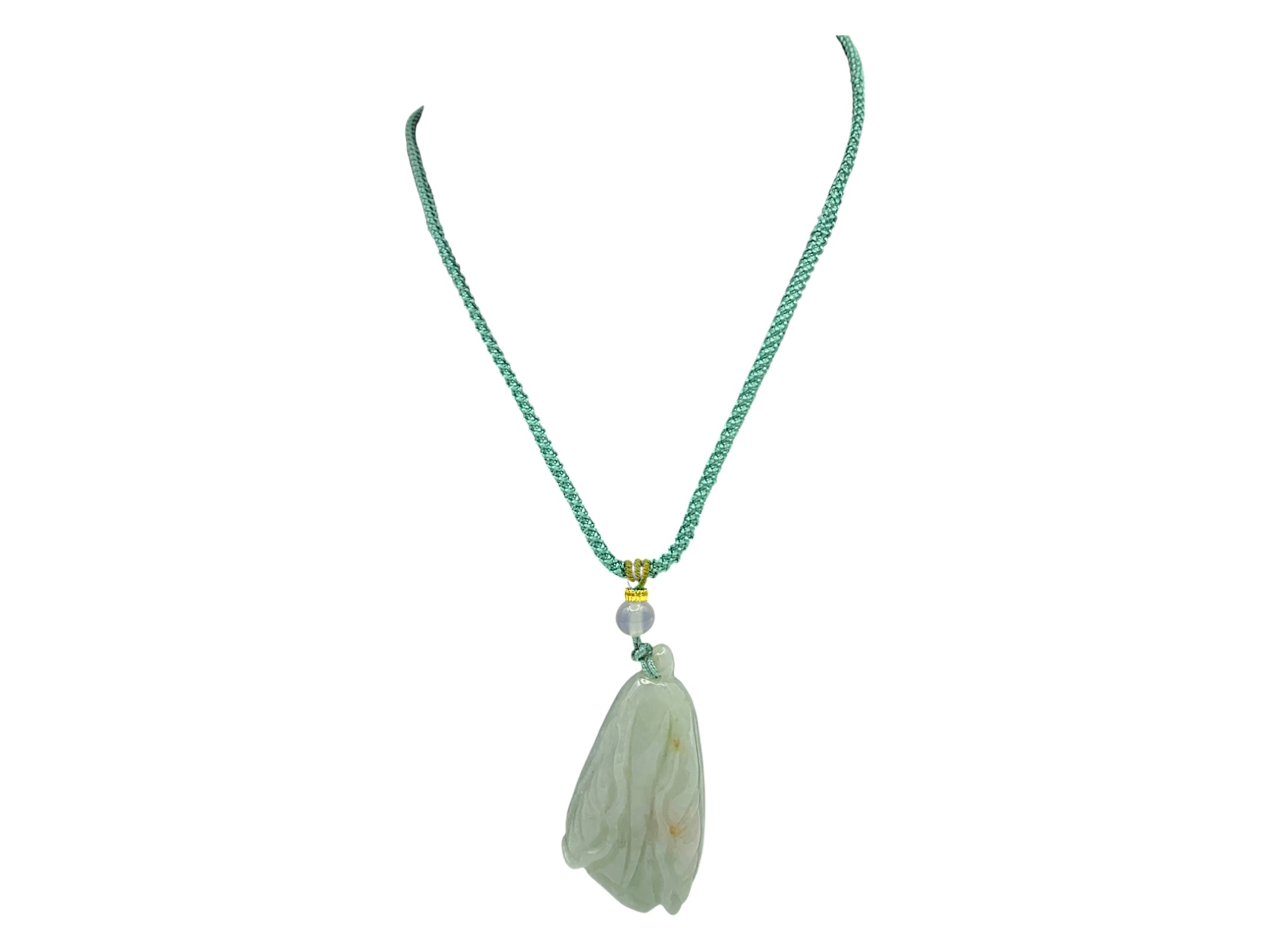 A Jade Pendant Necklace. The celadon-green jade pendant finely carved in a flowing, organic form, suspended from an adjustable cord. Pendant: approx. 4 × 2 cm; max. length: approx. 35 cm; weight: approx. 22 g.