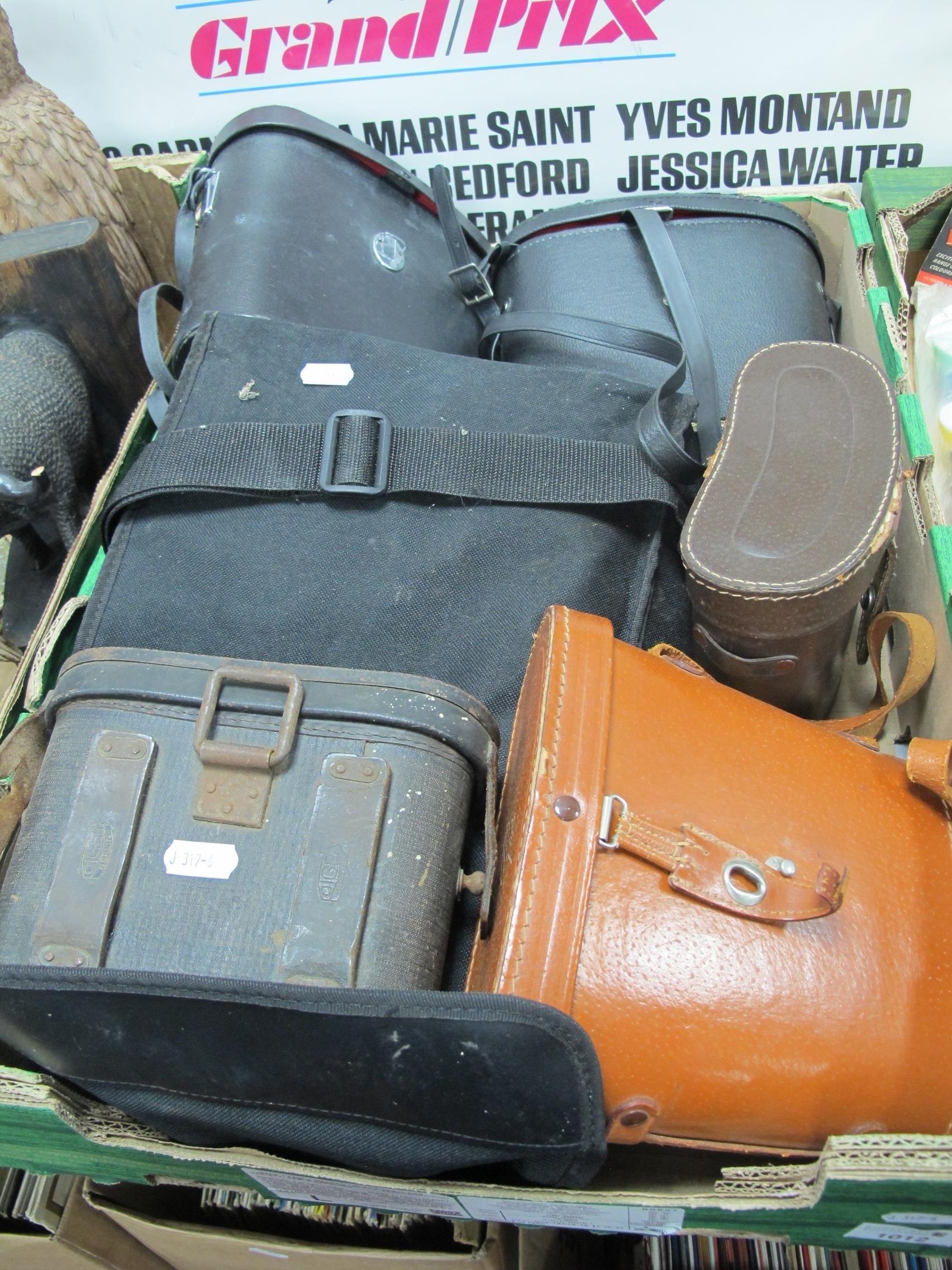 Binoculars, including large Praktica Super Zoom 25-125x80, antique WWI era French example, Philo 8x40, Pathescope 10x50, Boots 8x30 etc, all cased. One box. [578136]