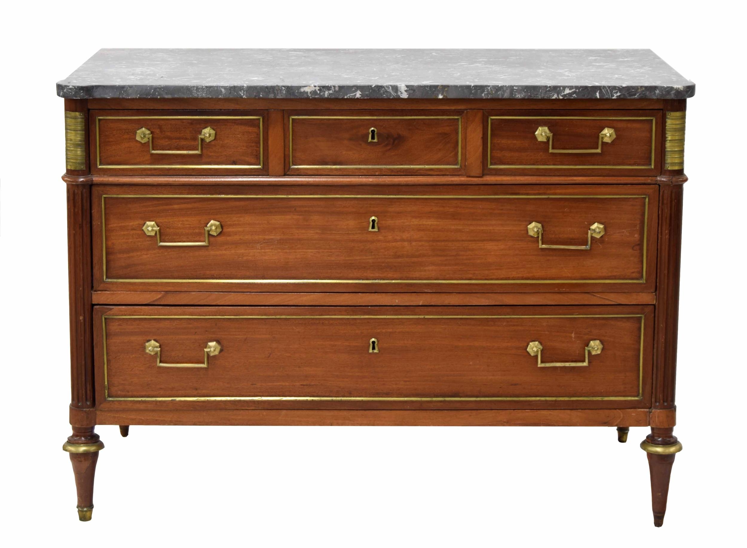 French marble top chest of three graduated drawers, 46" wide, 22.5"deep, 33.5" high