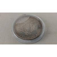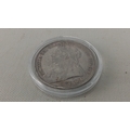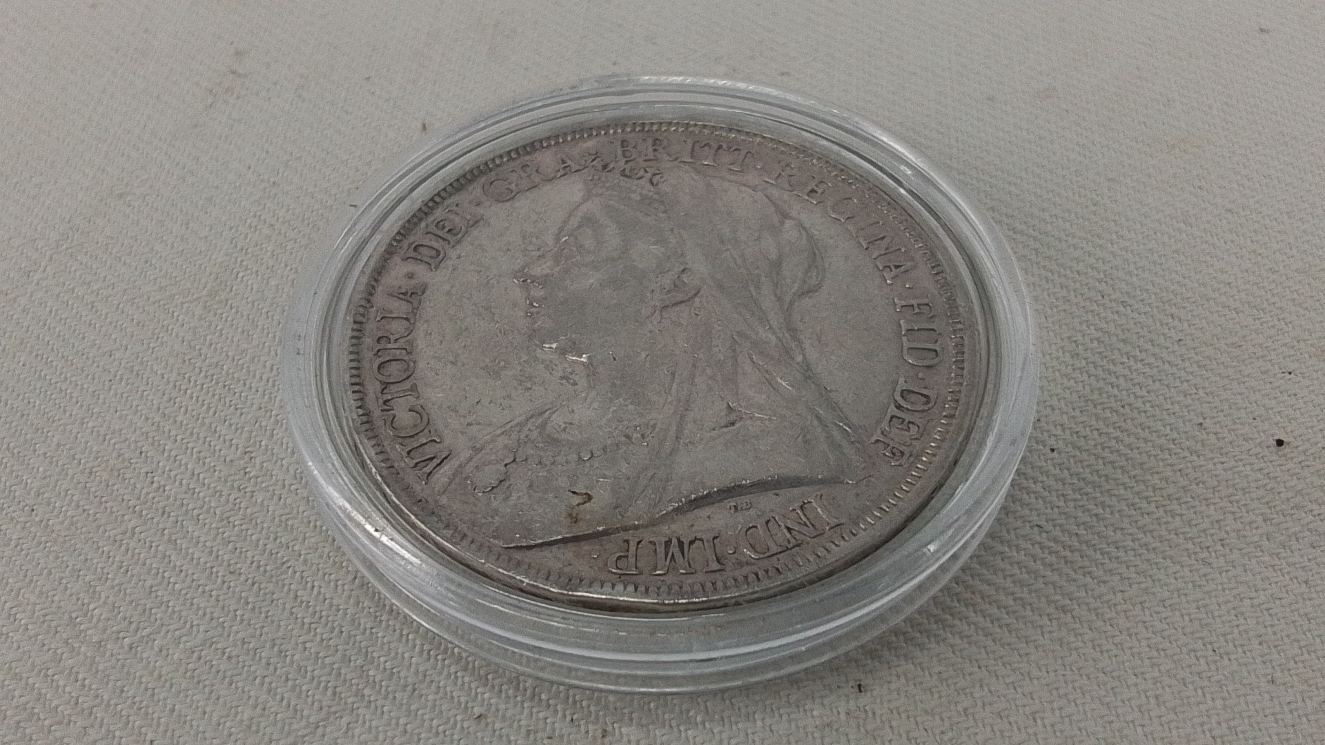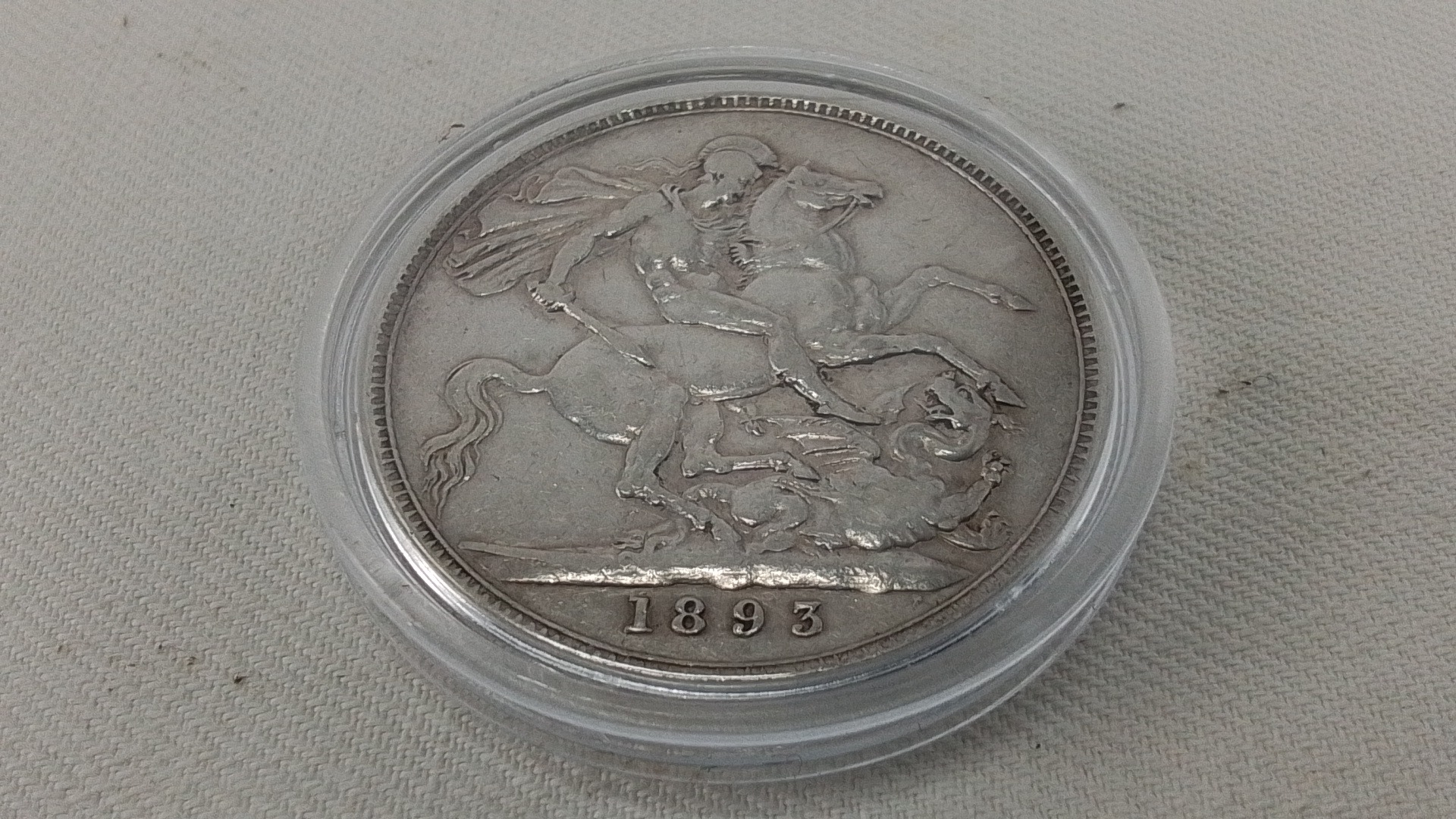 One Victorian silver crown coin, dated 1893, obverse with veiled bust of Queen Victoria inscribed “VICTORIA DEI GRATIA BRITT REGINA FID DEF” and reverse with St George and the Dragon, in a protective capsule.