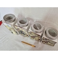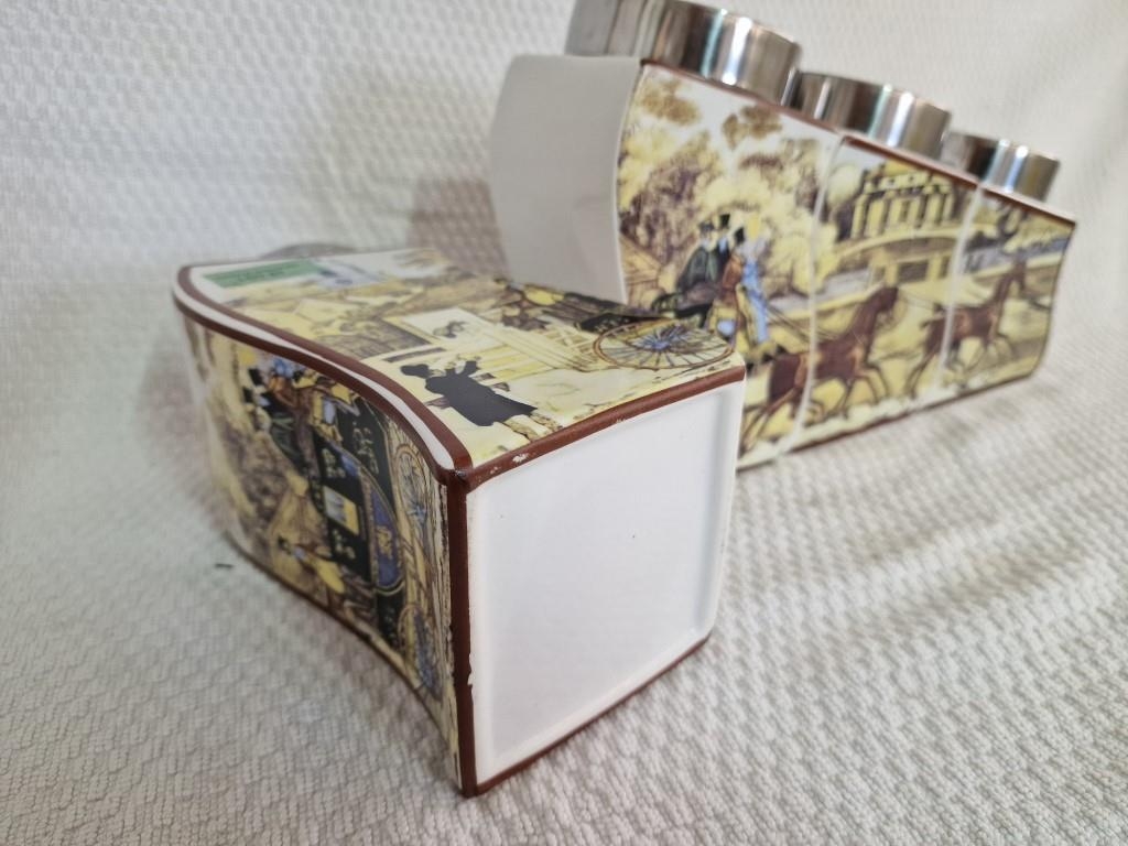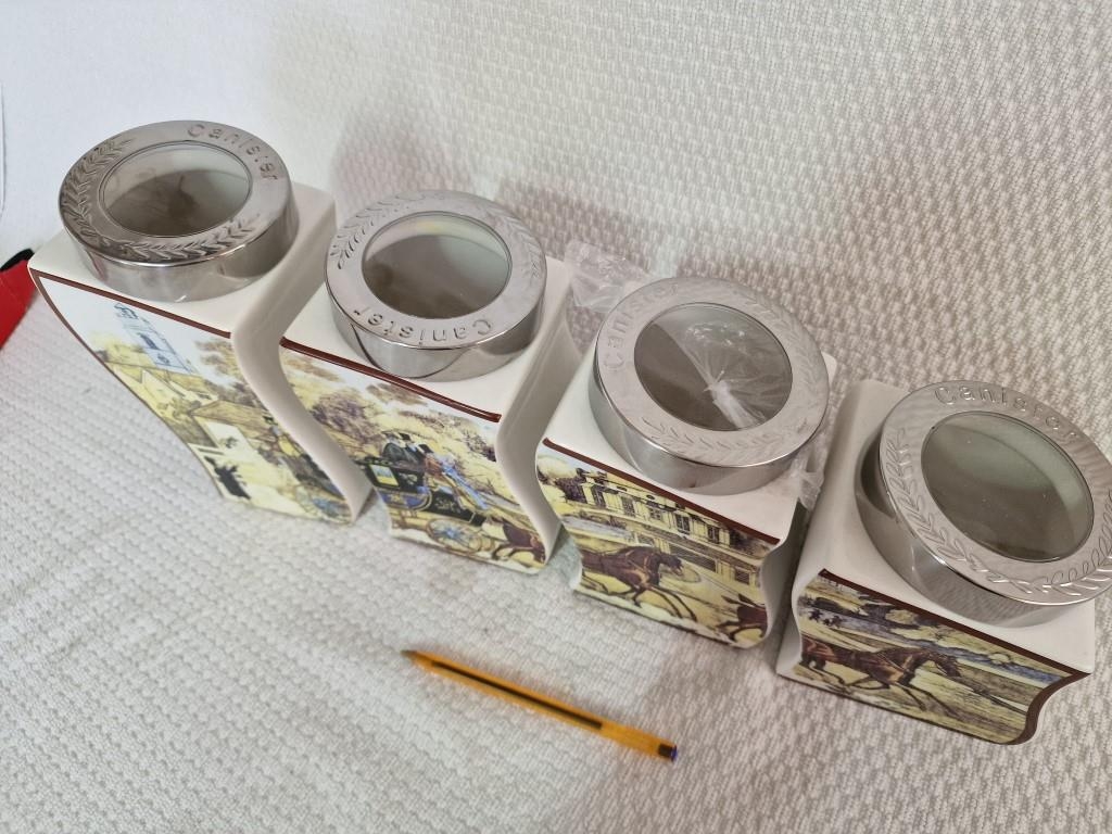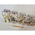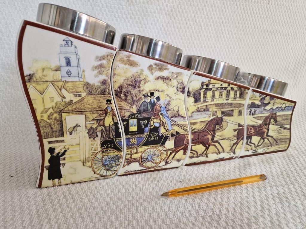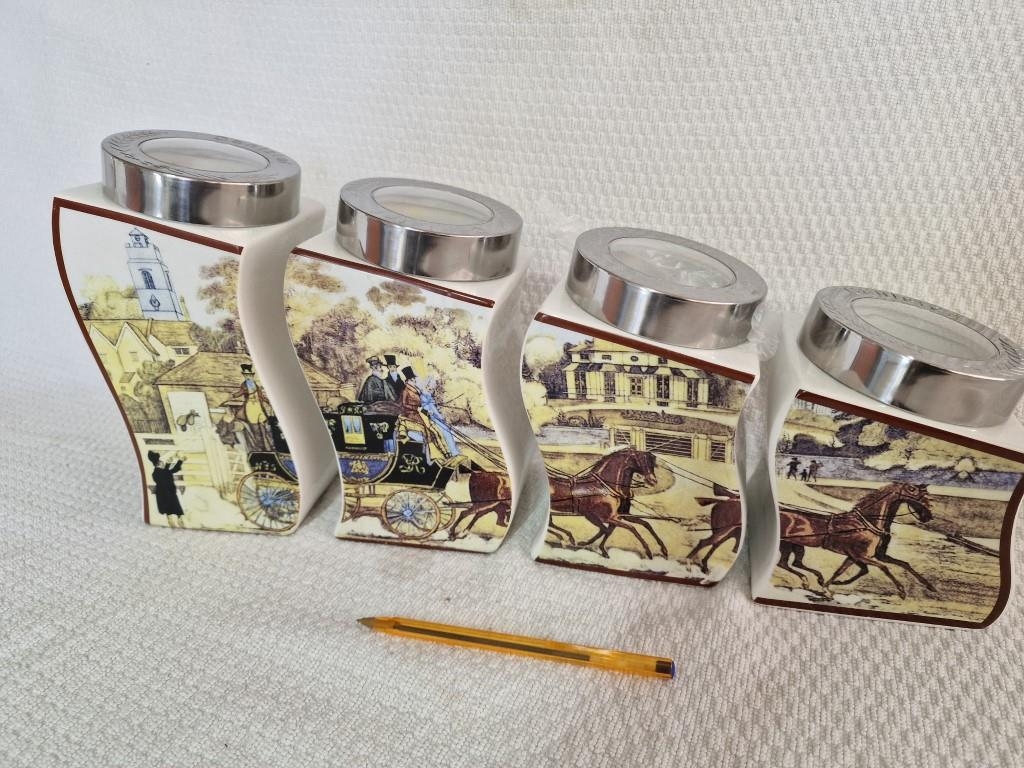 Graduating Set of 4 x Interlocking Lidded Kitchen Storage Jars with Victorian Coach Scene Decoration, (4)