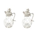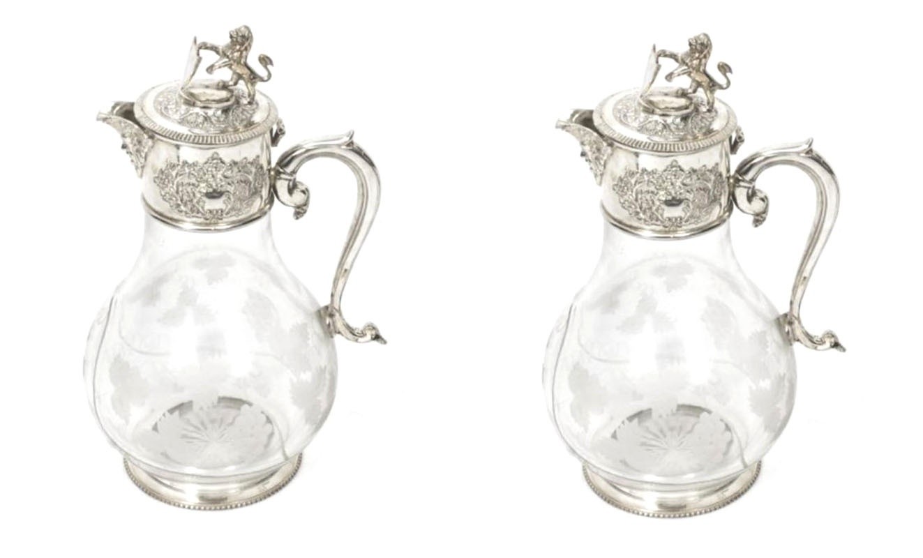 A PAIR OF SILVER PLATED ETCHED GLASS CLARET JUGS, Decorated with a lion holding a shield, Dionysus on lid and etched grape vines on glass.