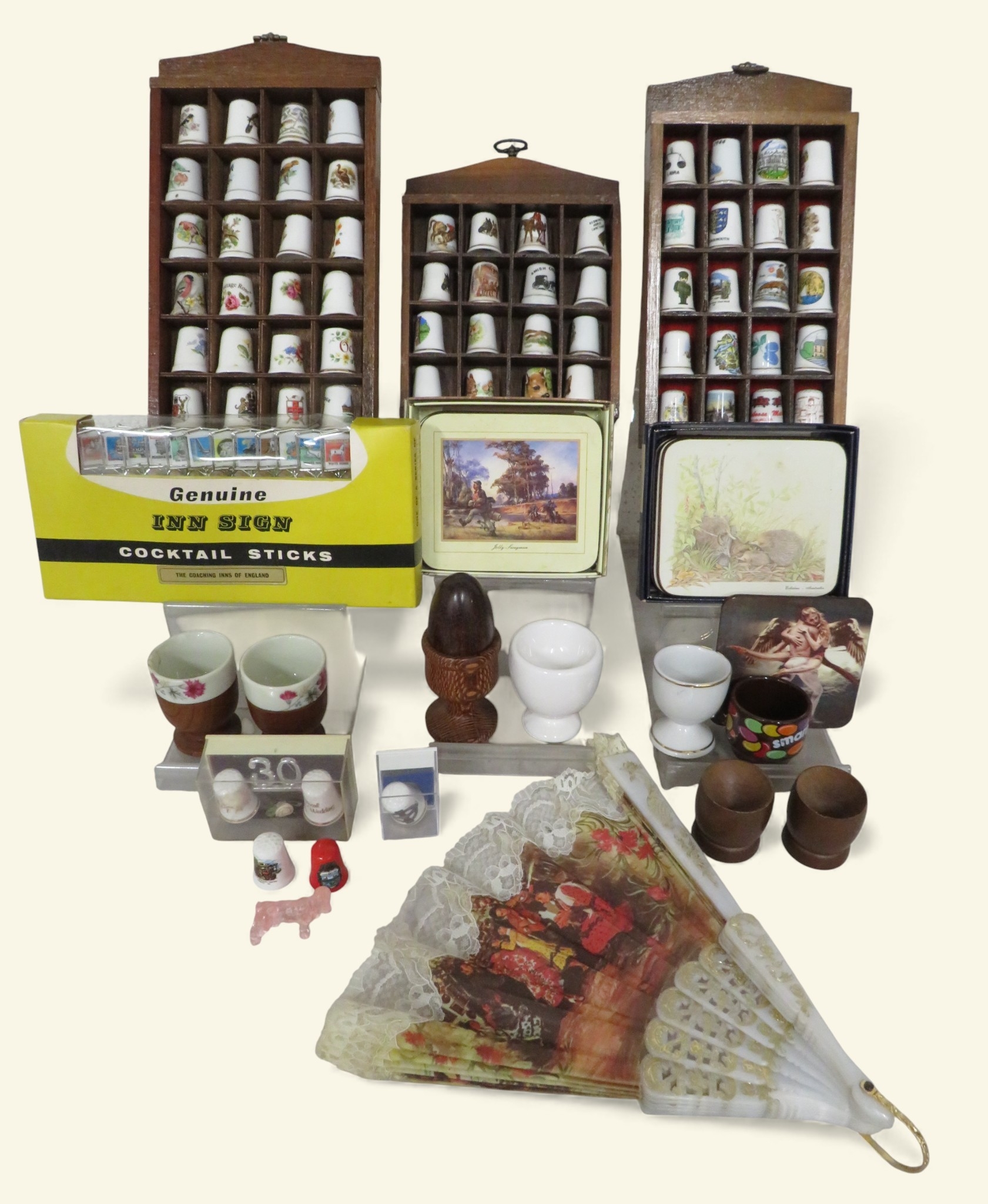 Collection of collectables including thimbles, coasters and novelty items. Mixed lot comprising three wooden wall-mounted display racks filled with approximately 60+ souvenir thimbles showing various locations, landmarks, and decorative designs (predominantly china and porcelain examples), set of boxed Inn Sign cocktail sticks or bar accessories showing miniature pub signs, pair of decorative coaster sets in presentation tins showing John Constable painting The Hay Wain and wildlife or rabbit subjects, boxed set of egg cups including examples with floral decoration and gilt trim, carved wooden acorn-form container, pair of wooden or treen salt and pepper shakers, boxed novelty items, table mats or placemats with period illustrations, plus additional small collectables. Predominantly modern souvenir and novelty items suitable for collectors or car boot sale.