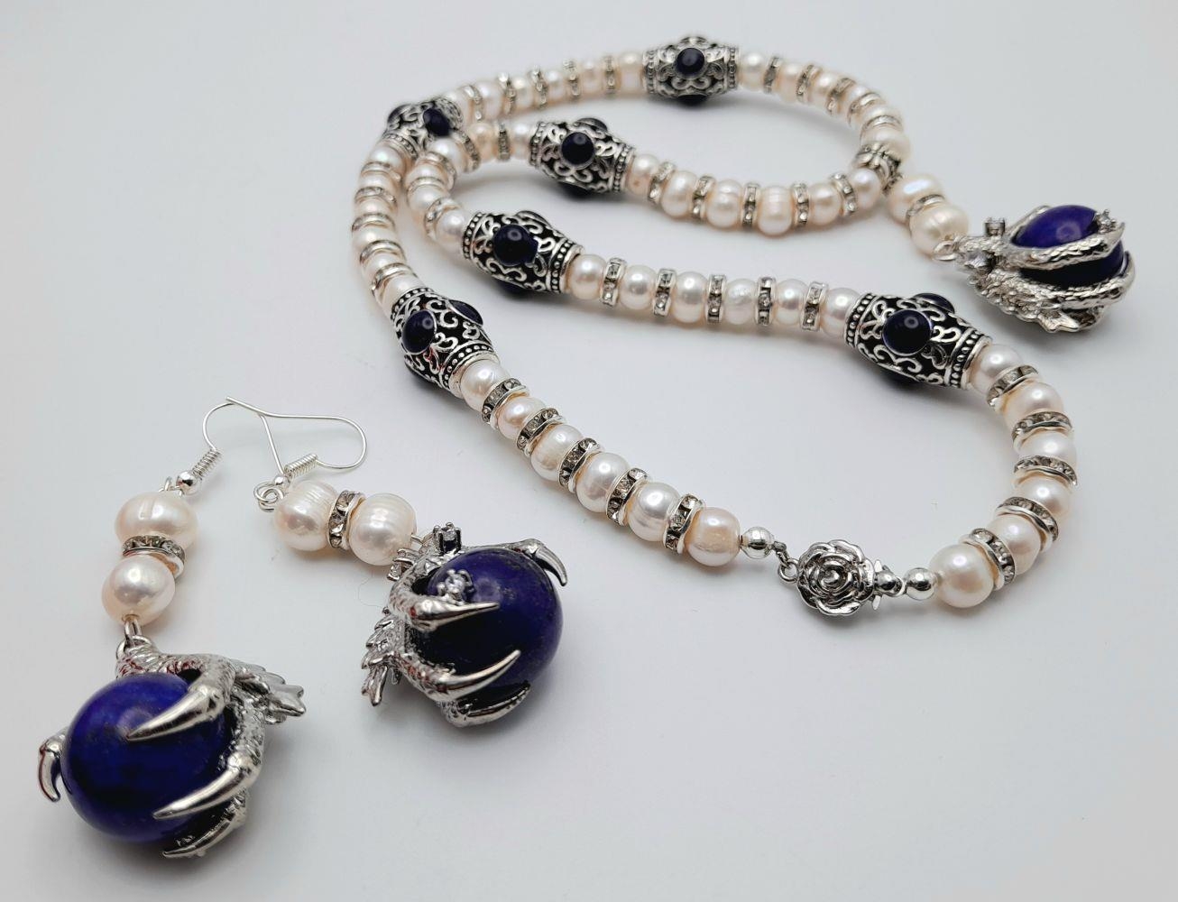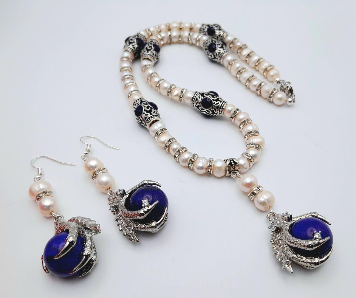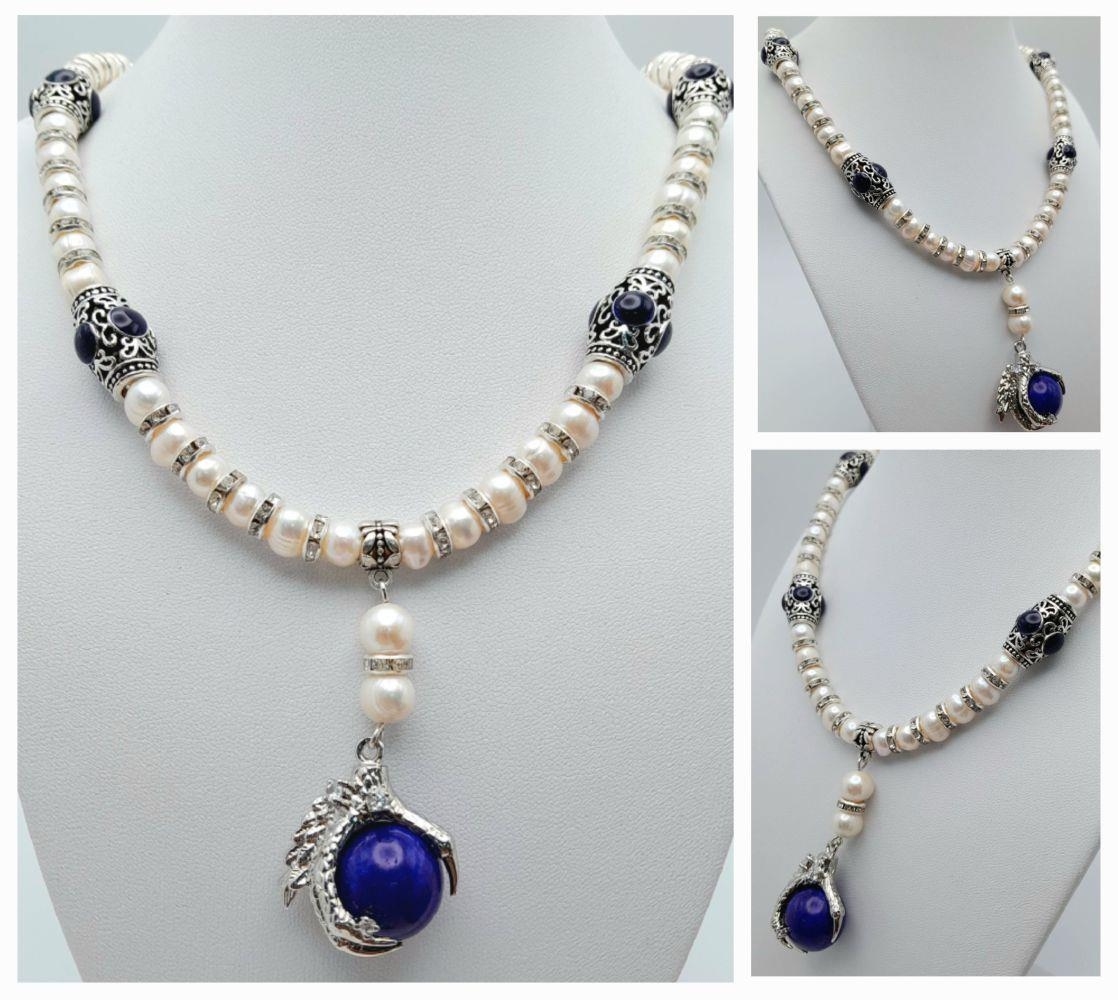 A very glamorous natural cultured white pearls with cubic zirconia necklace adorned with eagle claws holding lapis