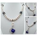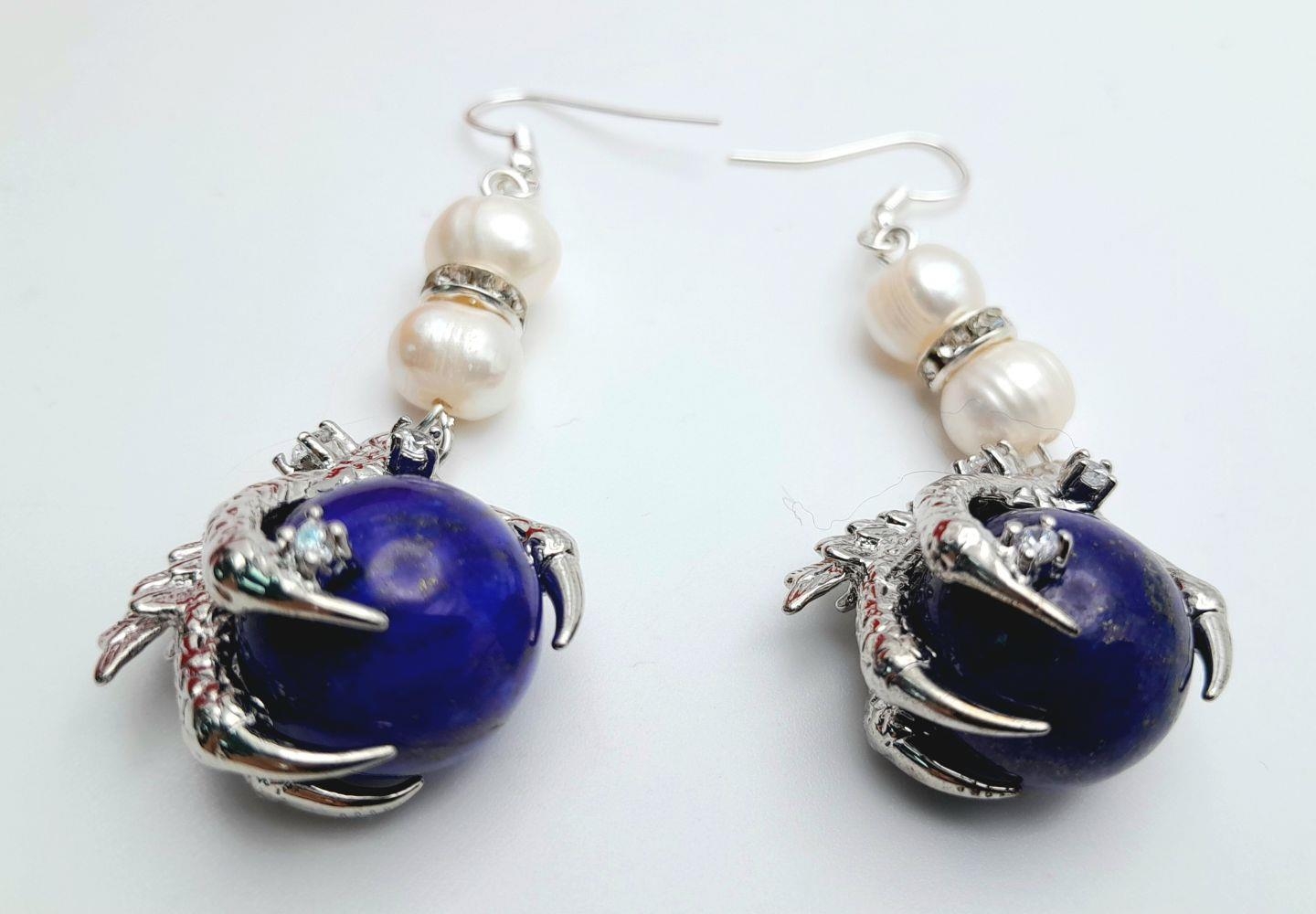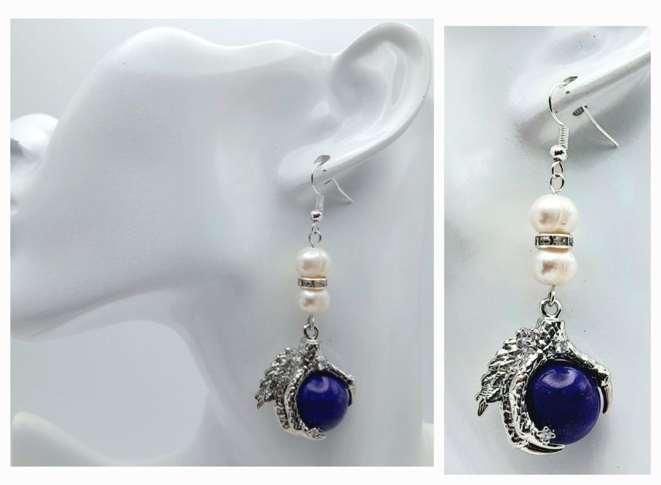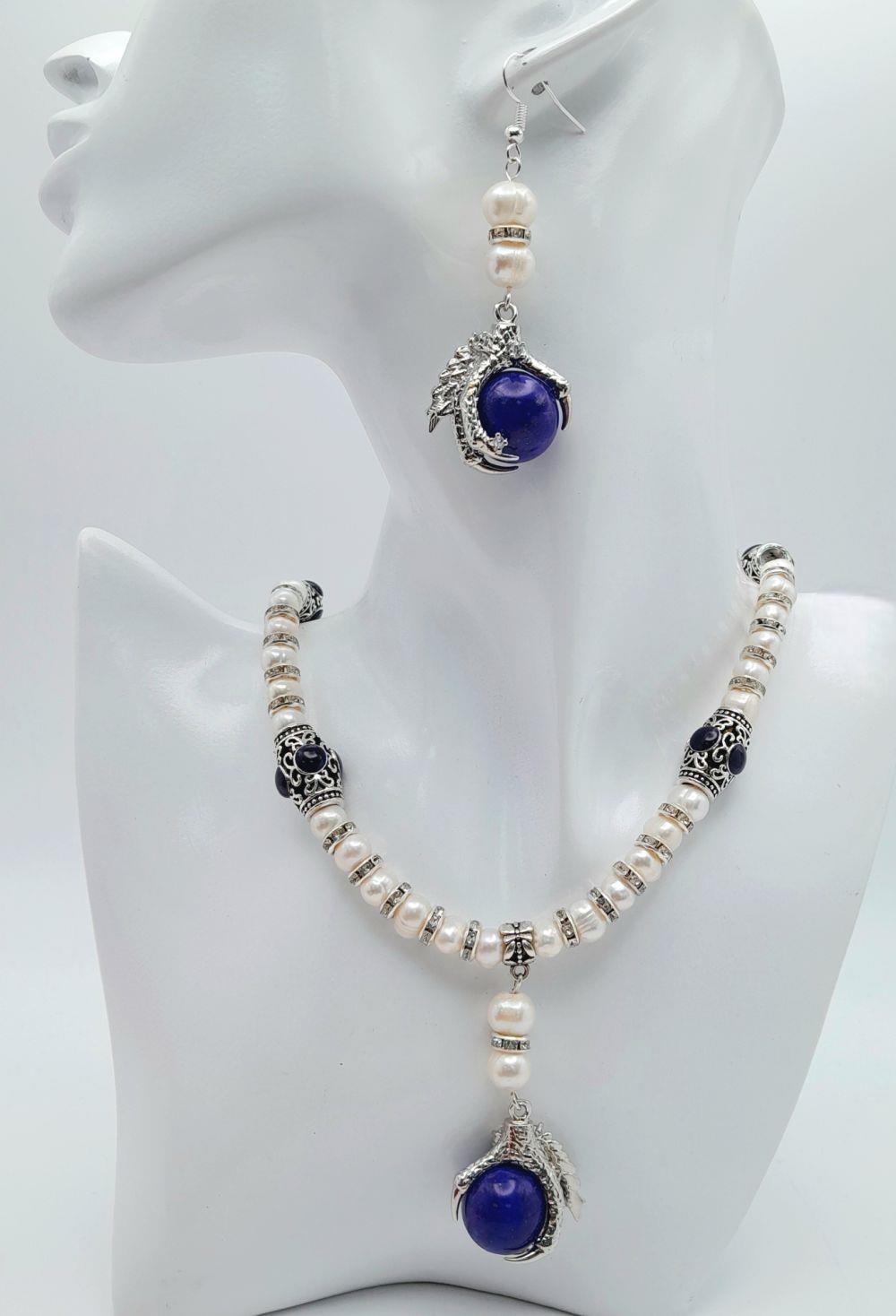 A very glamorous natural cultured white pearls with cubic zirconia necklace adorned with eagle claws holding lapis