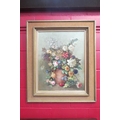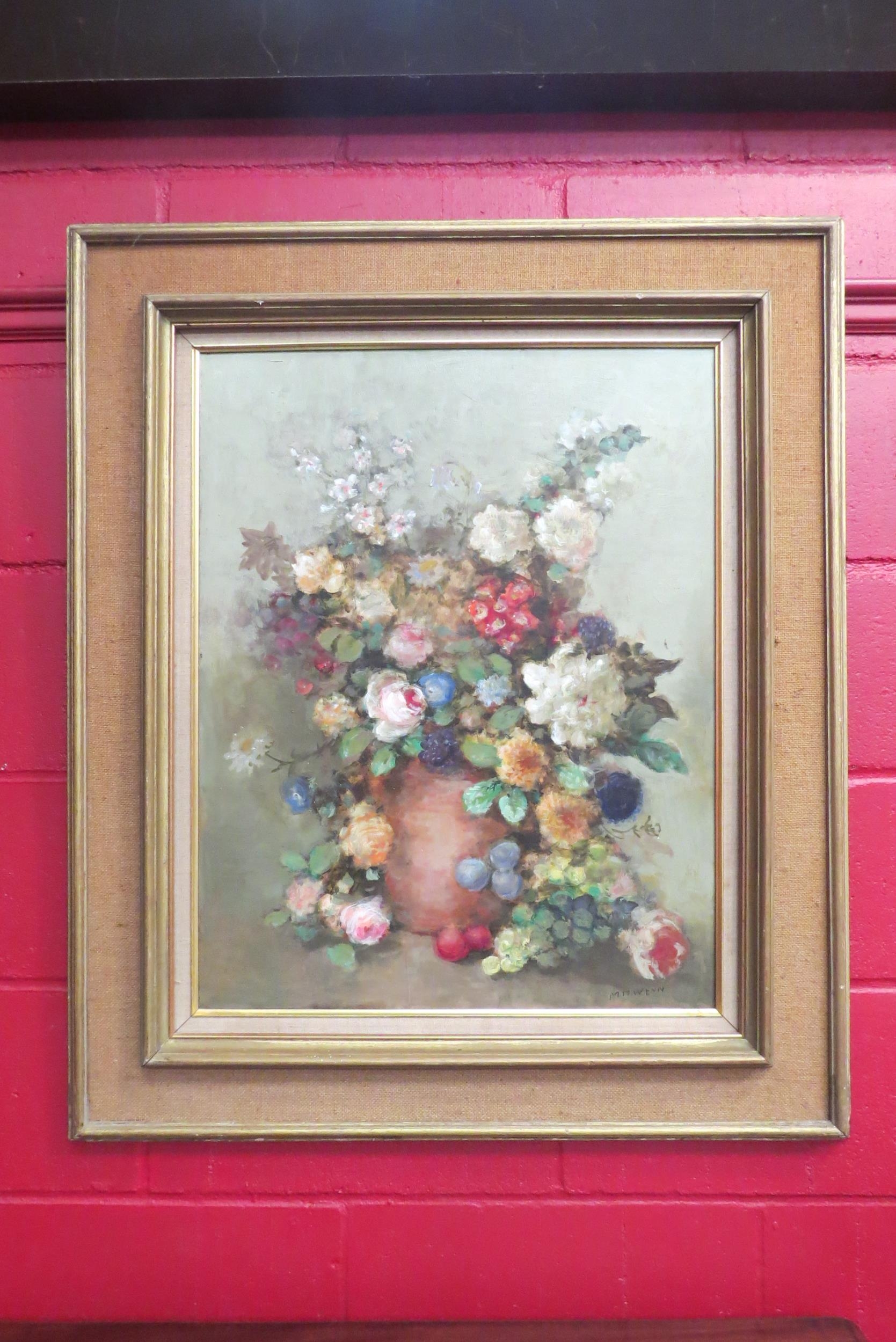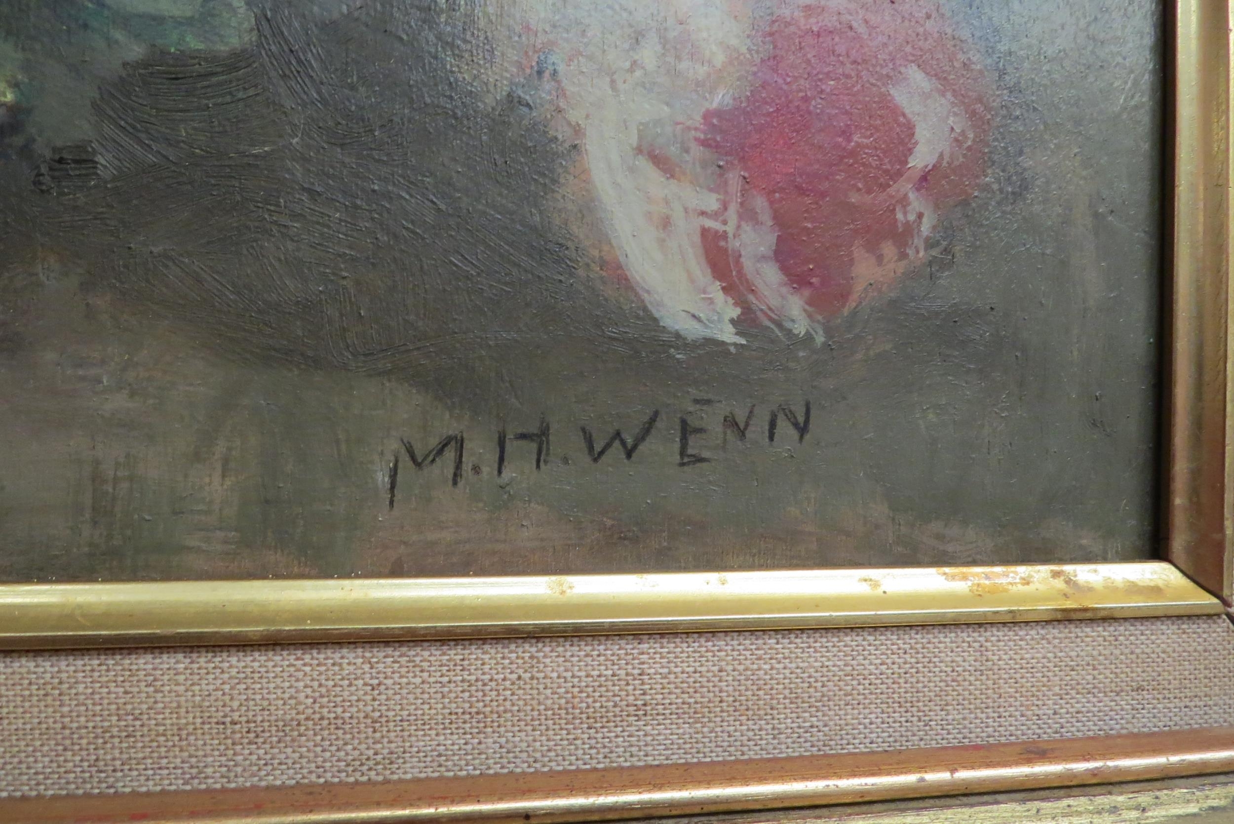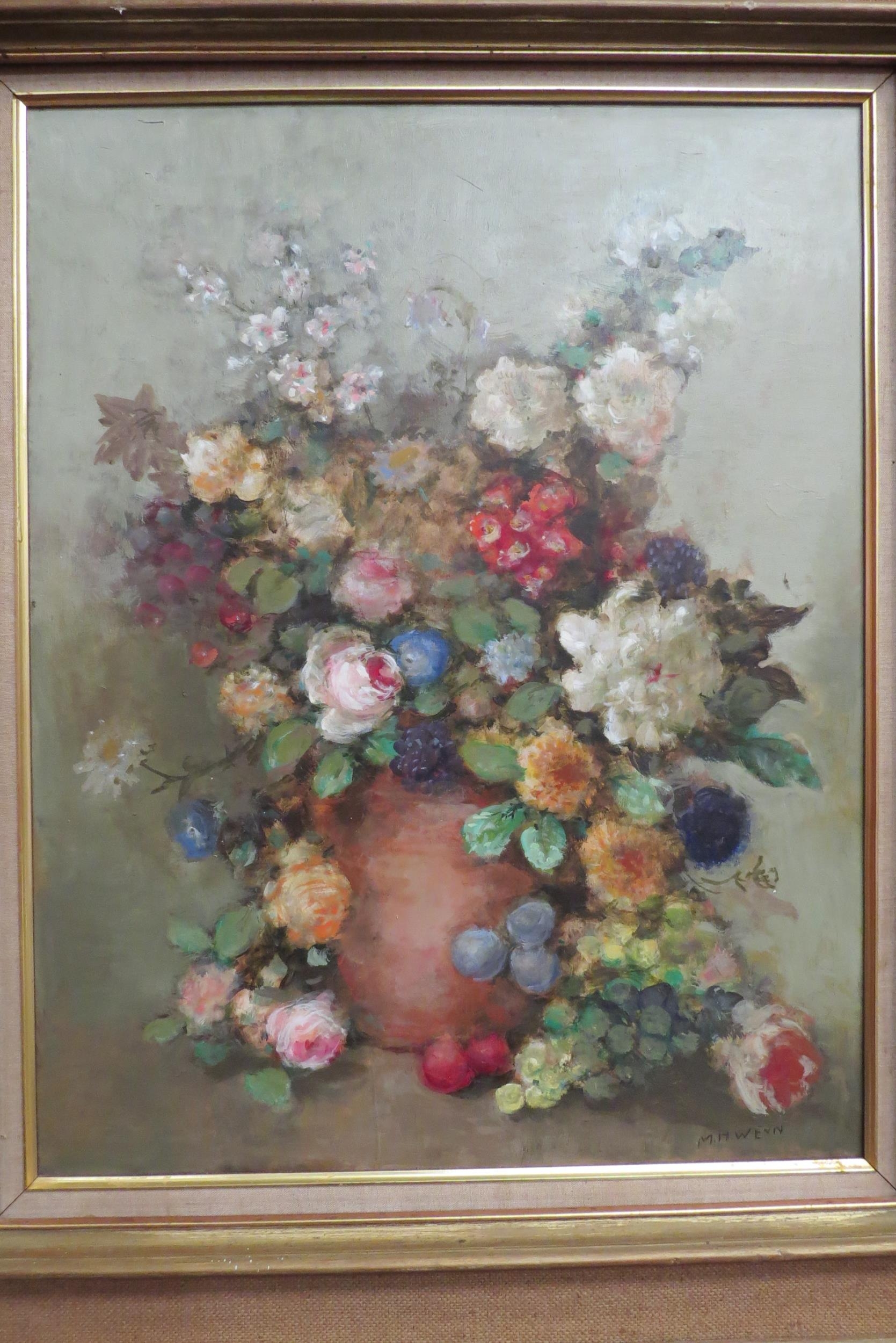 M.H.WENN: A still life oil on board of a vase of flowers. Signed lower right. Framed. 70.5cm x 55cm image size