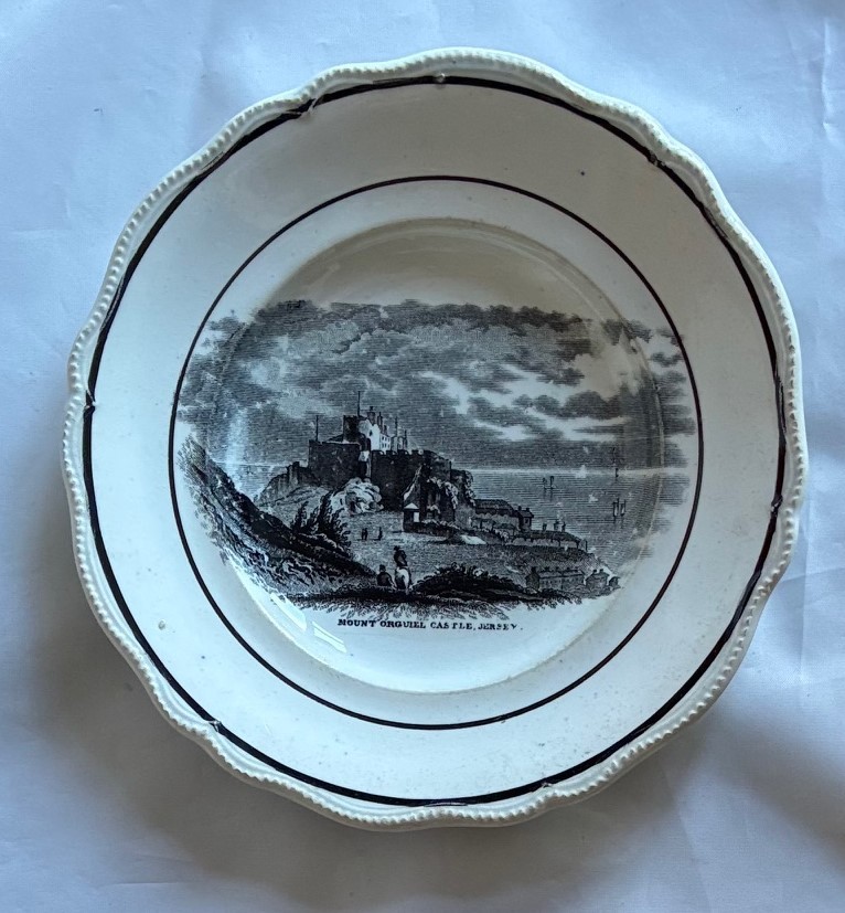 19th century Dilwyn Swansea souvenir plate, of circular form with beaded edge, the centre with a black and white transfer depicting a view of Mont Orgueil Castle Jersey, impressed mark to the base, 15cm diameter.