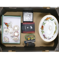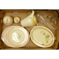 A mixed selection to include:- Clarice Cliff oval platter with floral design, together with Susie Cooper, Crown Works oval serving platter & plate in pink shades and floral design, preservative lidded pot. Wedgwood & Co. Art Nouveau coffee pot, commemorate fluted glass, two silver tone encased shot glasses (1tray)