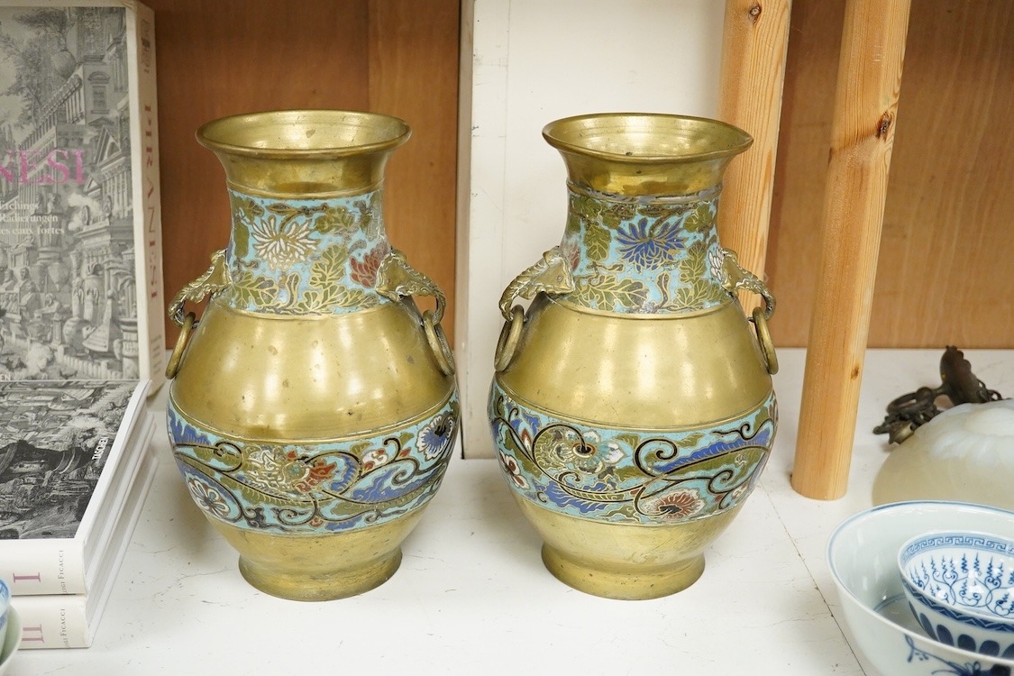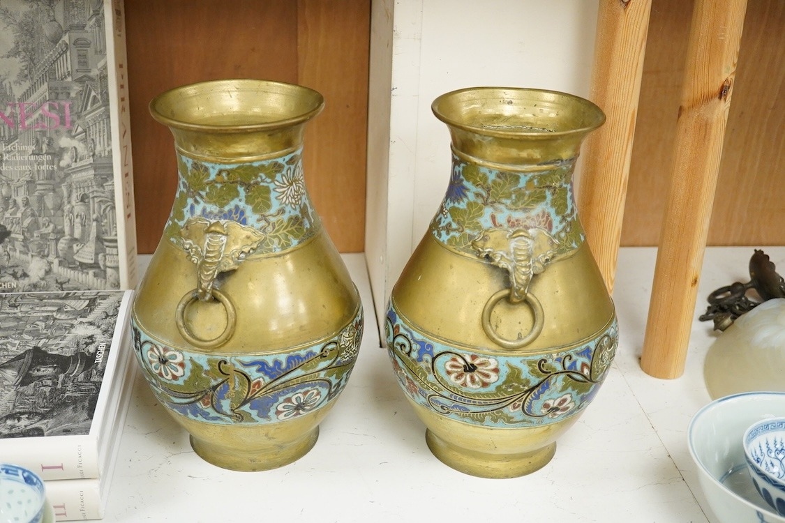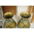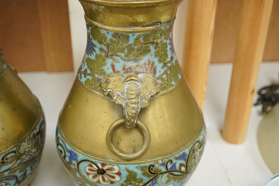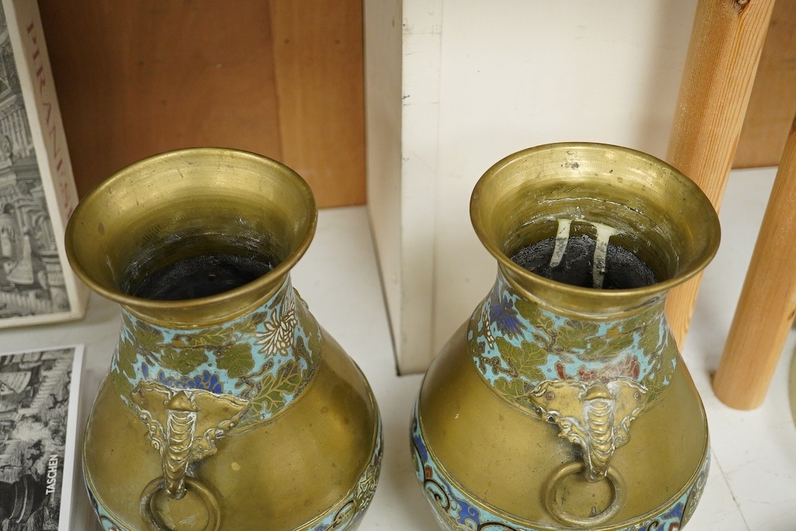 A pair of Japanese brass and champleve enamel vases, Meiji period, 29cm