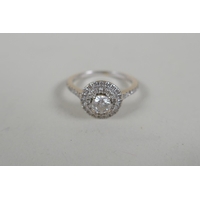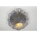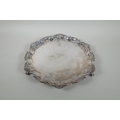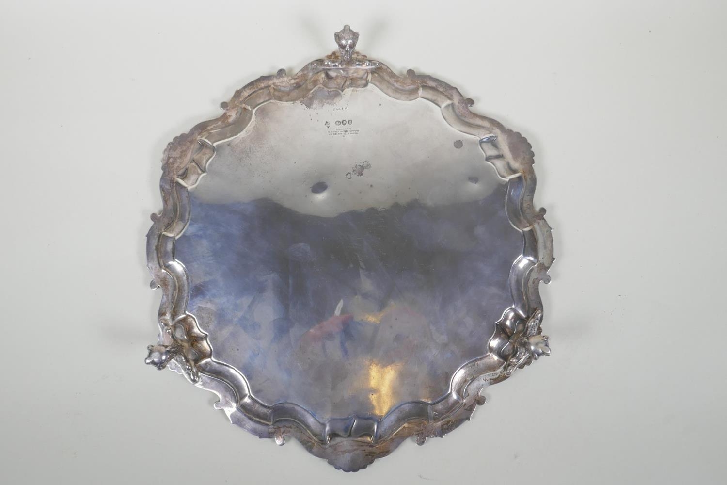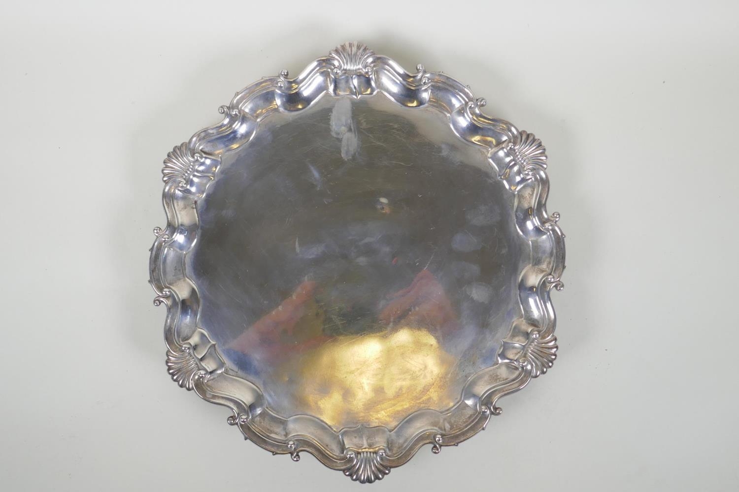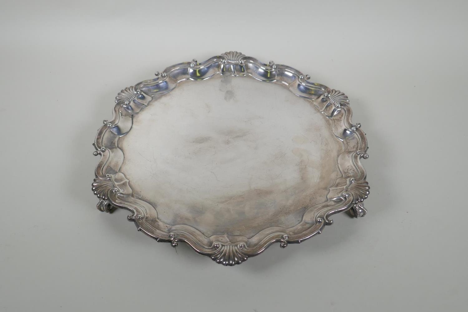 A Victorian silver tray on ball and claw feet by Martin, Hall & Co (Richard Martin & Ebenezer Hall), London 1892, 1207g, 37cm diameter