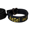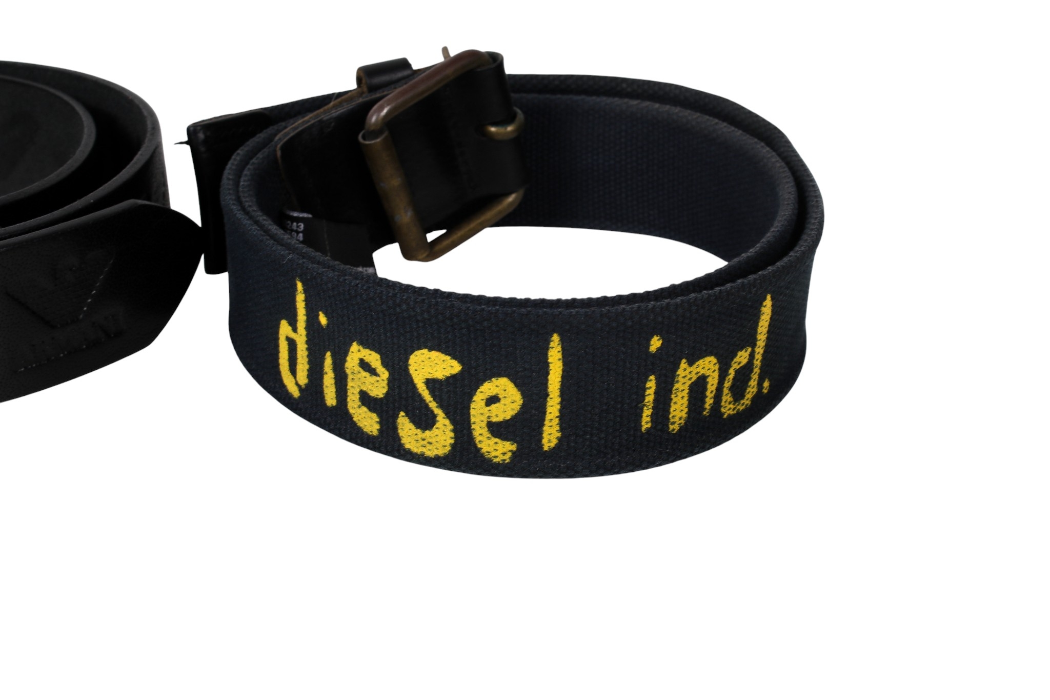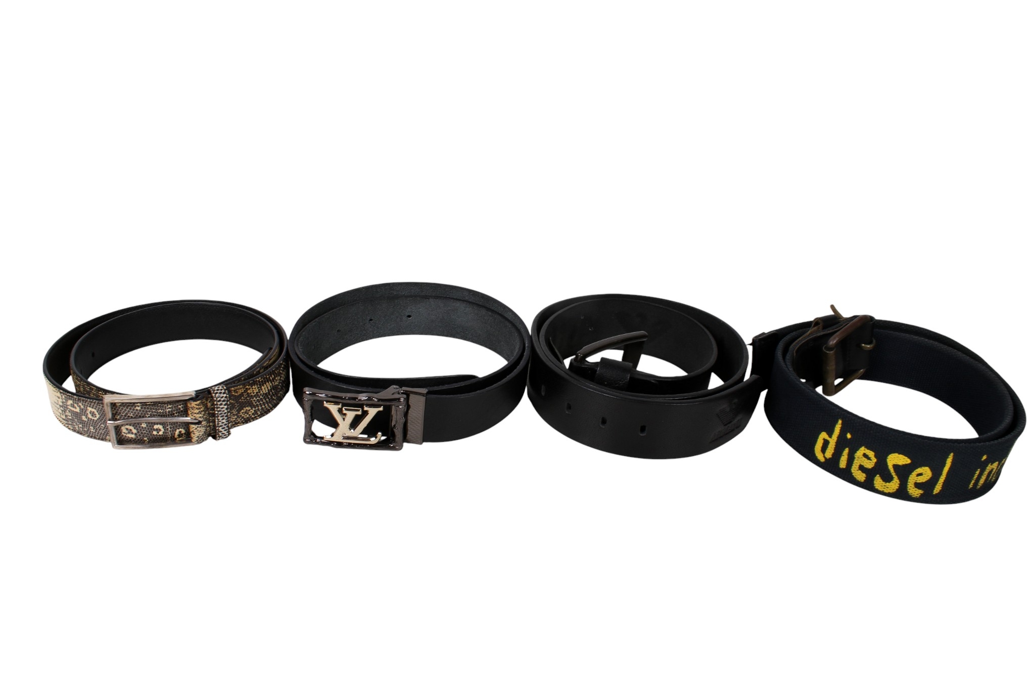 Four designer style belts. Comprising a Prada faux snakeskin belt with a chrome buckle, stamped '2C1468251', length 100cm, a Diesel blue fabric belt stamped 'diesel ind' in yellow with brass hardware, length 105cm, a Louis Vuitton black leather belt with chrome hardware, length 99cm and an Armani black leather belt with grey metal hardware, length 99cm.