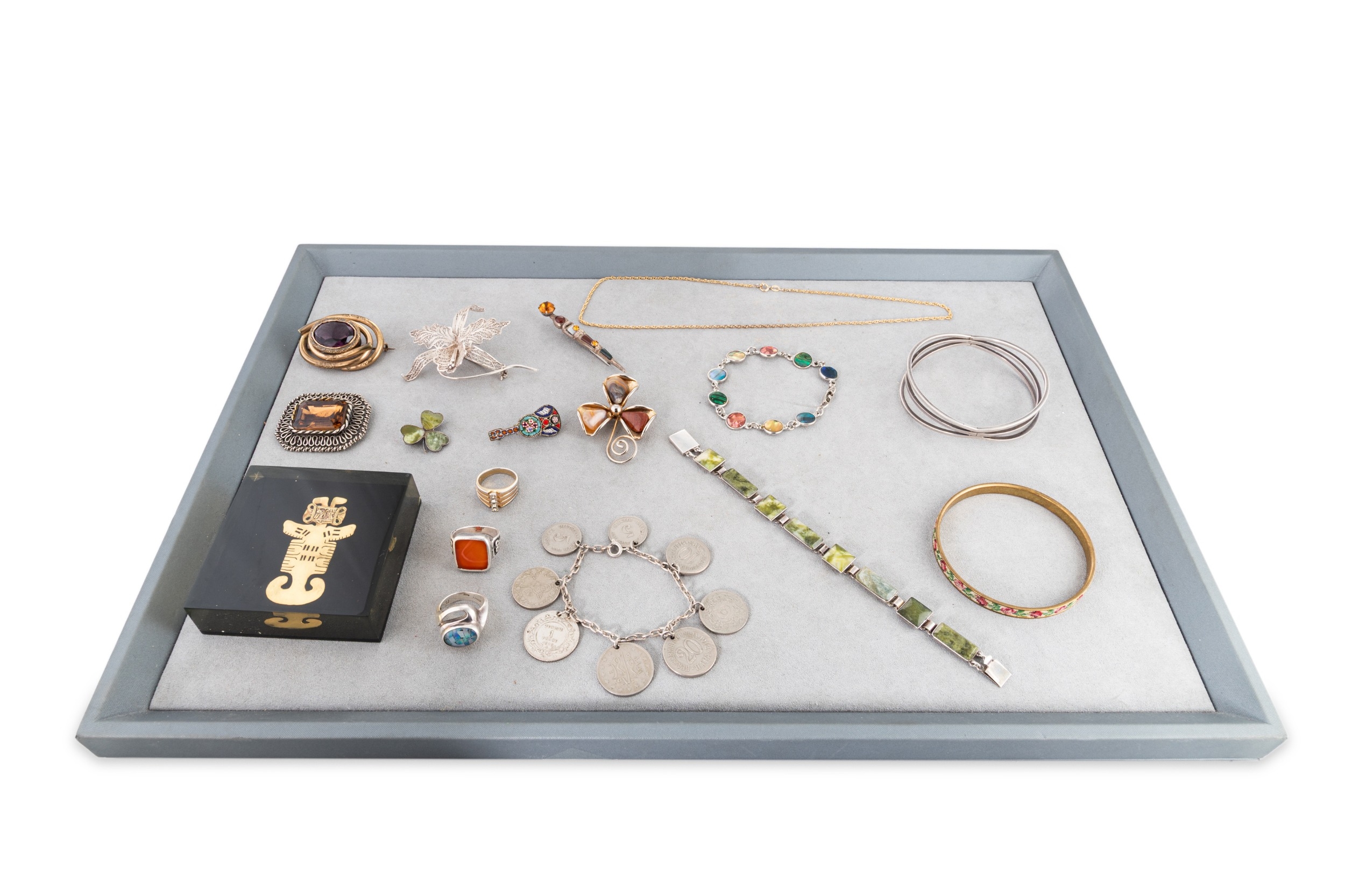 A COLLECTION OF COSTUME JEWELLERY, vintage & antique, including a silver bracelet, filigree butterfly brooch, etc.