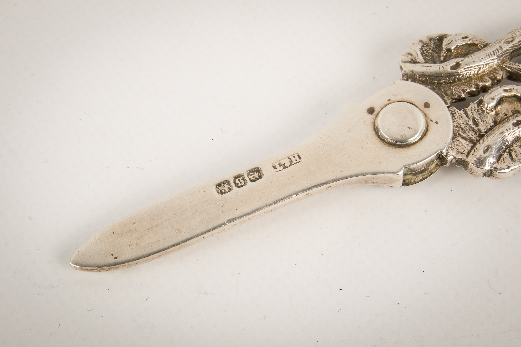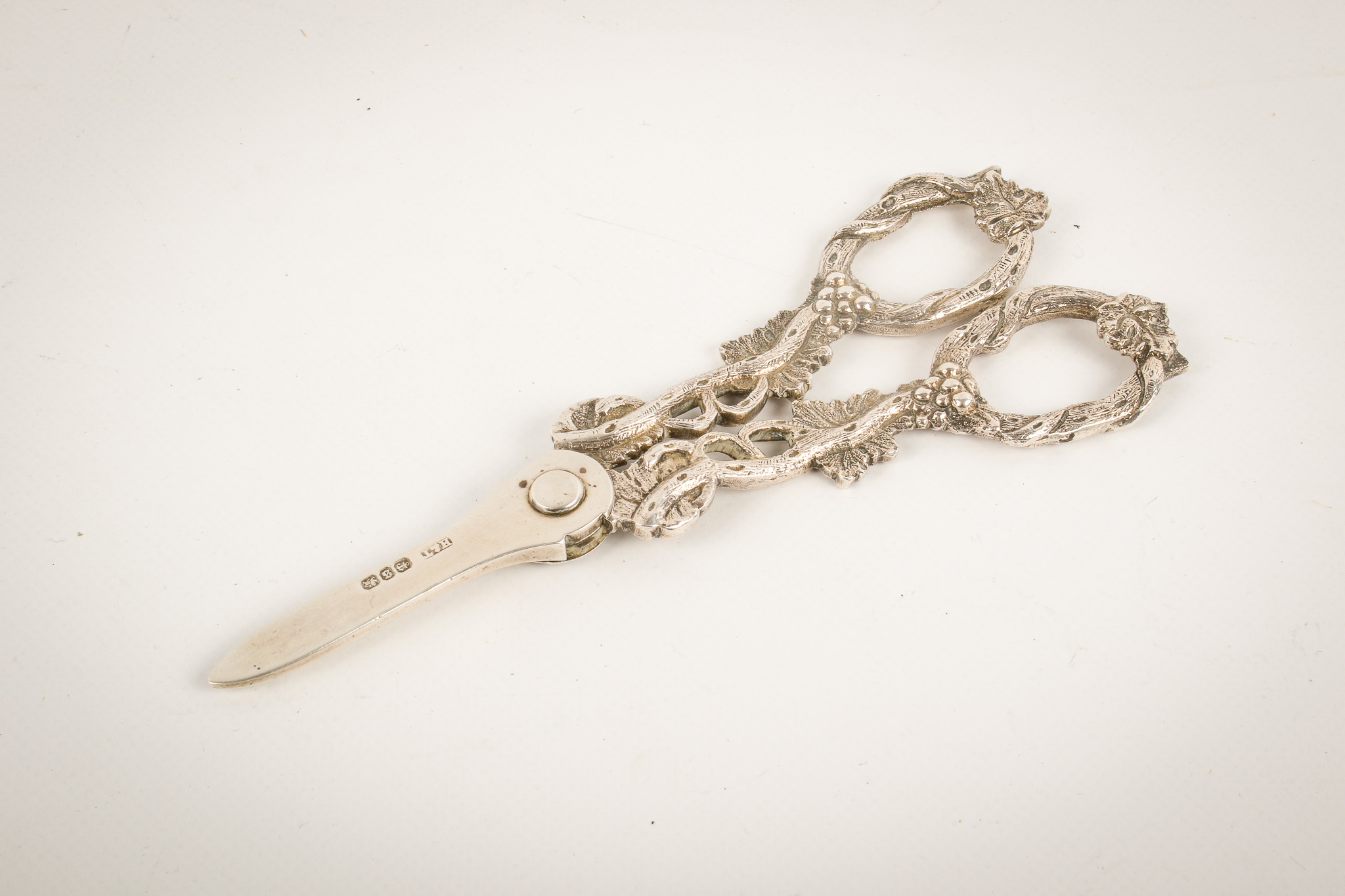 A pair of Victorian silver grape scissors. The handles modelled as vines, hallmarked to one blade Hilliard & Thomason, Birmingham 1892, gross weight 66.8g.