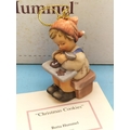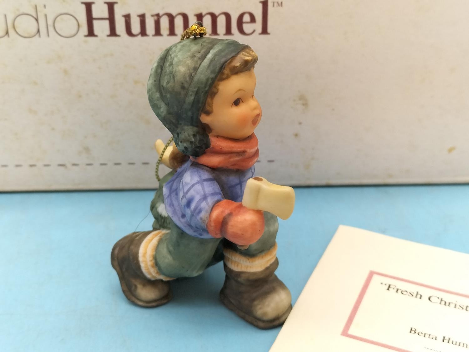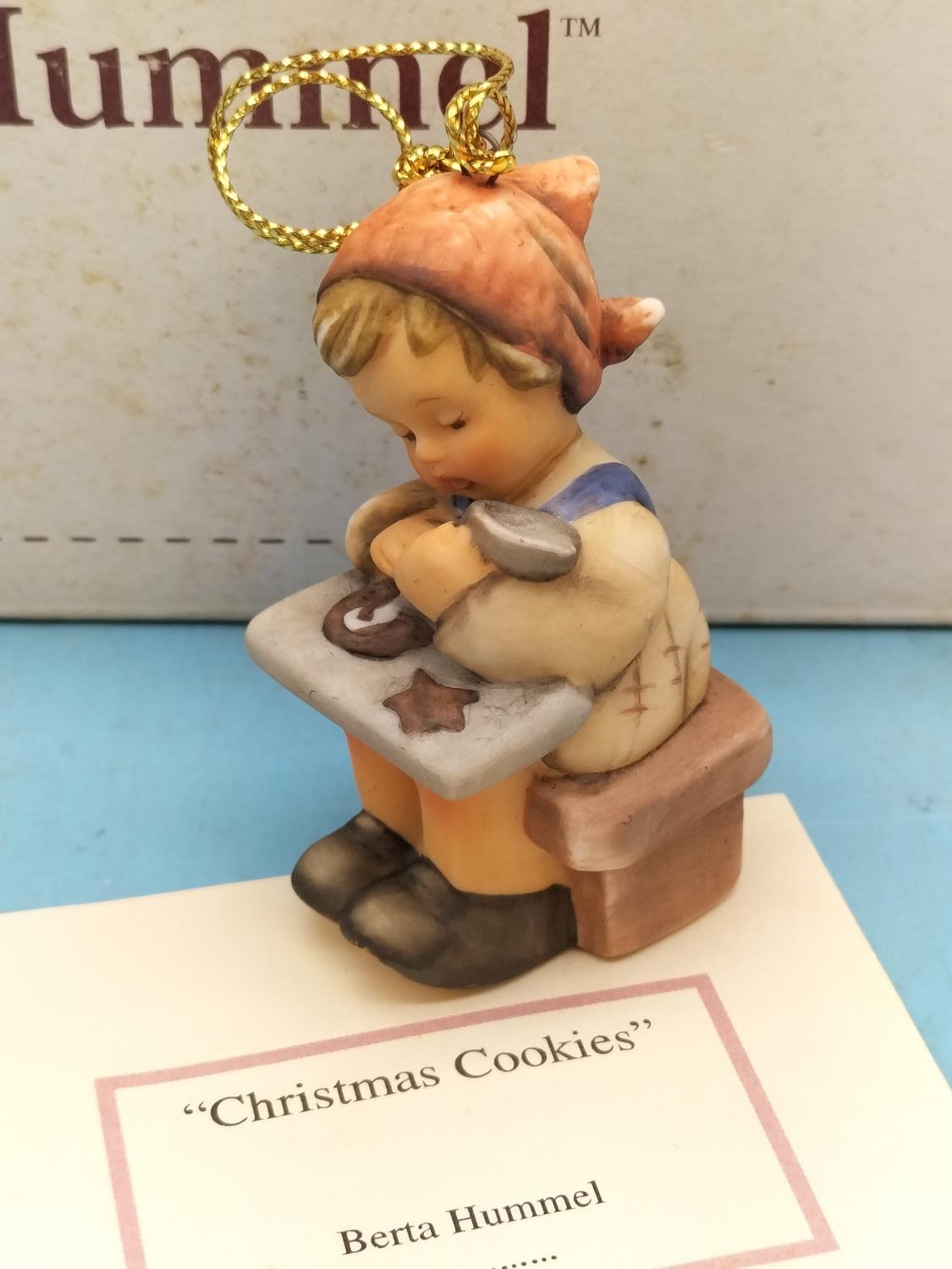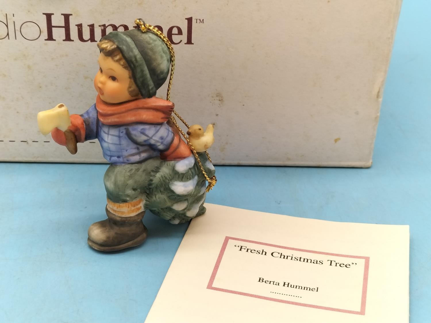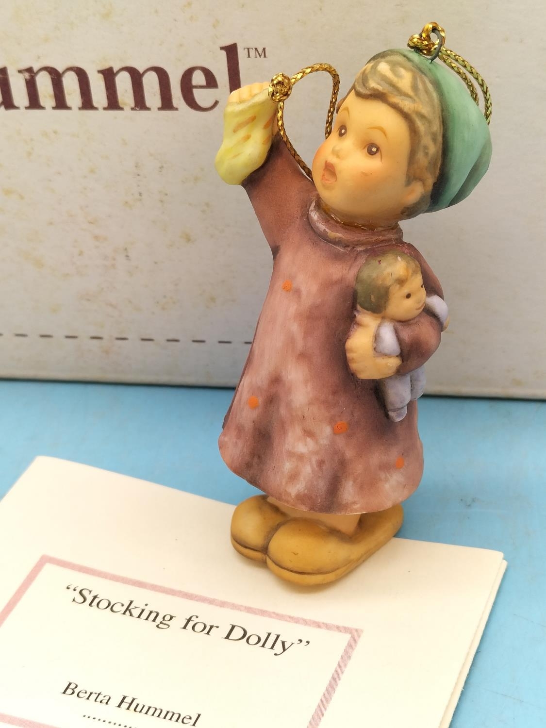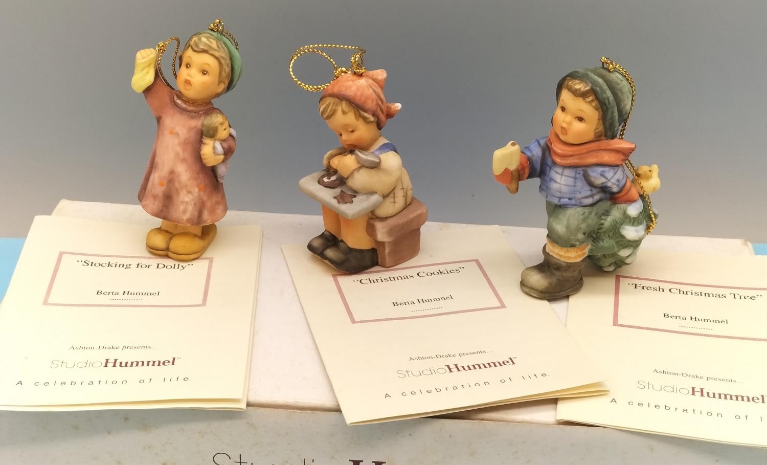 Goebel Berta Hummel 7.5cm Christmas Decorations (3), 'Stocking For Dolly', 'Fresh Christmas Tree' and 'Christmas Cookies' All With Certificates.