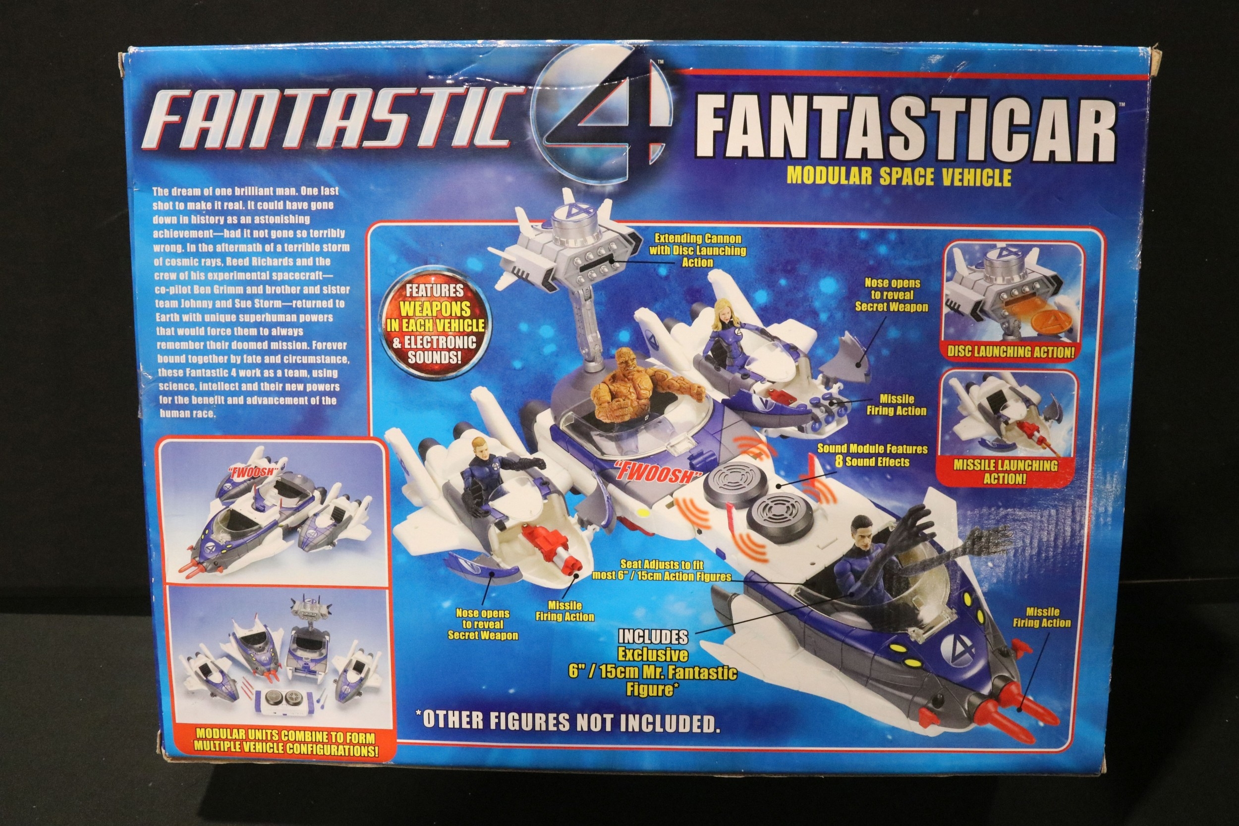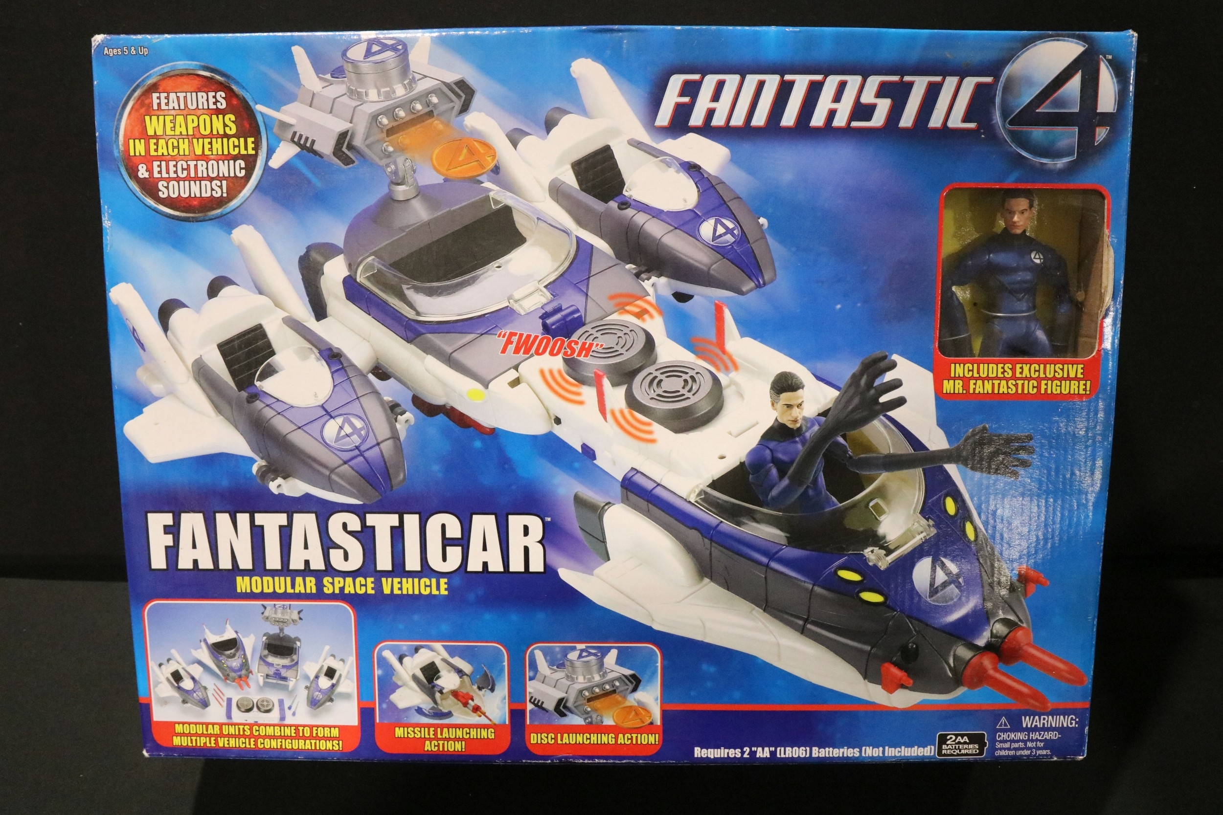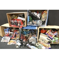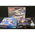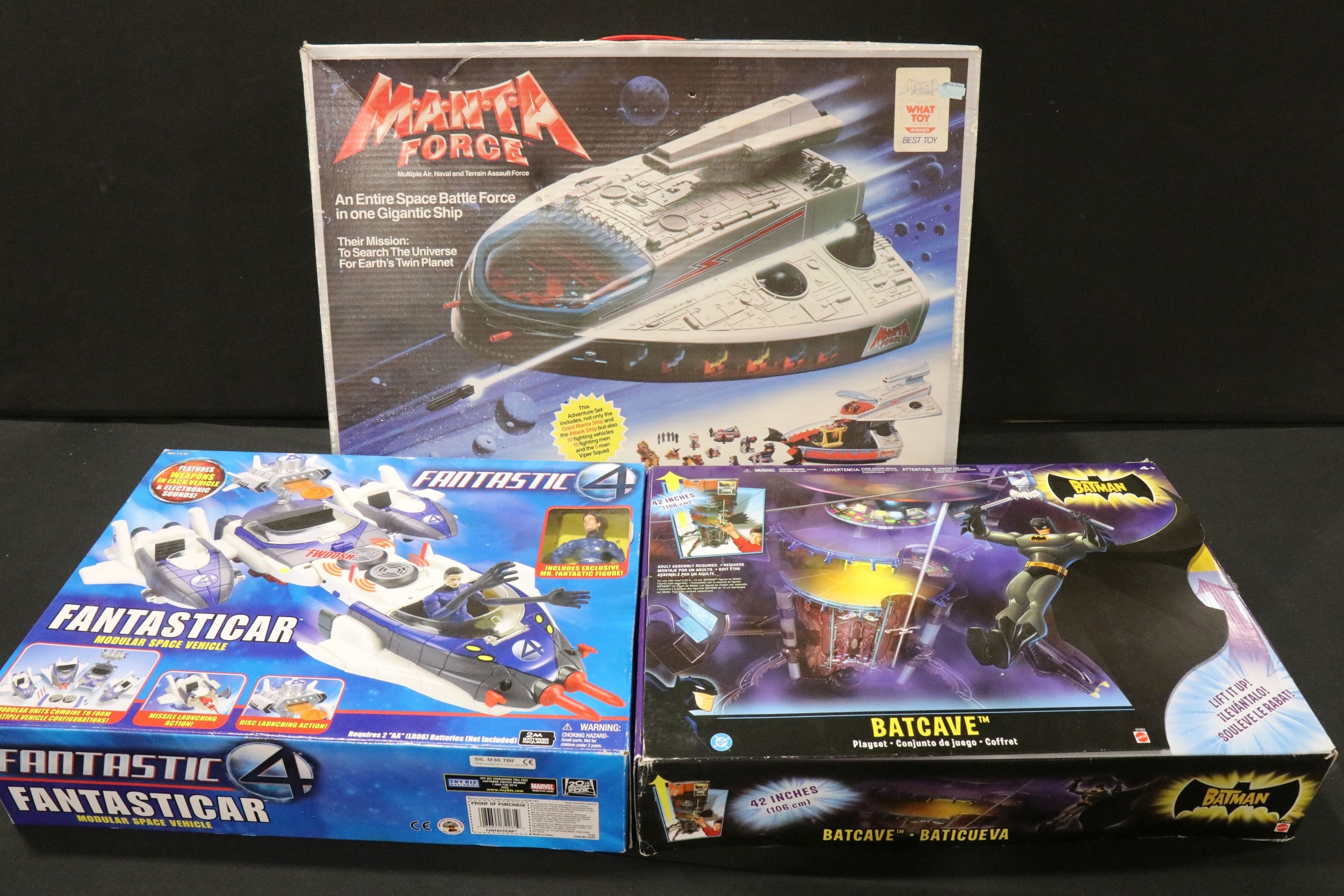 Four boxed superhero /Sci Fi play sets to include Bluebird Manta Force Entire Space Battle Ship (unchecked for completeness), ToyBiz Fantastic Four Modular Space Vehicle, Mattel Justice League Javelin 7 and Mattel Batman Batcave