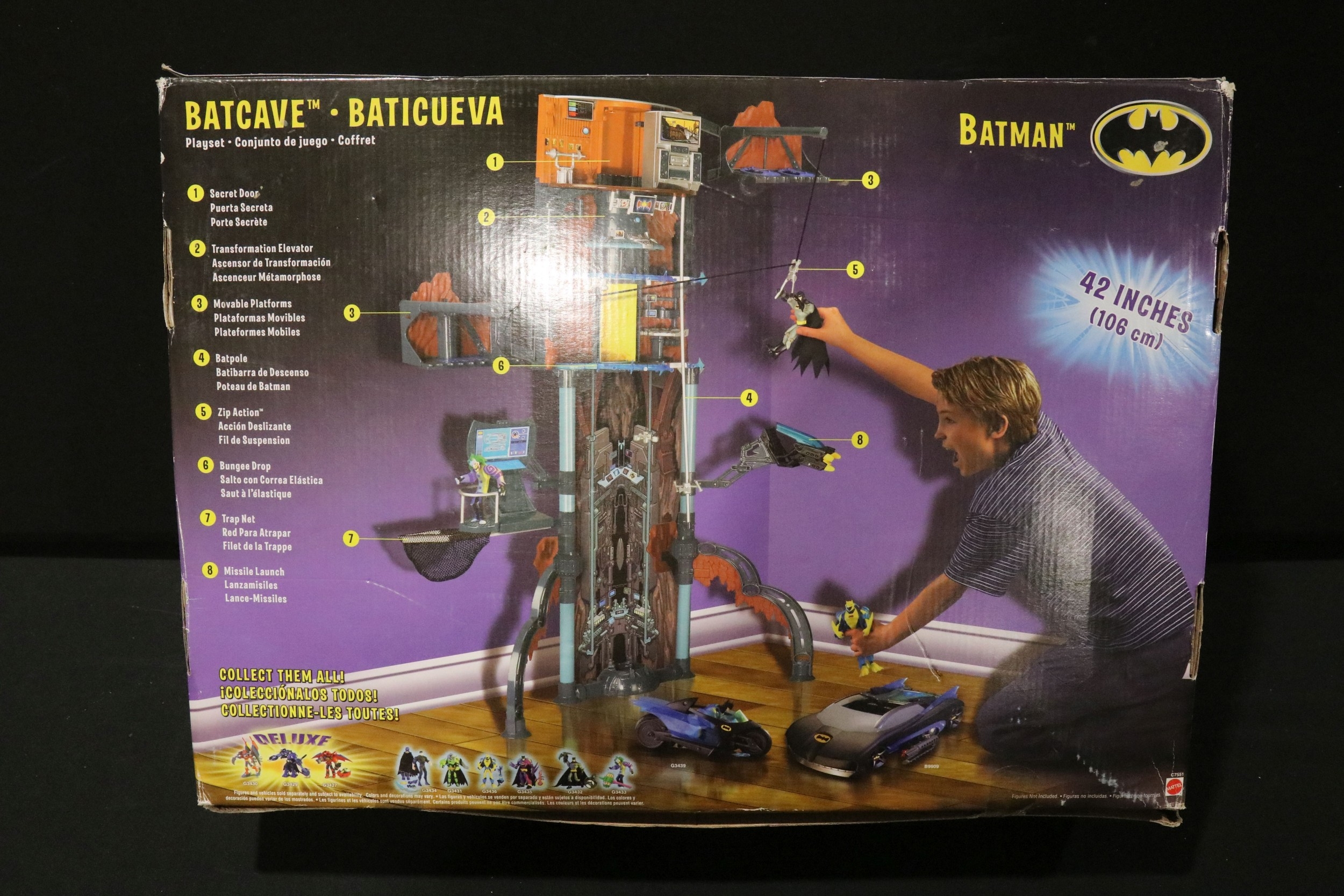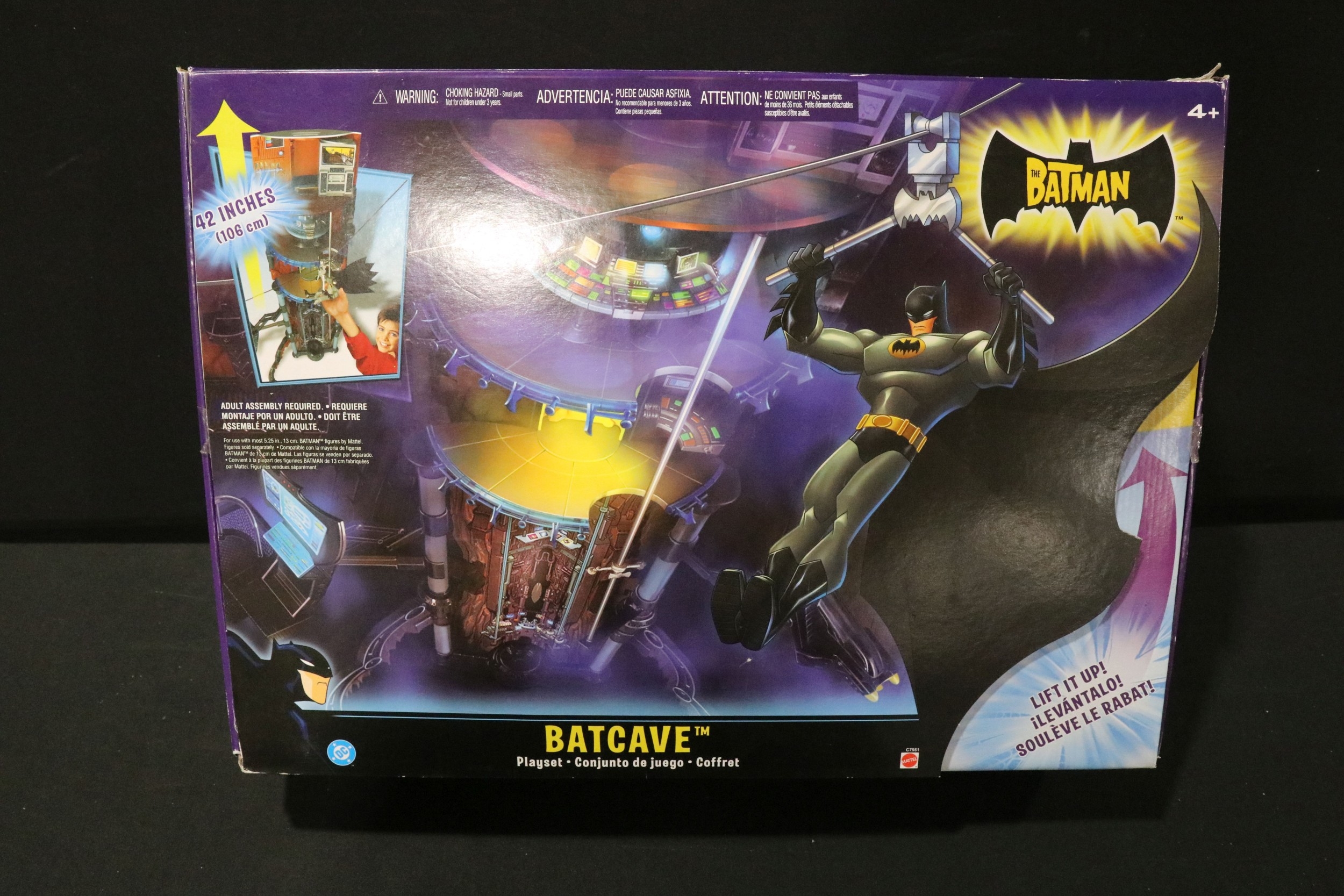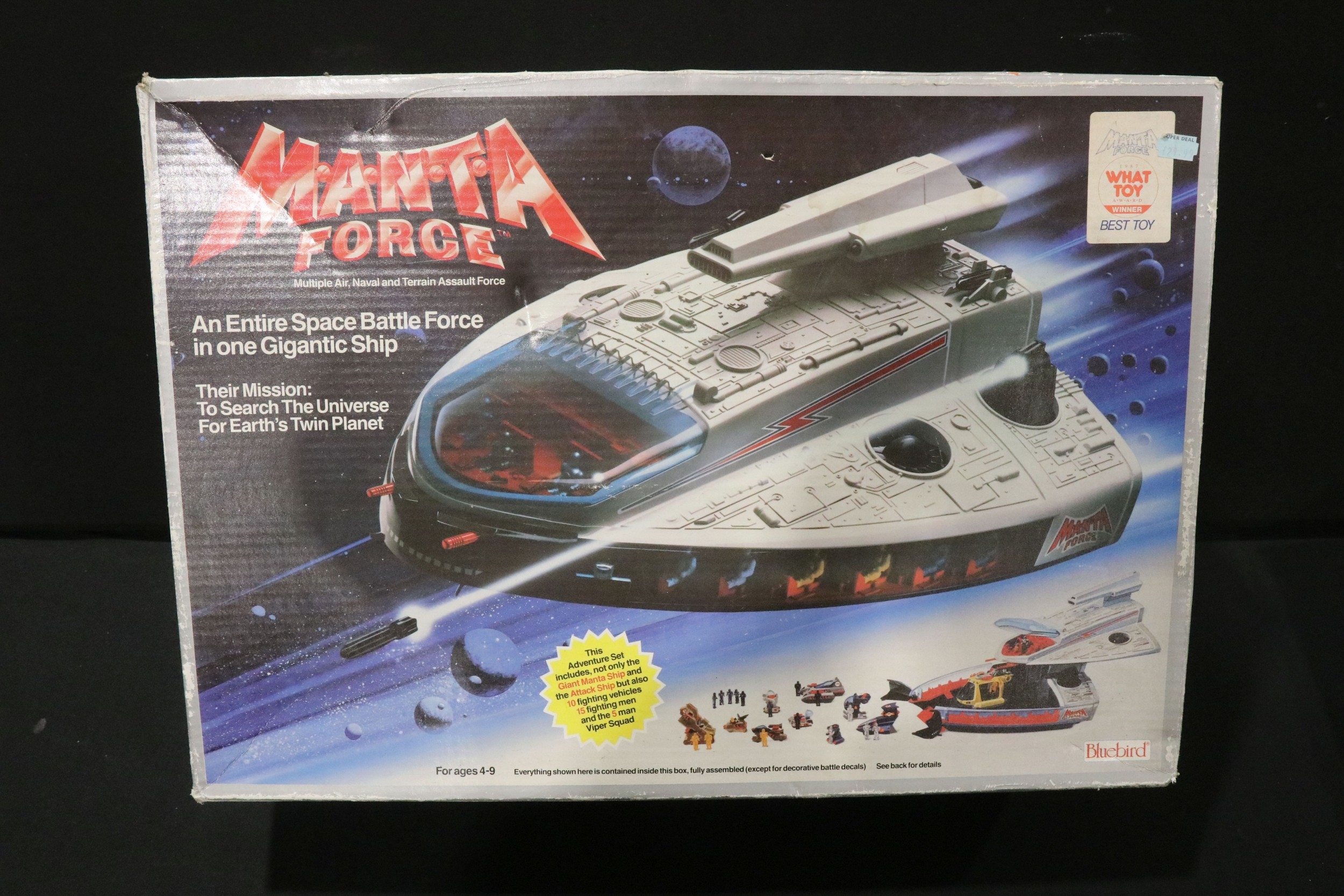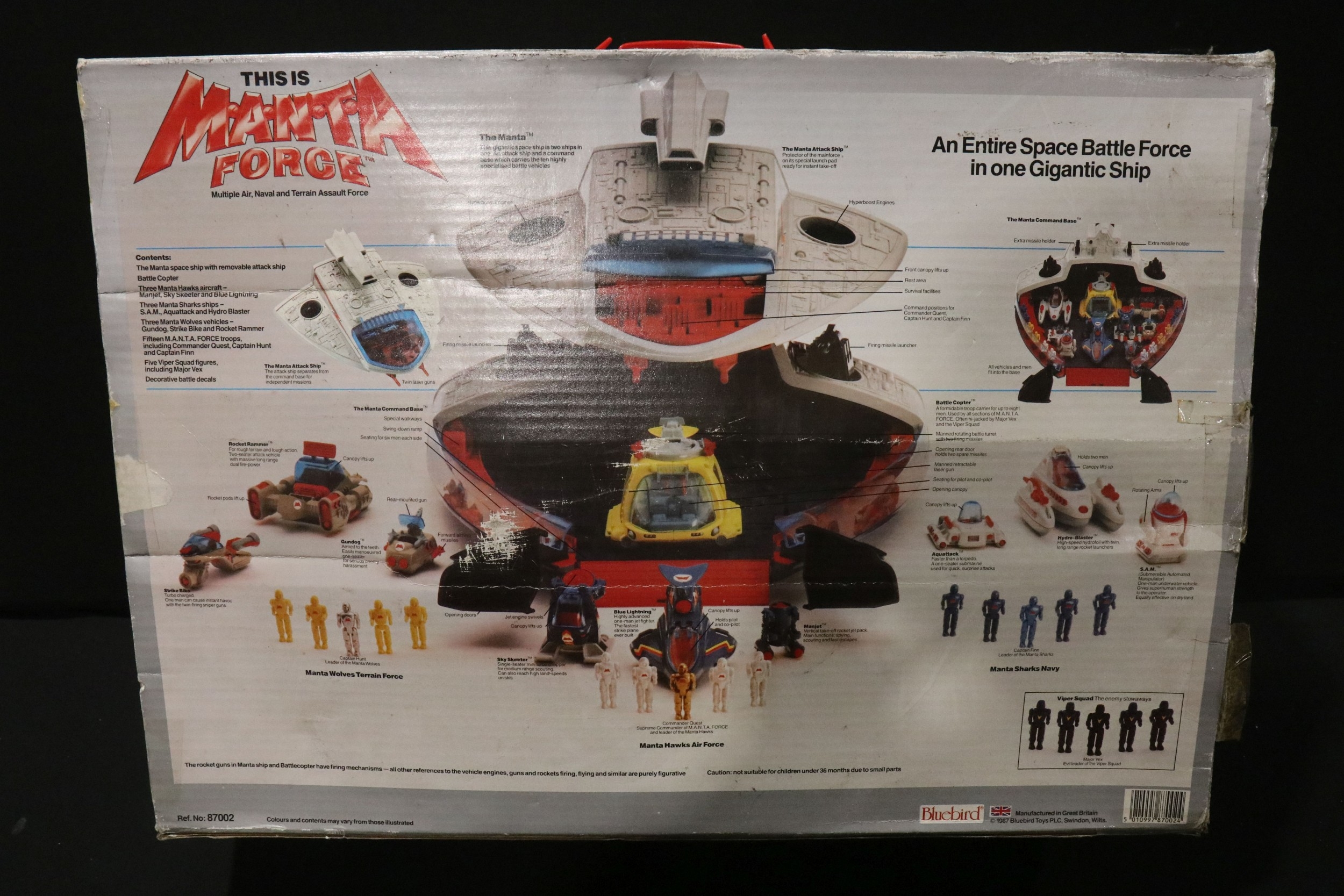 Four boxed superhero /Sci Fi play sets to include Bluebird Manta Force Entire Space Battle Ship (unchecked for completeness), ToyBiz Fantastic Four Modular Space Vehicle, Mattel Justice League Javelin 7 and Mattel Batman Batcave