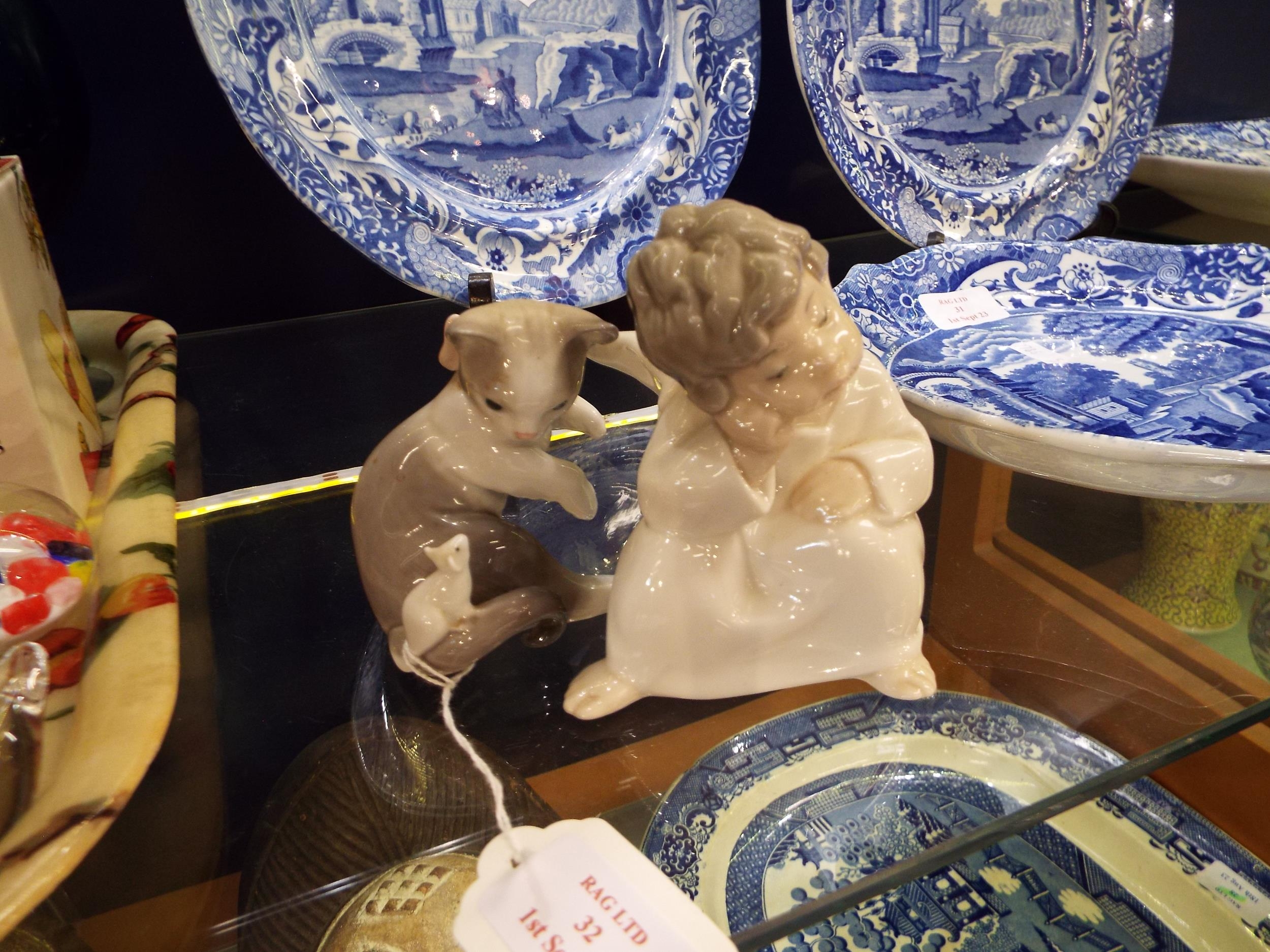 Two Lladro figures cat with mouse on tail and Lladro cherub