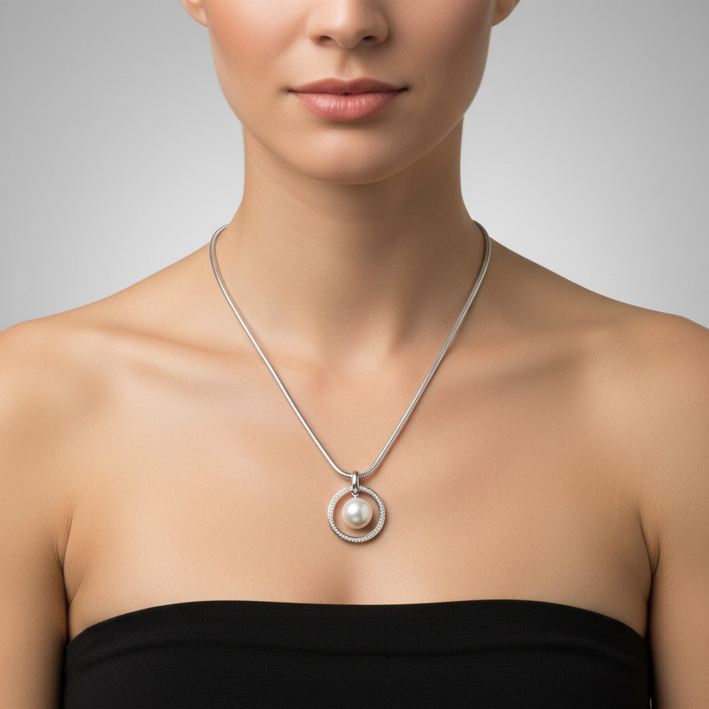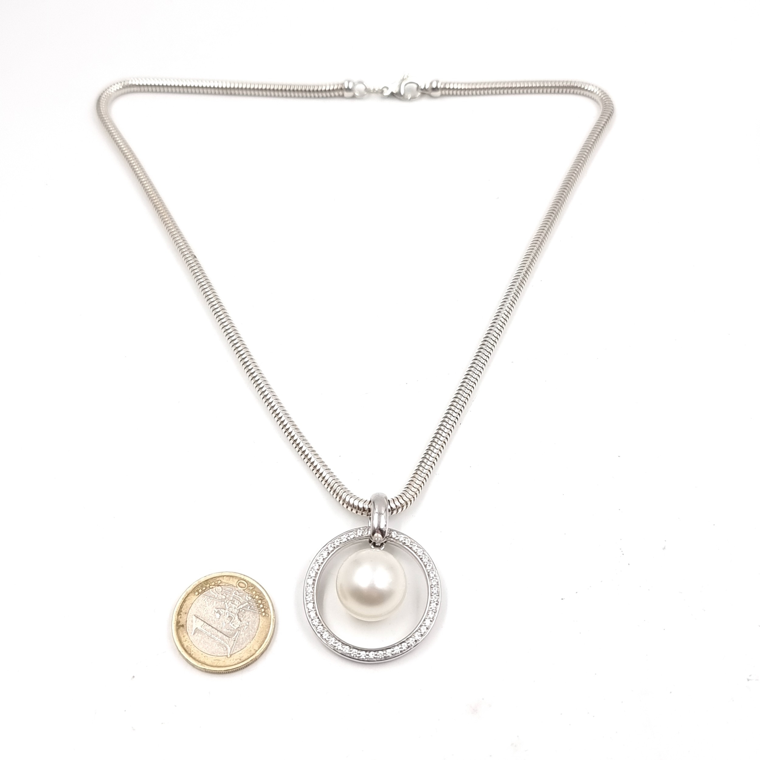 A Thomas Sabo large Pearl gemstone pendant and chain set in 925 Sterling Silver. Weight - 40 grams. Comes in original Thomas Sabo box. Please note, the image of the modelled item was created by a new imaging/ staging software called showiton.ai. Upload a simple image of a piece of jewellery and the software stages it on a model for you. Paste the URL (showiton.ai) into your browser and try it for free. It’s a very simple, user-friendly platform.