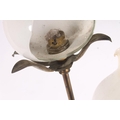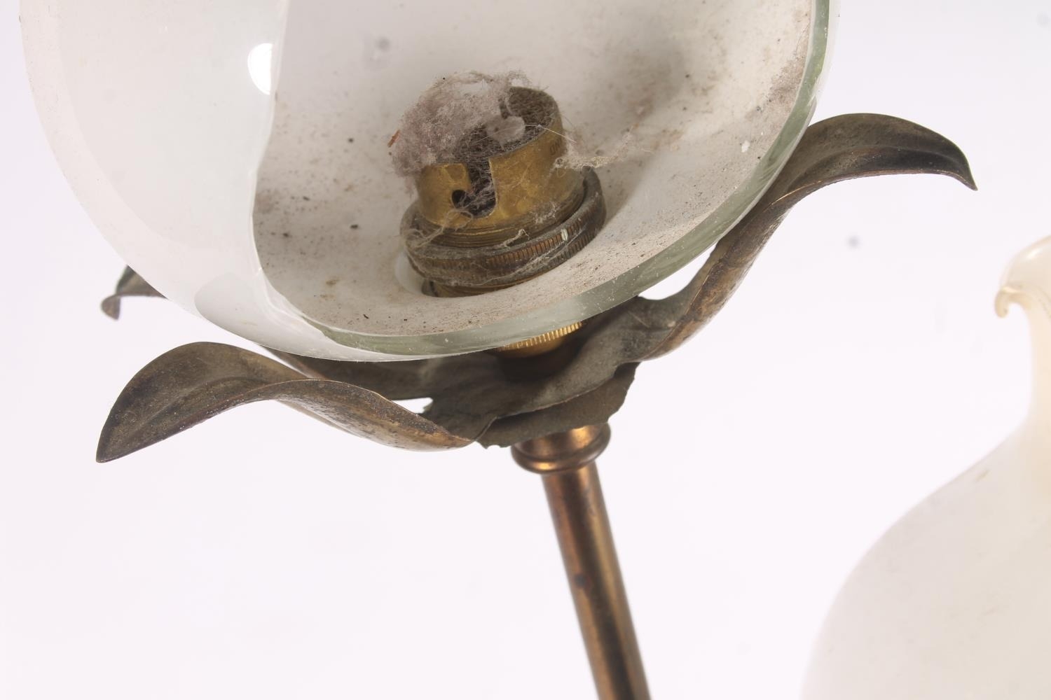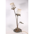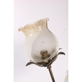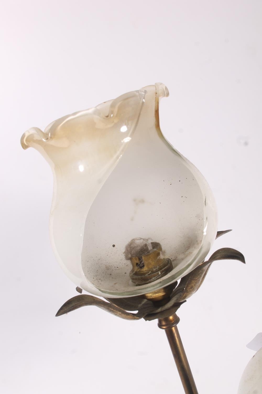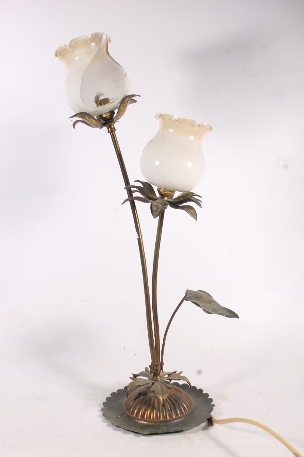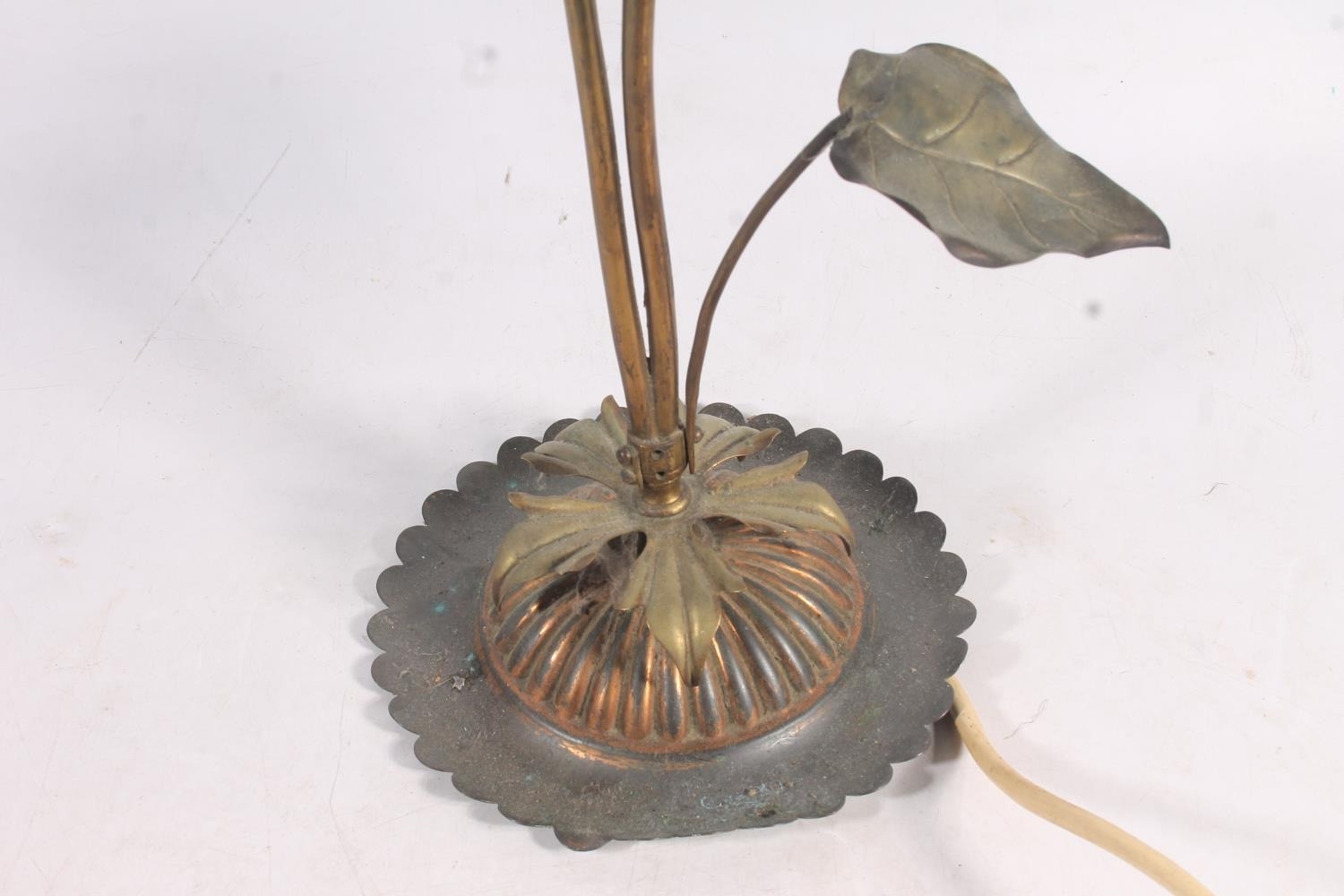 Early 20th century brass and copper Art Nouveau table lamp of twisted floral form, in the style of WAS Benson.