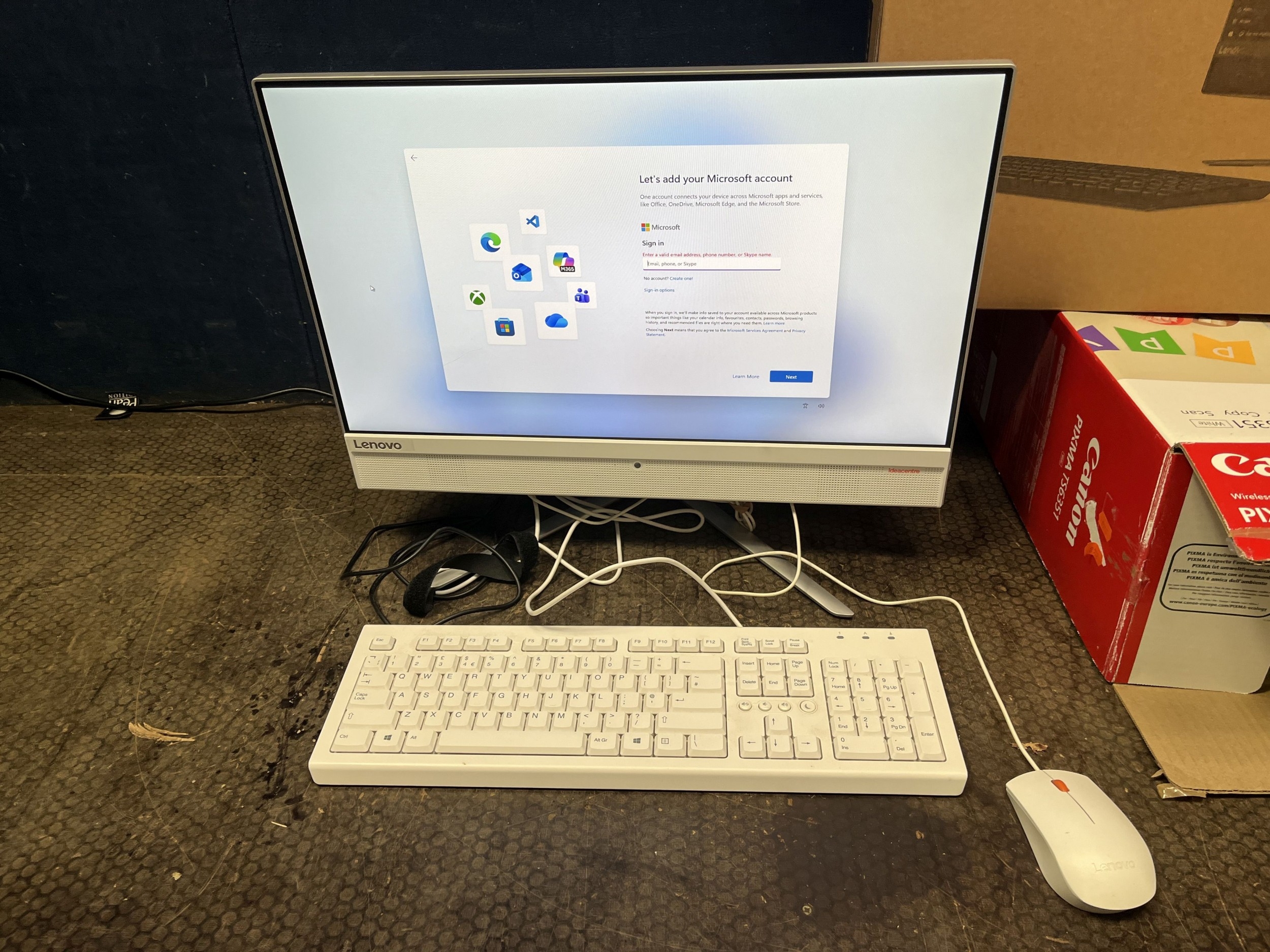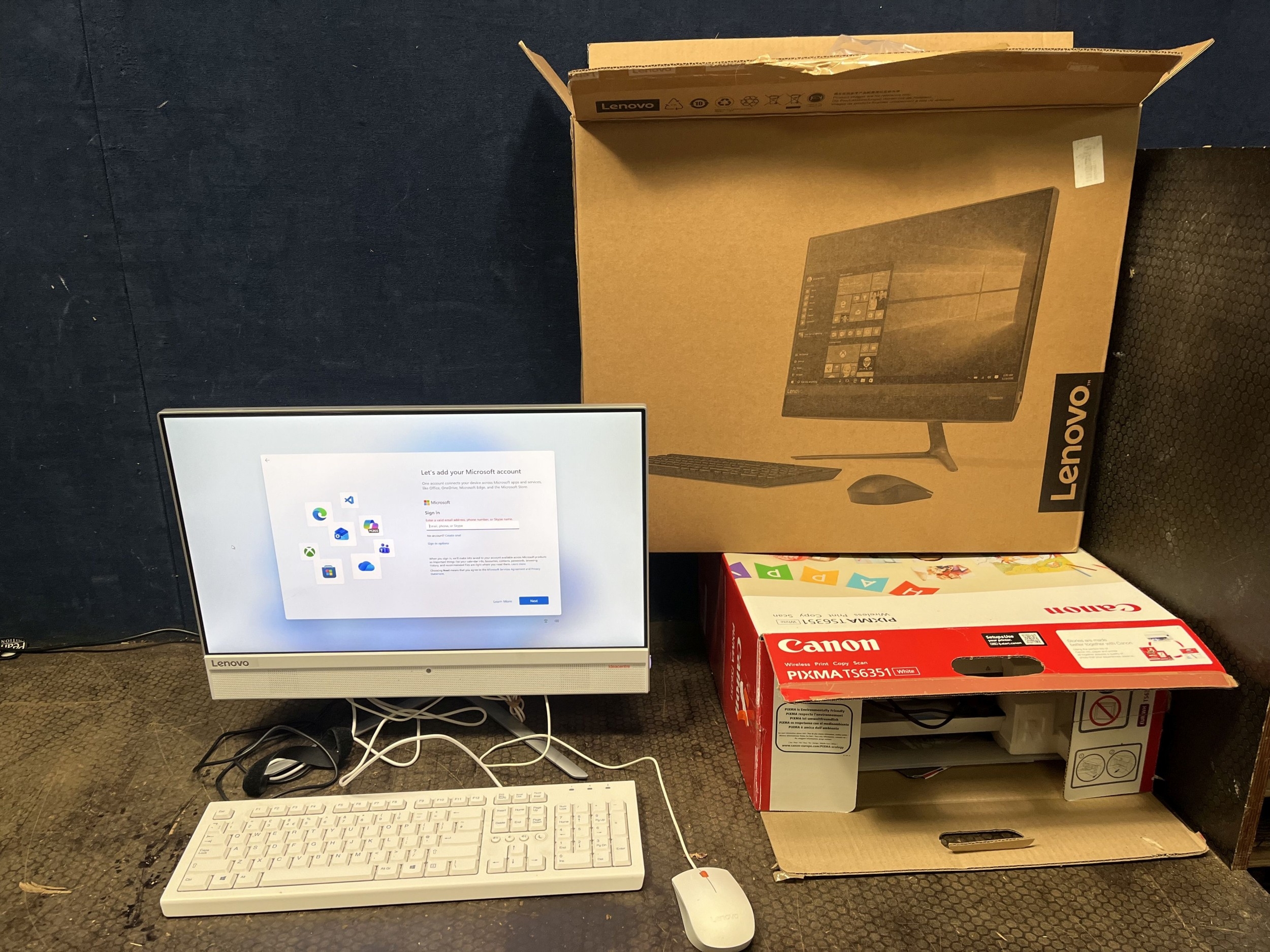 A LENOVO IDEACENTRE F0CD ALL IN ONE COMPUTER with 8Gb RAM, i56400T processor, 1Tb HDD, wired keyboard and mouse, original box (PAT pass and working and reset to factory settings) and a Canon TS6351 printer in box (untested)