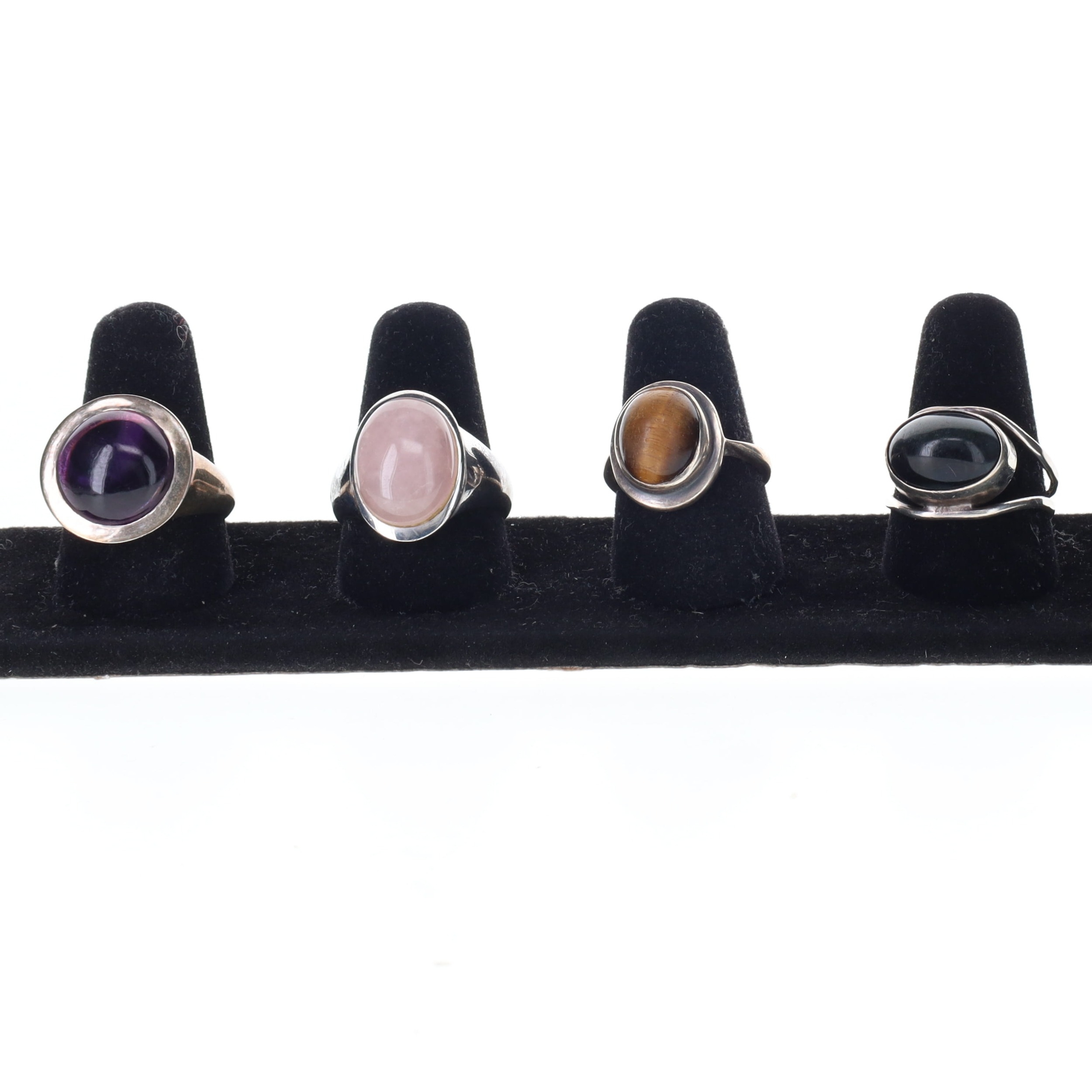 Gemstone Silver Ring Collection incl. Mid Century, Tigers Eye. Some rings are stamped while others have been tested as 925. Stones are secure, minor surface scratches to metal and stones. Weighs in total 24.9g.