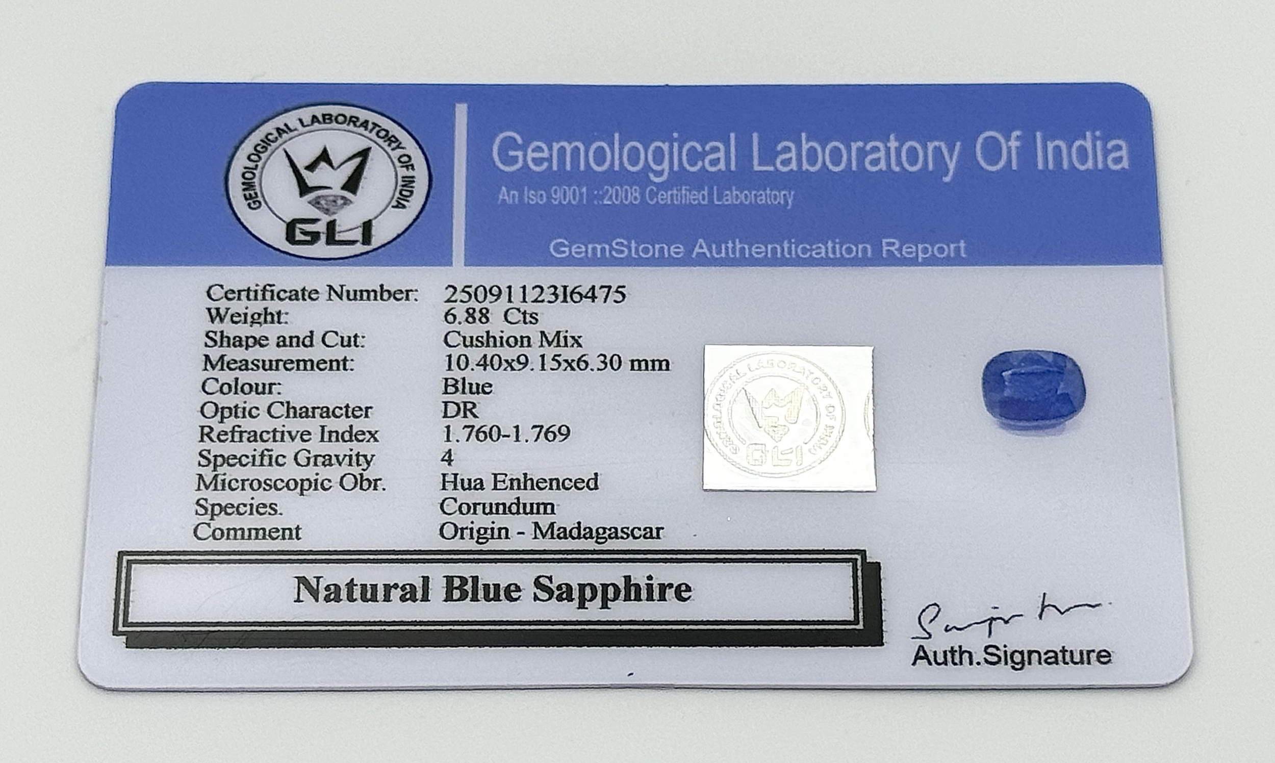 A 6.88ct Faceted Madagascan Blue Sapphire Gemstone. Cushion shape. Colour enhanced. GLI certified. Ref: V.C.39
