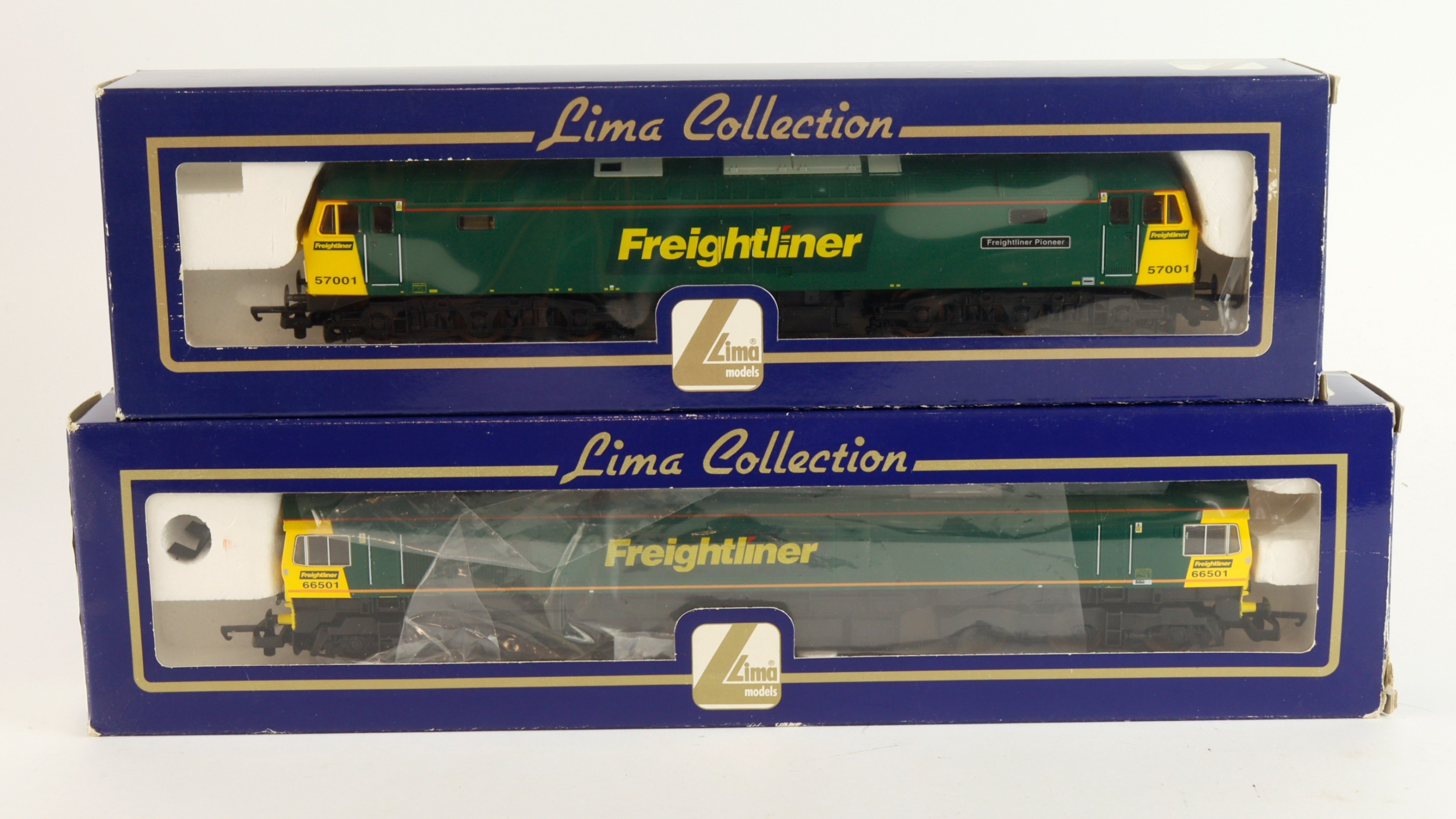 Lima. Two boxed Lima OO gauge locomotives, comprising Class 66 Diesel 66501 'Freightliner' (L205229); Class 57 Diesel 57001 'Freightliner' (L204649)