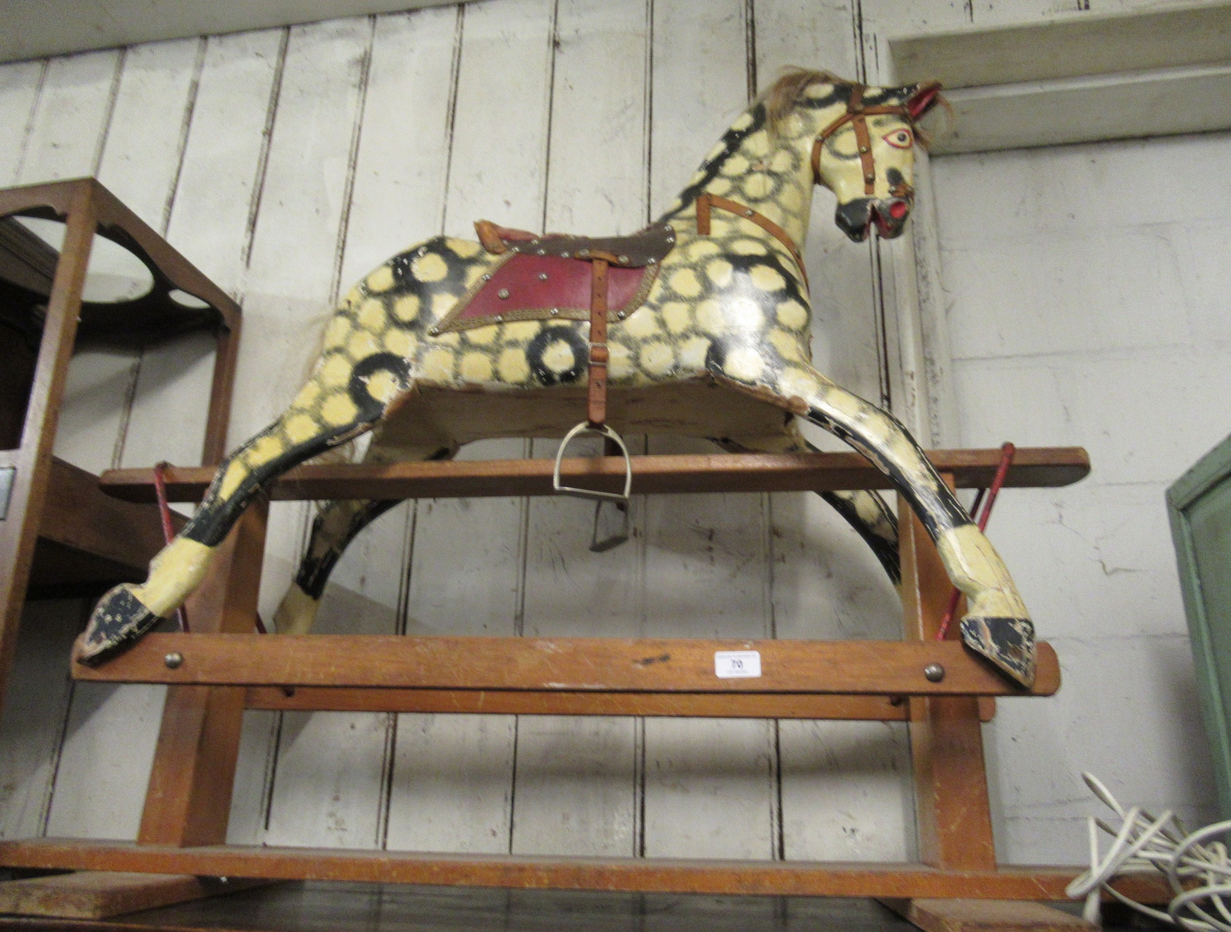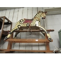 20th Century dapple blockwork rocking horse on a pine stand, with real horse hair mane and tail, 97cm high x 110cm long