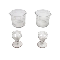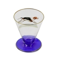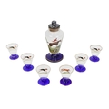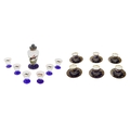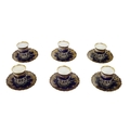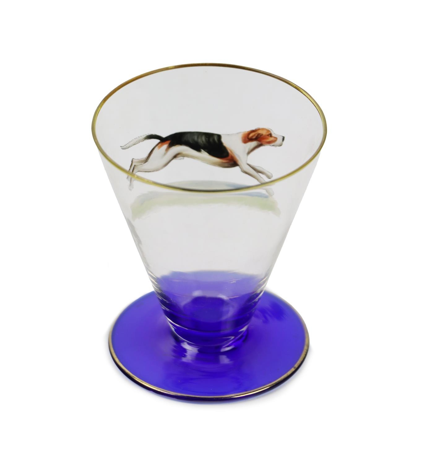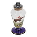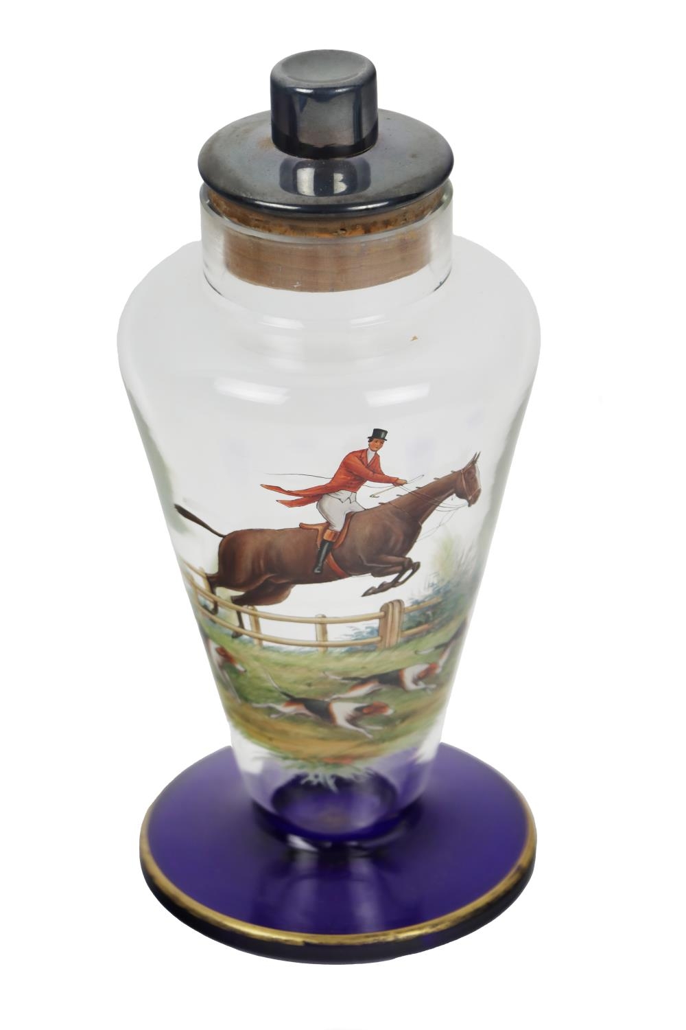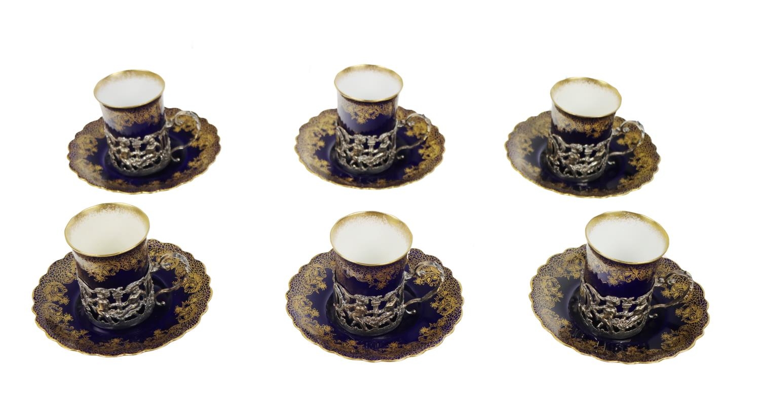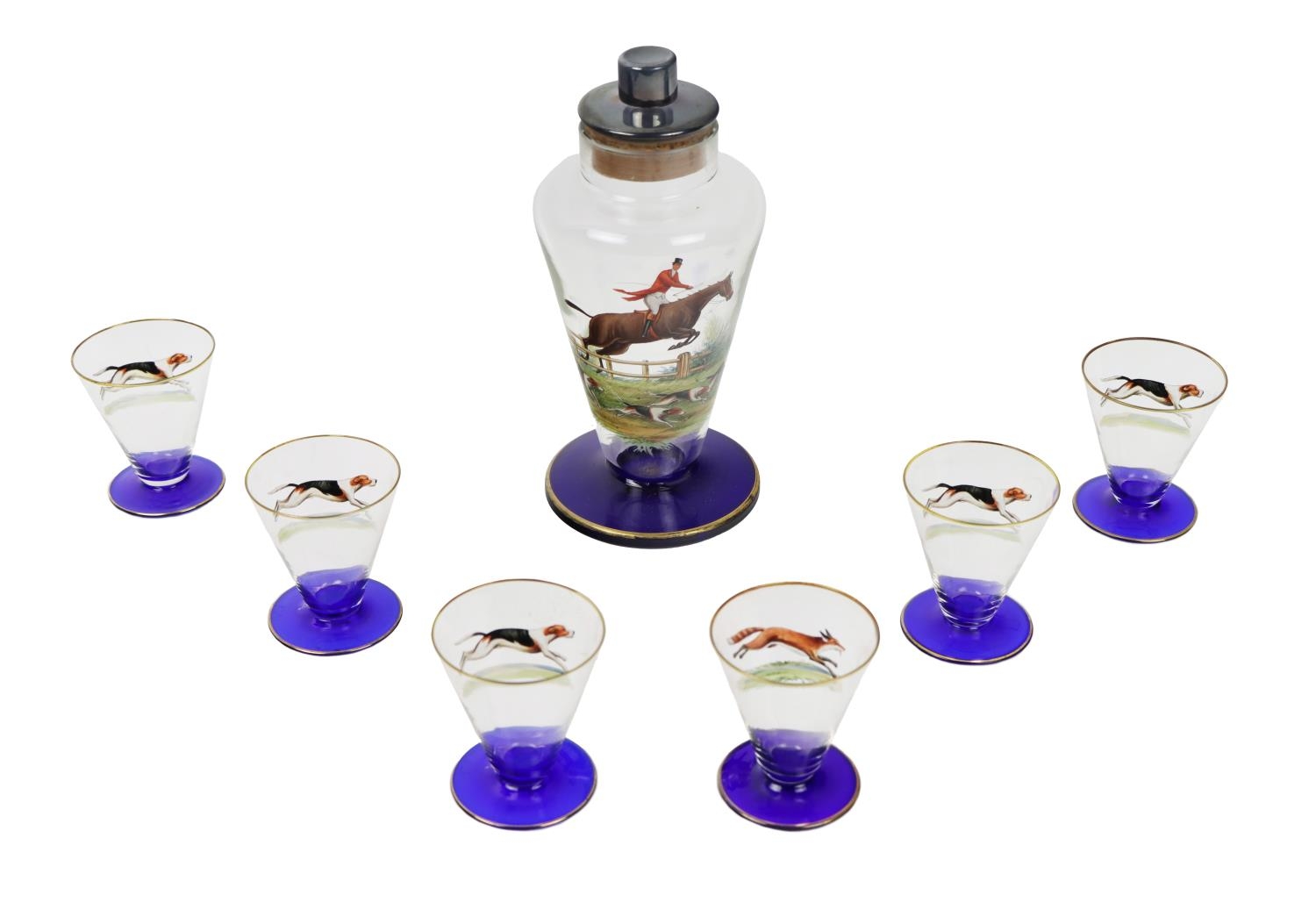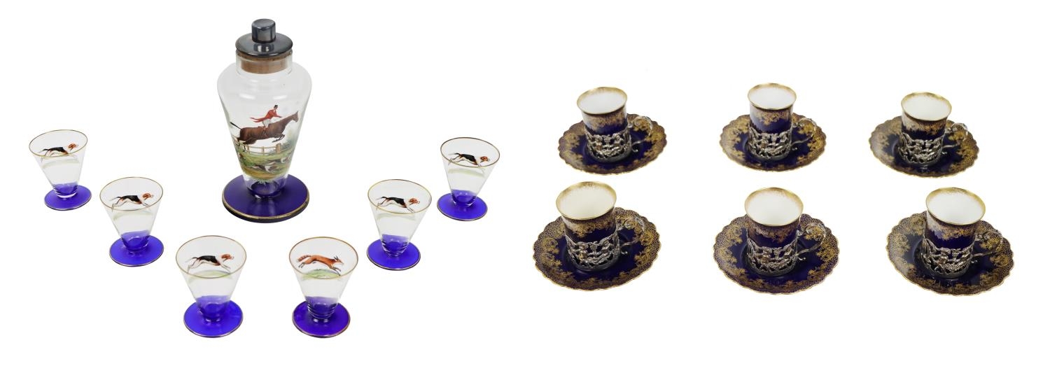A small Ansley china set of 6 Coffee Cups, with embossed and pierced silver holders and 6 matching saucers; also an attractive hand painted glass Decanter, with 6 matching glasses, all decorated with huntsmen and hounds. A lot. (1)