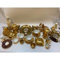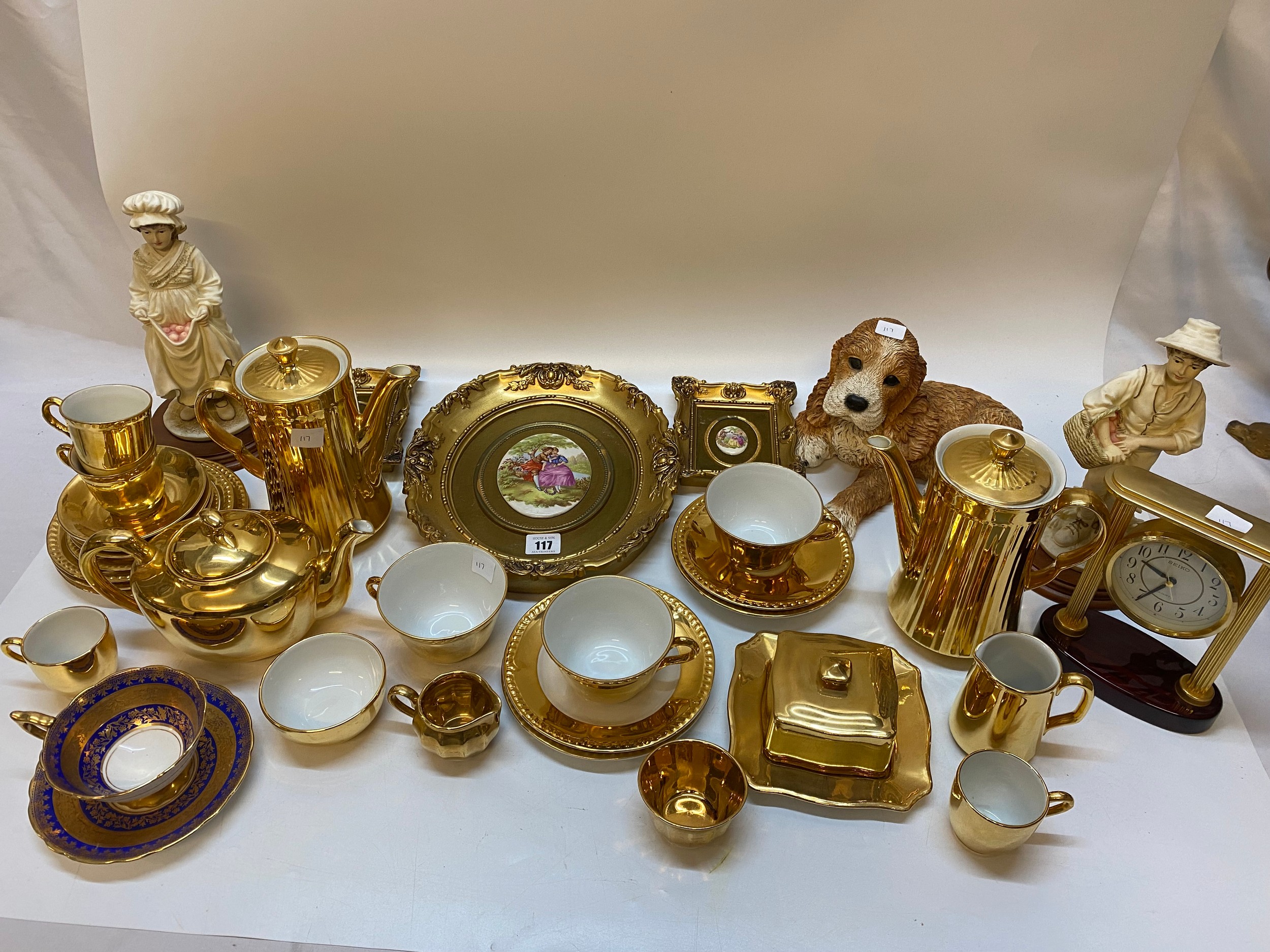 A selection of small oval plaques decorated after Fragonard in gilt frames, a resin model of a recumbent dog, a selection of gold decorated coffee wares, a Royal Stafford cup and saucer, blue and gilt decorated and a Seiko mantel clock with quartz movement