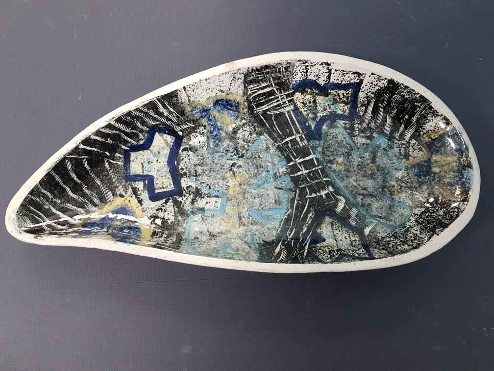Rare Prudhoe Pottery Glazed Dish with abstract design, 33cm x 15cm, marking to base