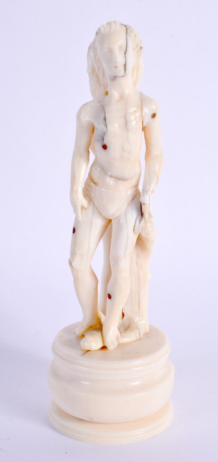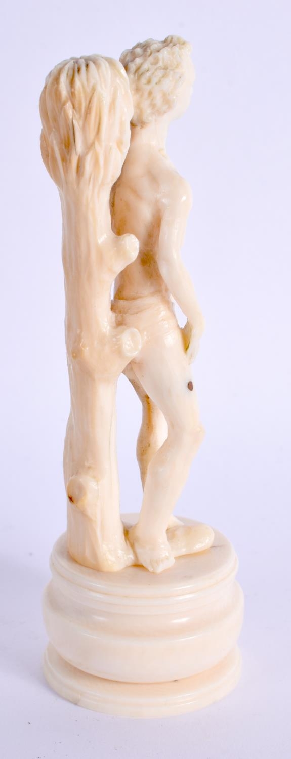 A RARE 19TH CENTURY EUROPEAN IVORY FIGURE OF A STANDING MALE modelled shirtless and roaming. 12 cm high.