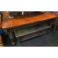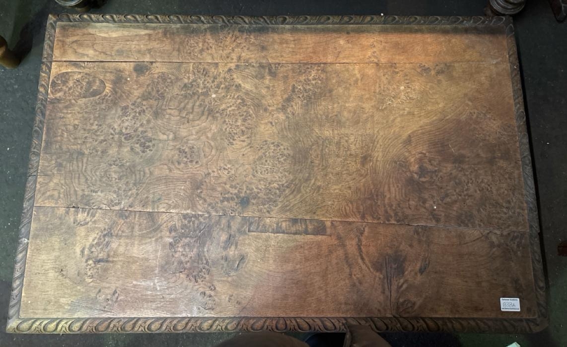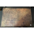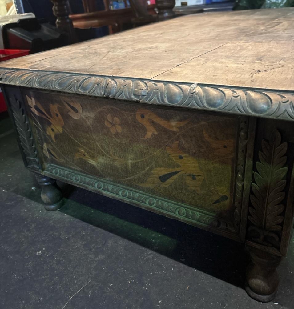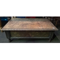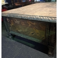 Antique wooden low table with detailed side panels. Approx H39cm x W113cm x D72cm