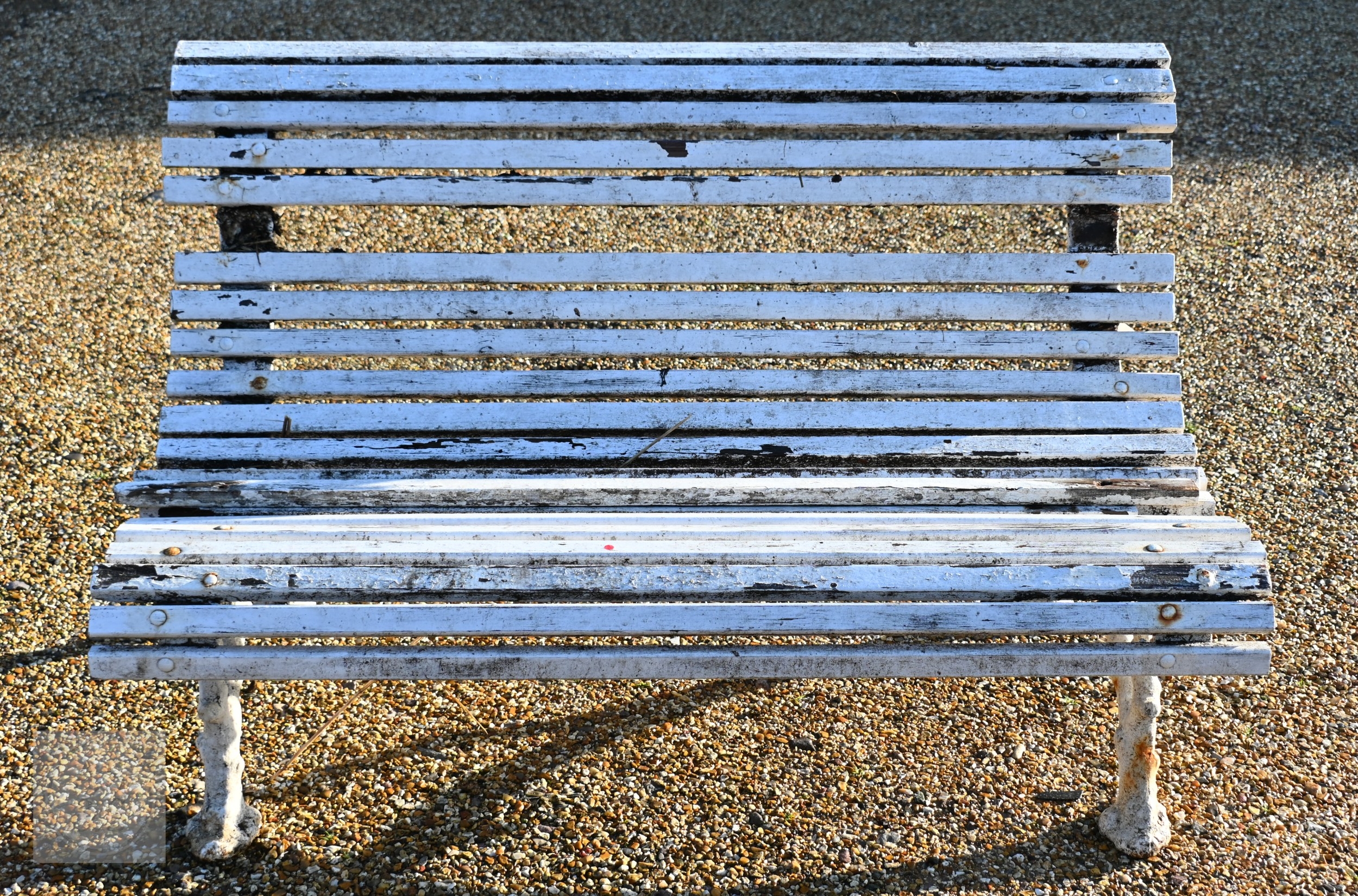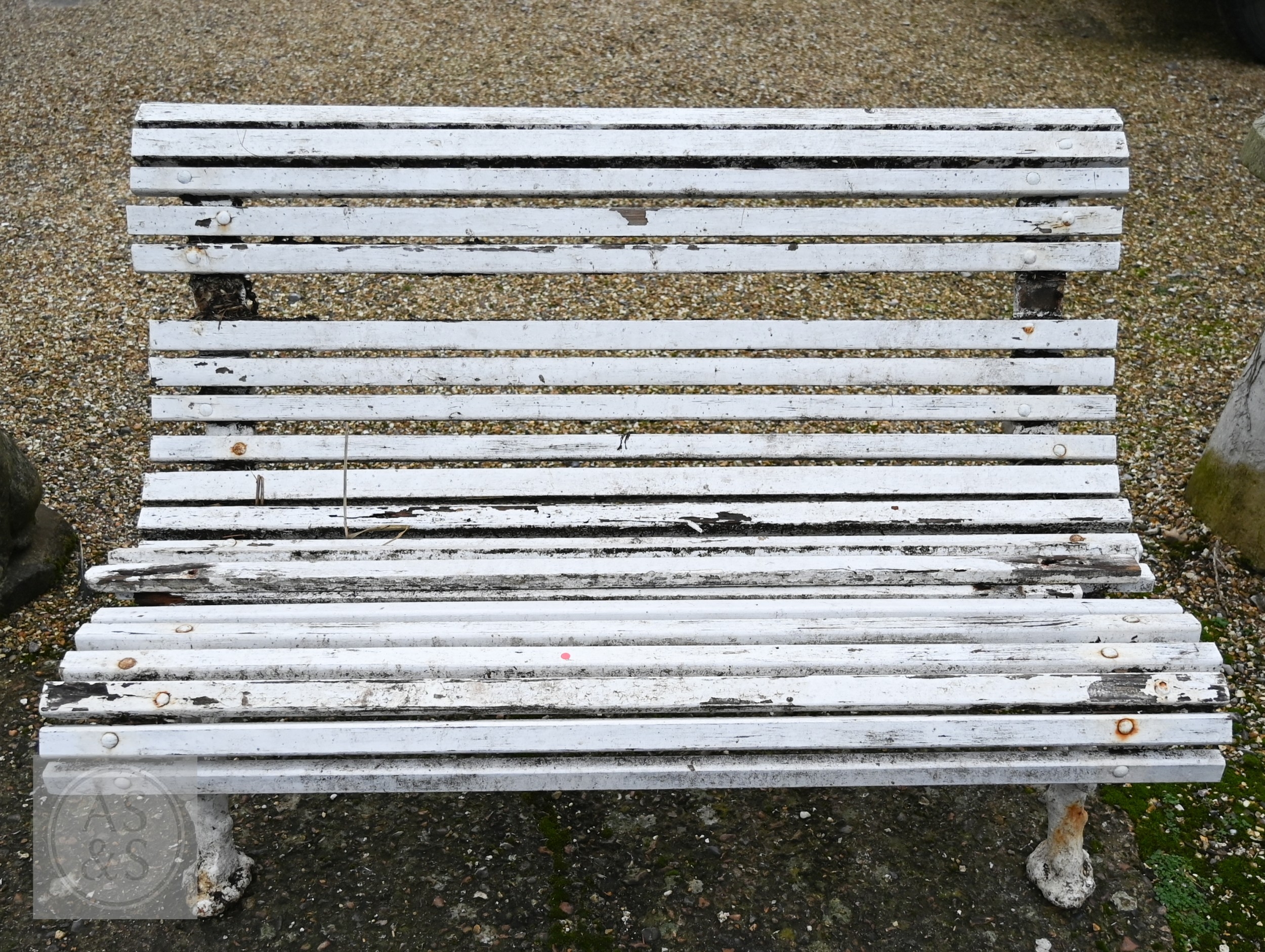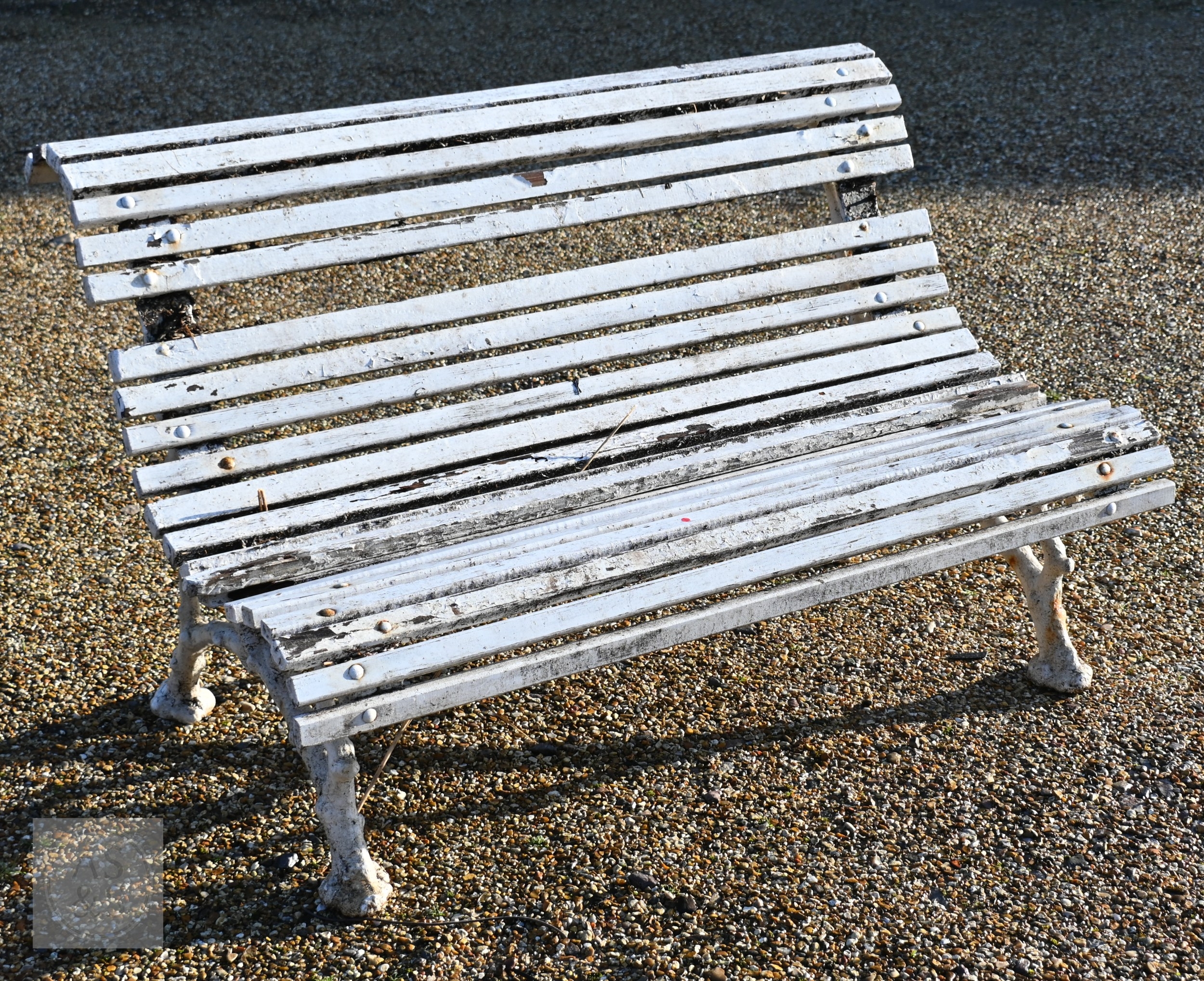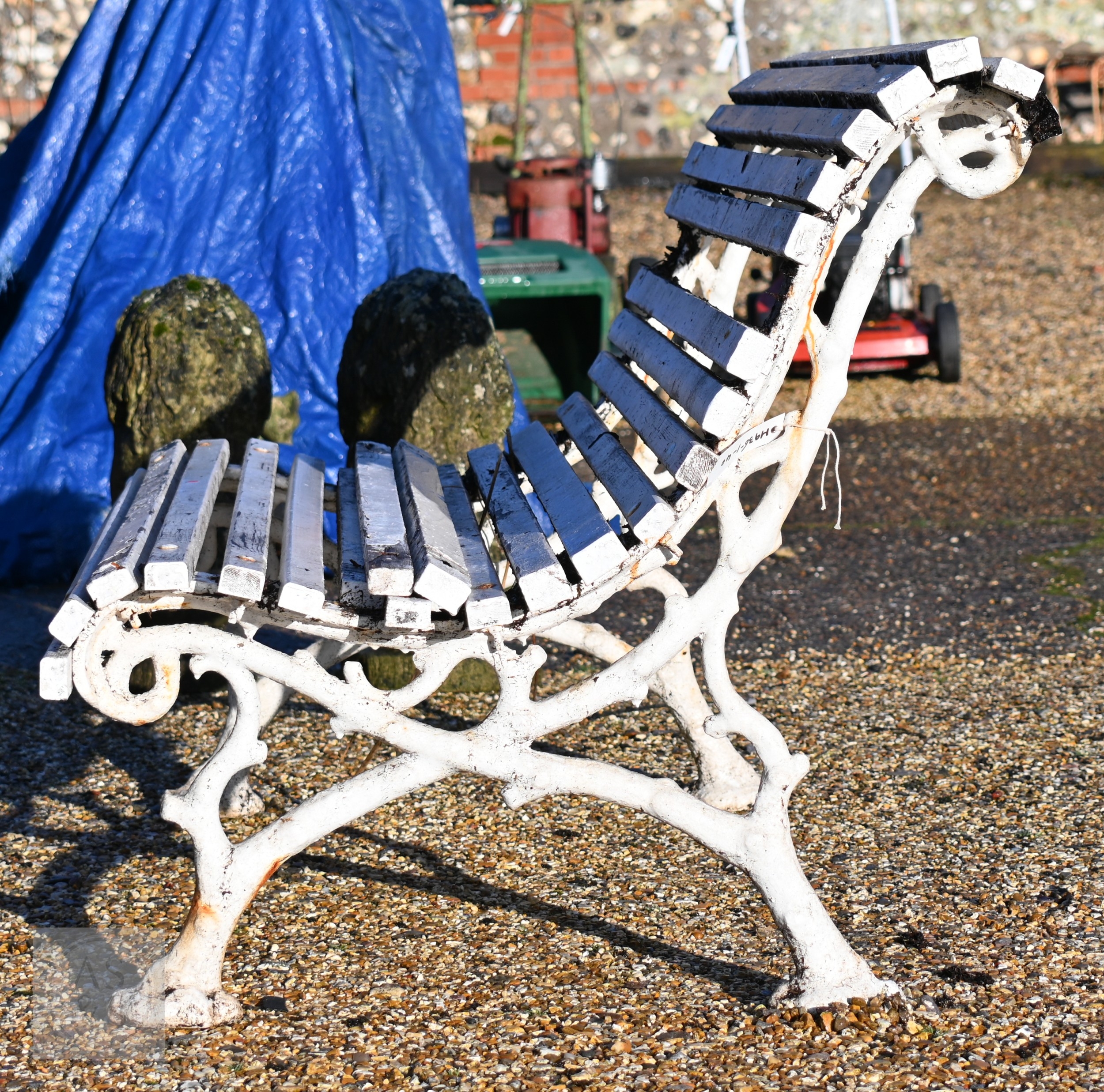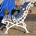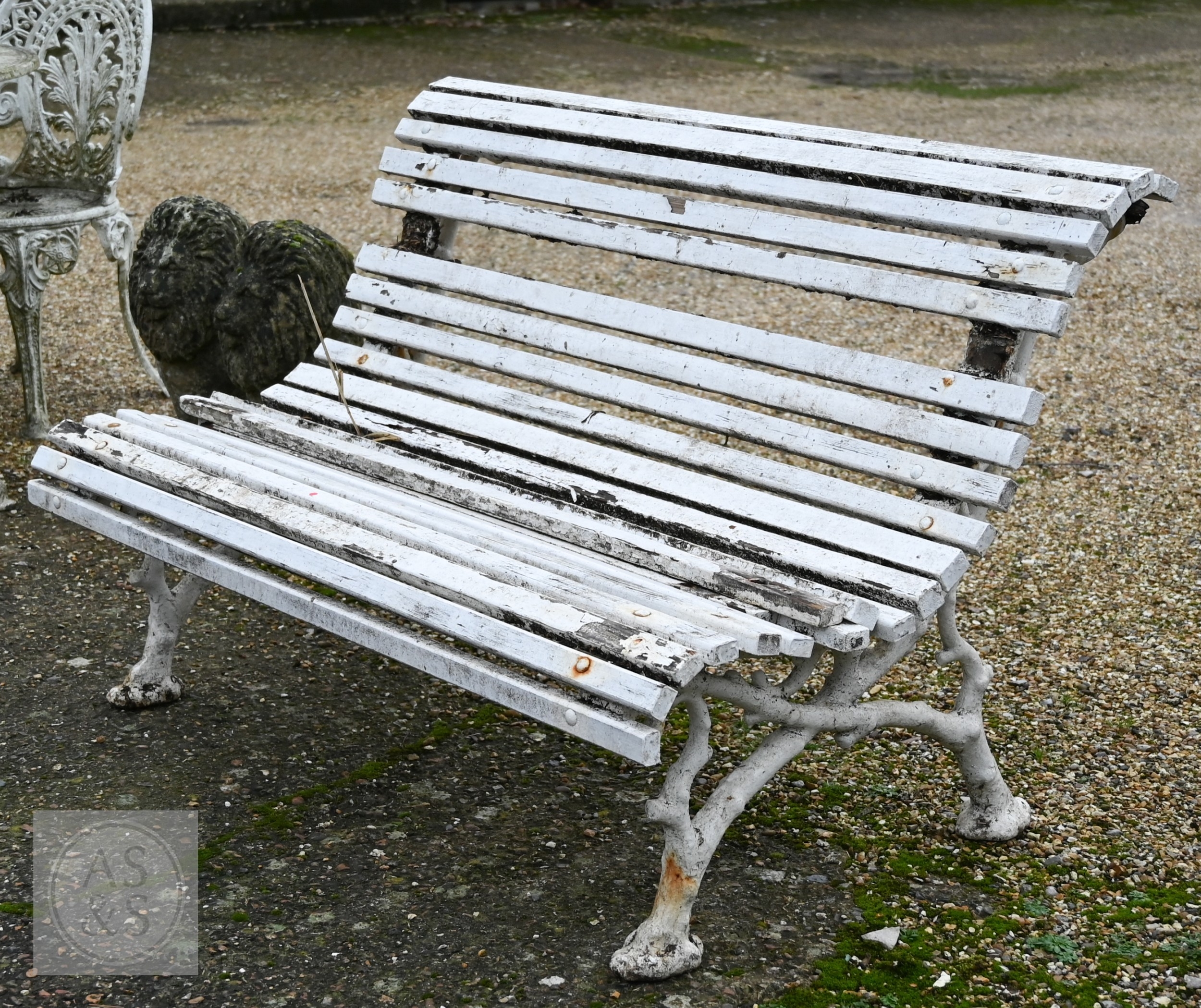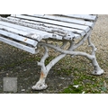 A Victorian cast iron faux-bois branch framed wood slat garden bench, a/f