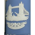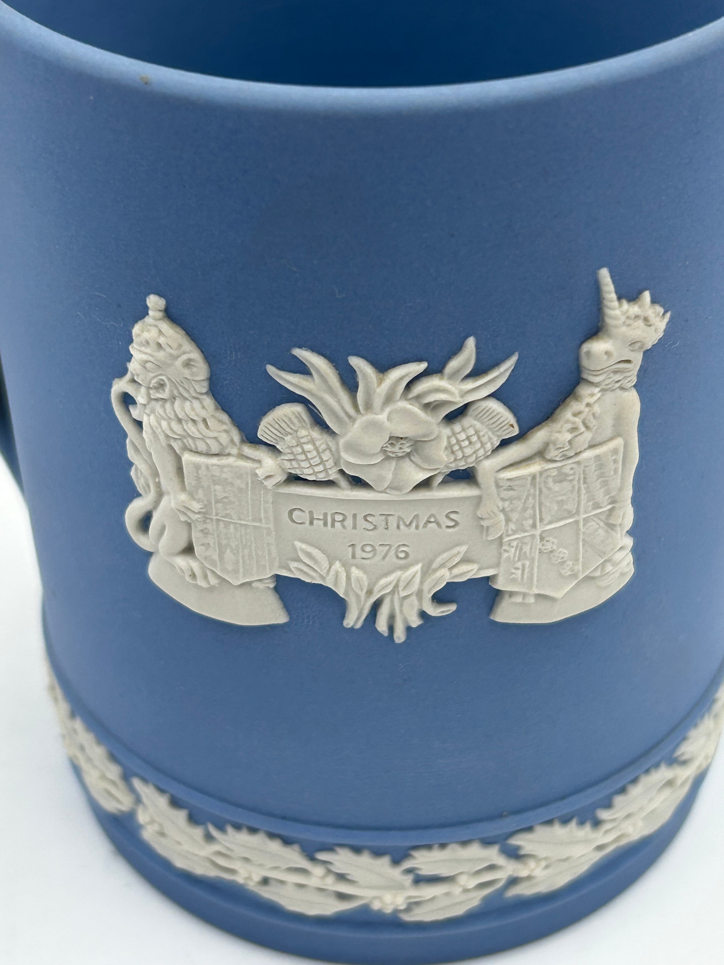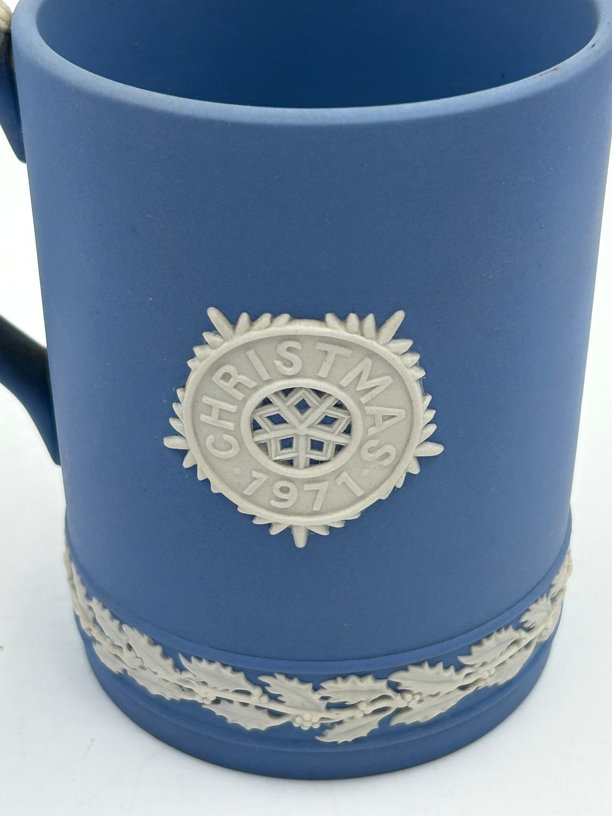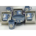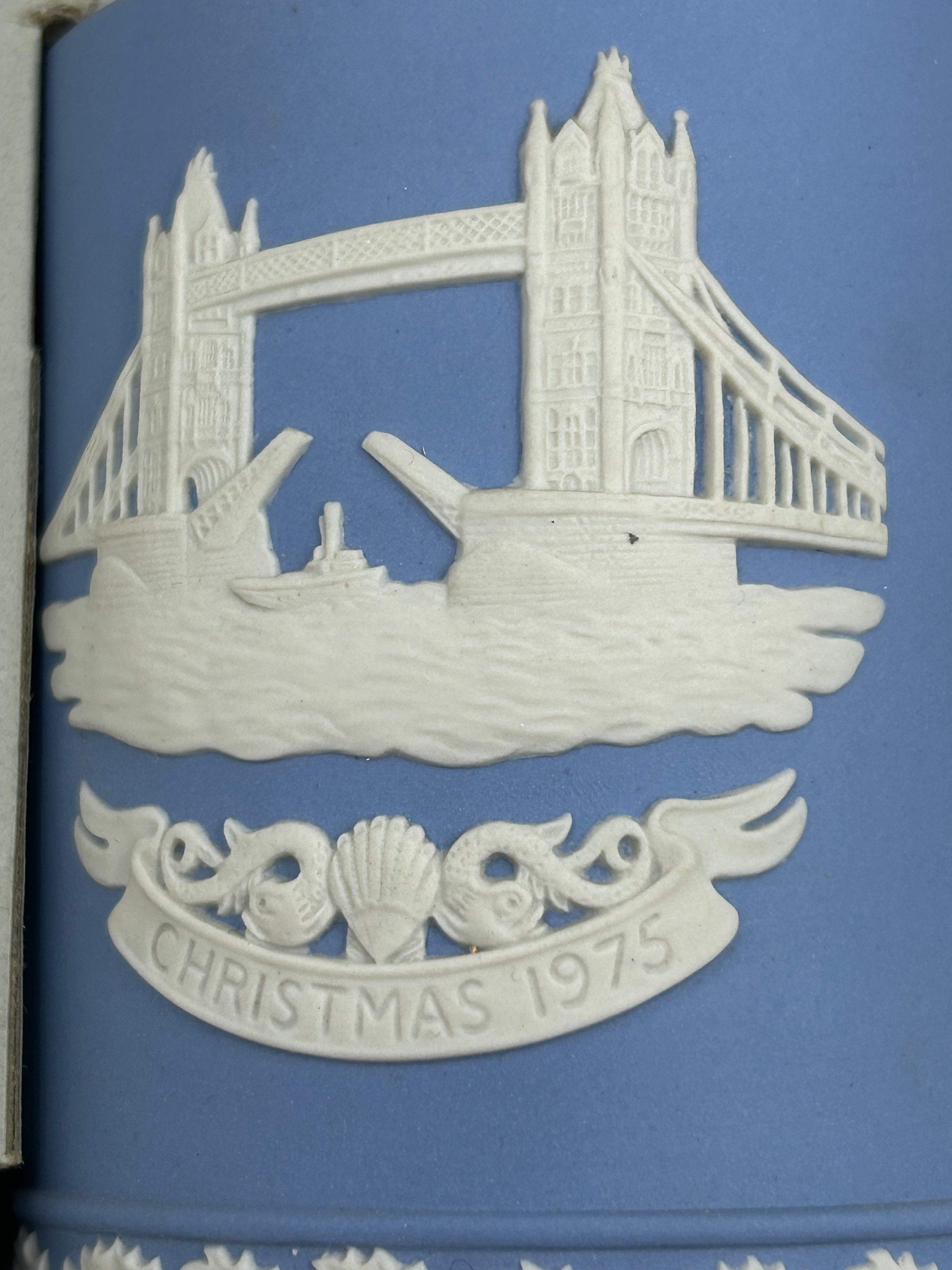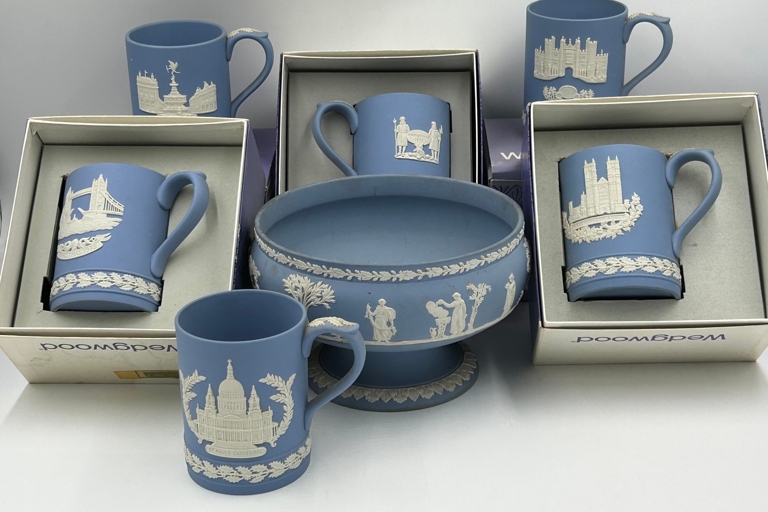 Wedgwood blue jasperware to include a footed fruit bowl 20cm d x 13cm h and 6 x Christmas Mugs 11cm Piccadilly Circus 1971, St Pauls Cathedral 1972, Tower of London 1973, Tower Bridge 1974, Hampton Court 1975, Westminster Abbey 1977. (7).