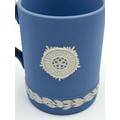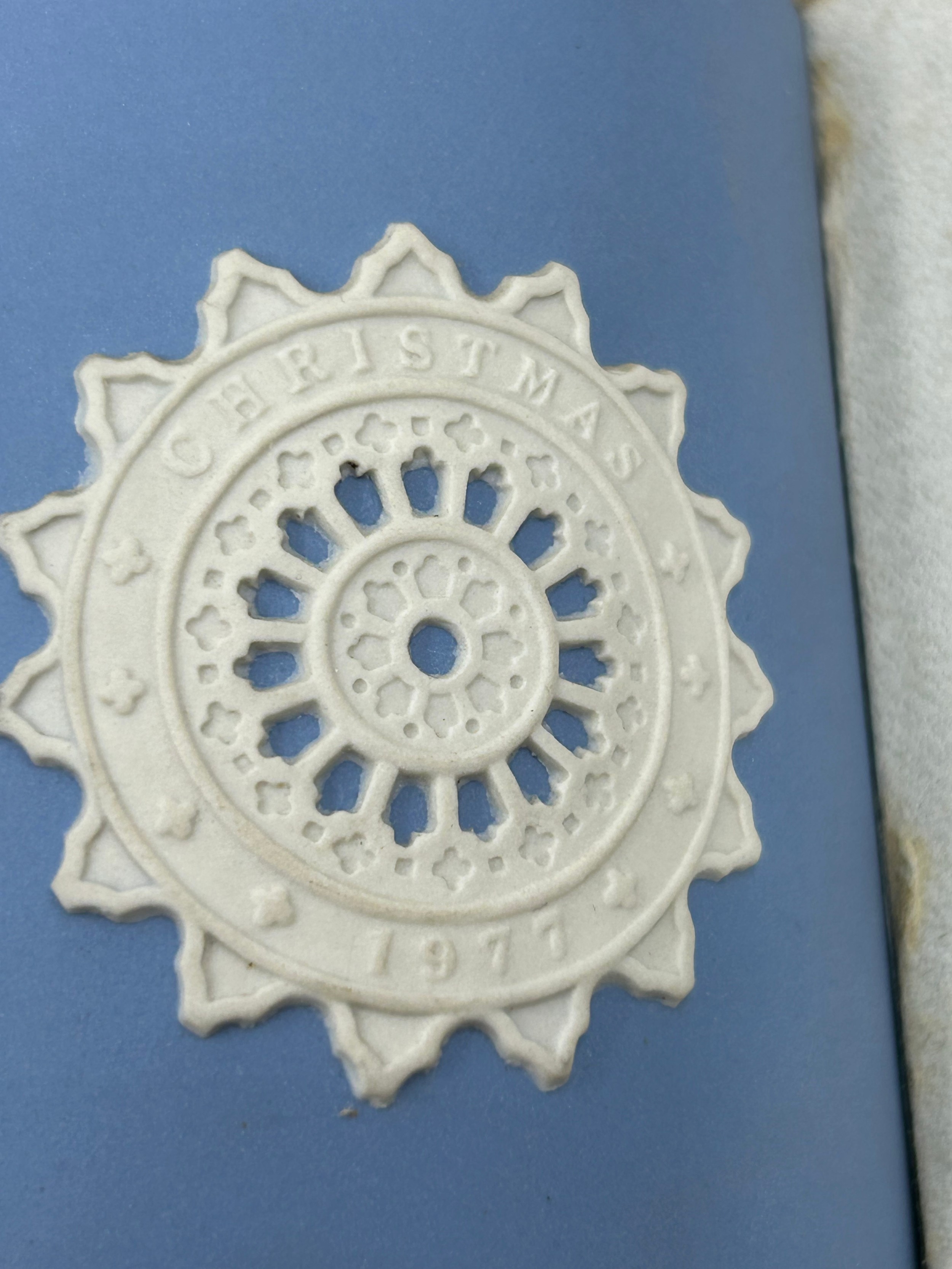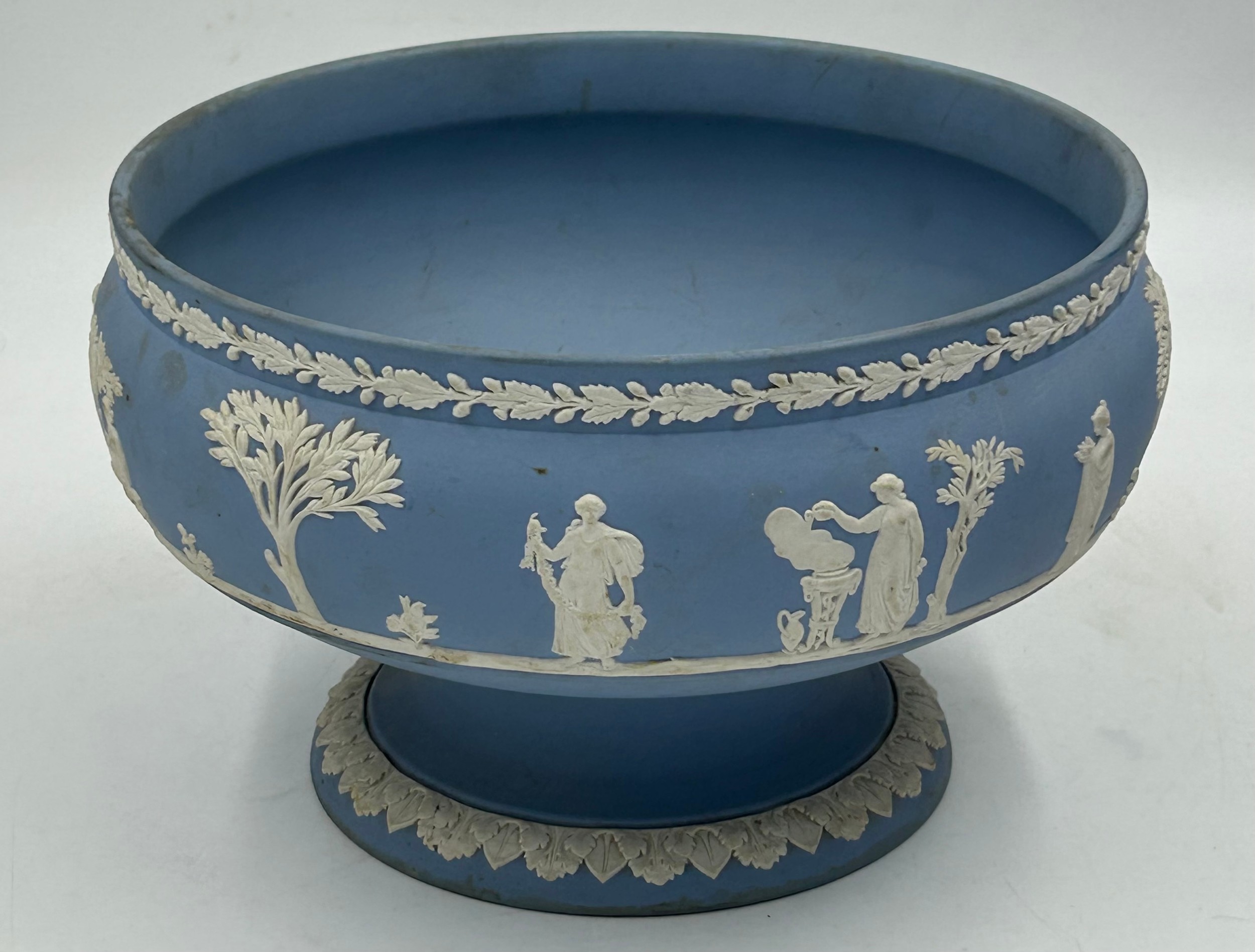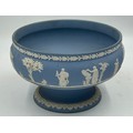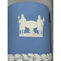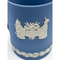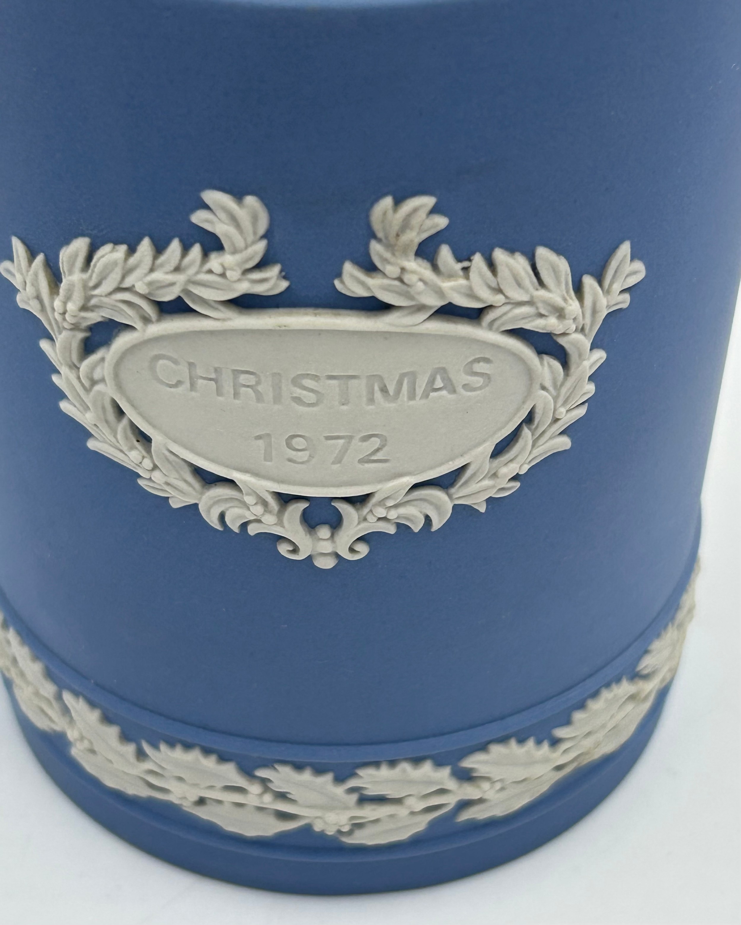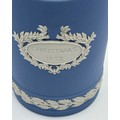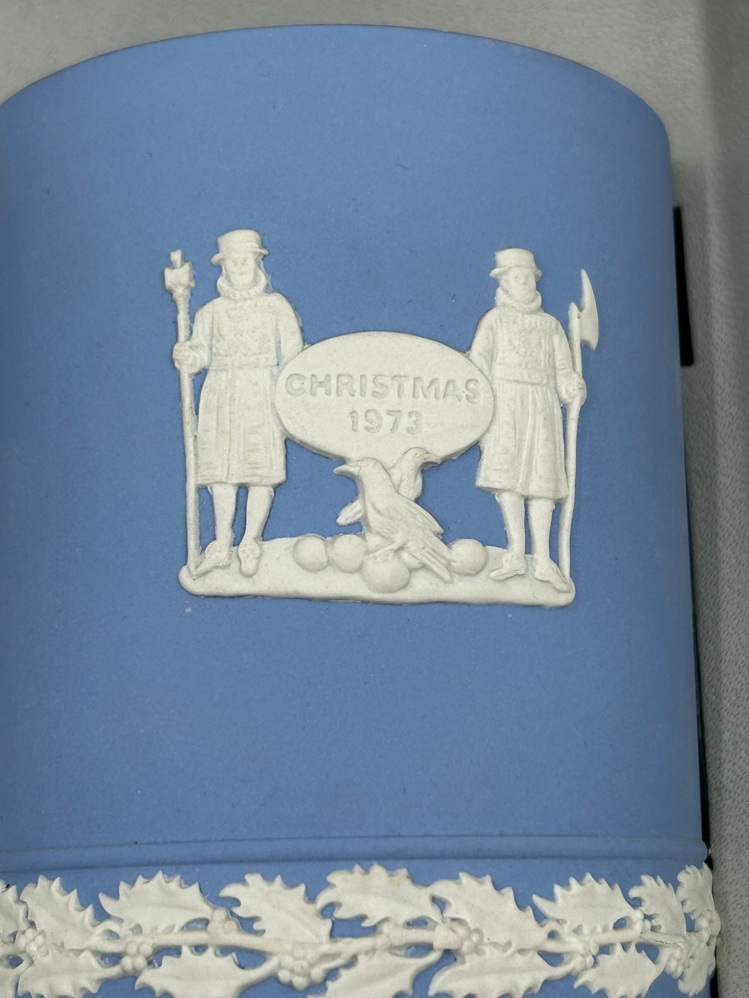 Wedgwood blue jasperware to include a footed fruit bowl 20cm d x 13cm h and 6 x Christmas Mugs 11cm Piccadilly Circus 1971, St Pauls Cathedral 1972, Tower of London 1973, Tower Bridge 1974, Hampton Court 1975, Westminster Abbey 1977. (7).