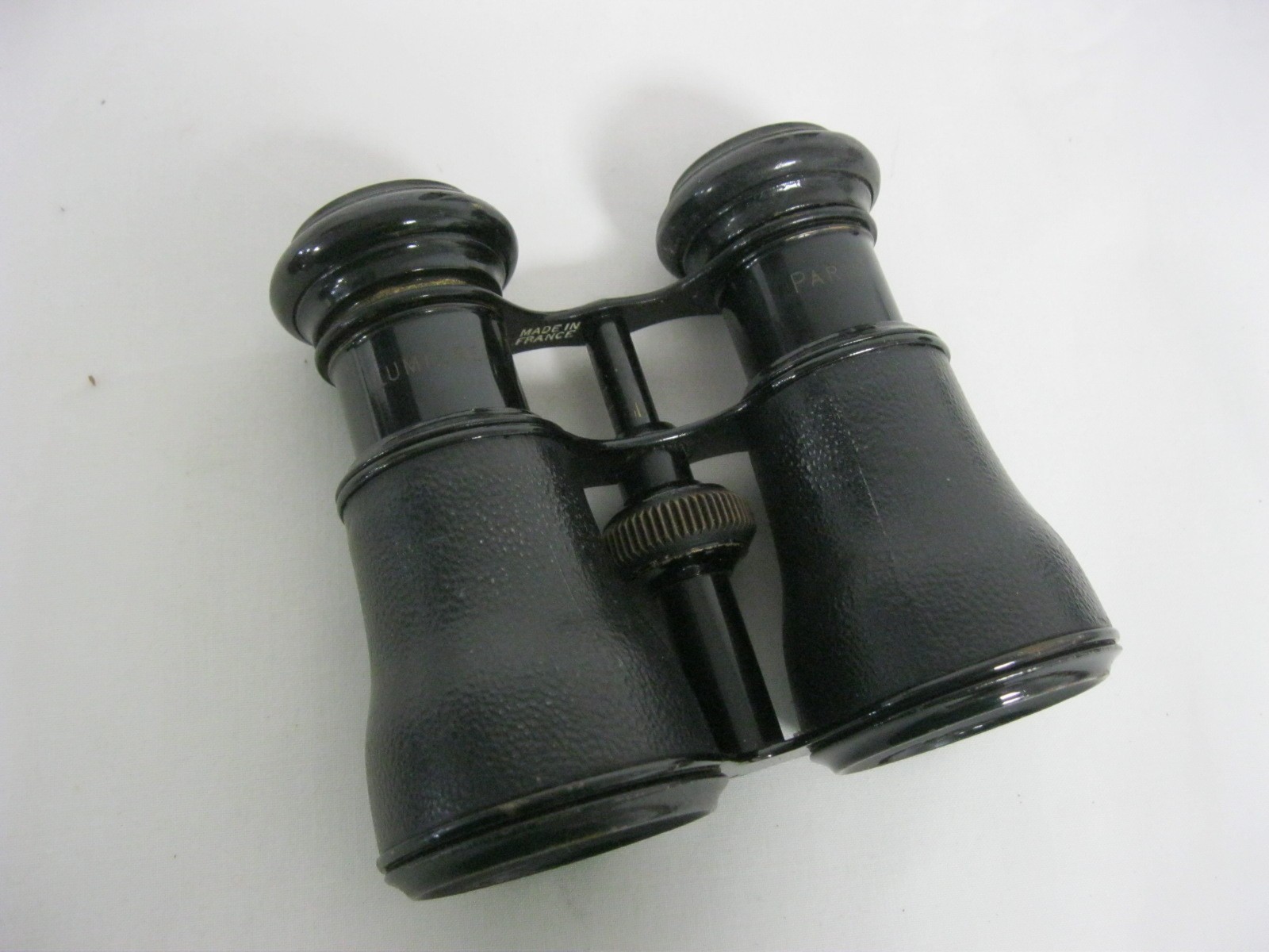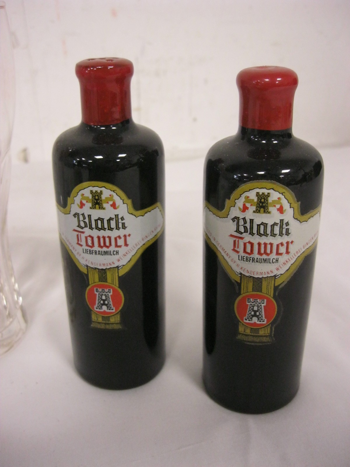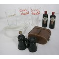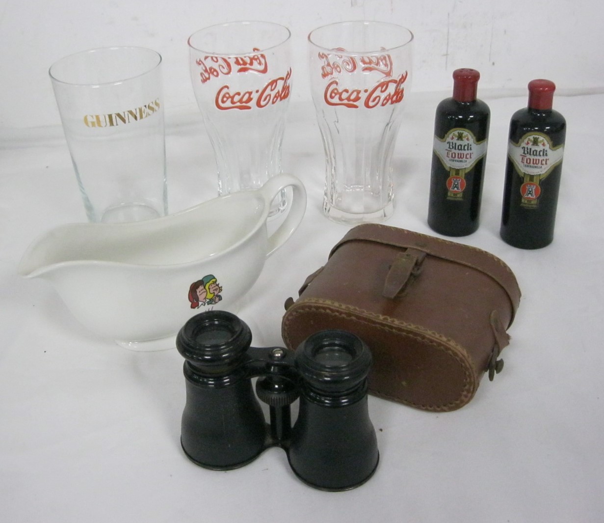 A ceramic salt and pepper modelled as bottles of Black Tower, a Guinness pint glass, two Coca Cola glasses, a Royal Winton Aah! Bisto gravy boat, and a pair of opera glasses marked Lumiere Paris Made in France in leather case