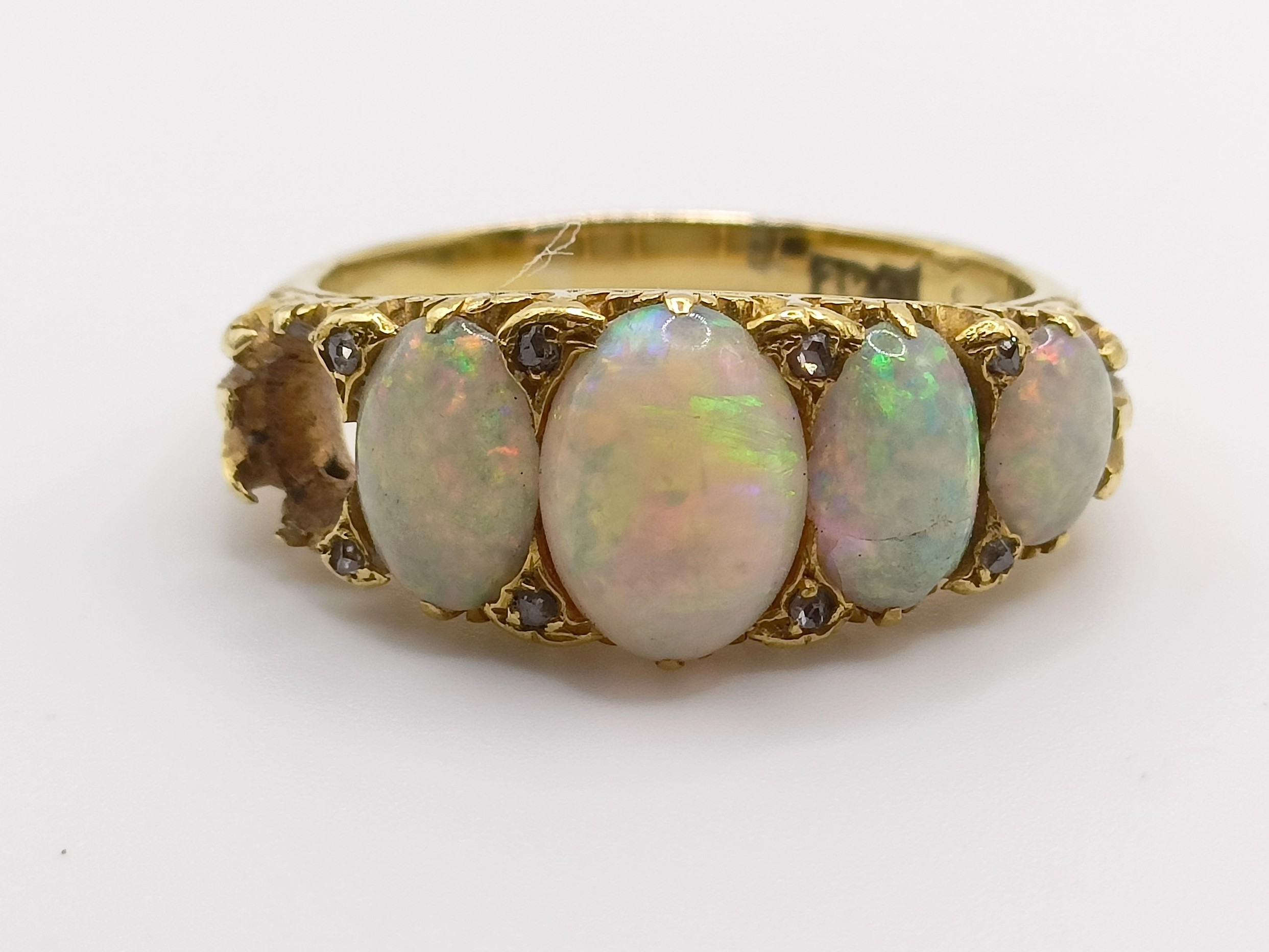 An 18ct gold and five stone opal ring, one opal missing, ring size N