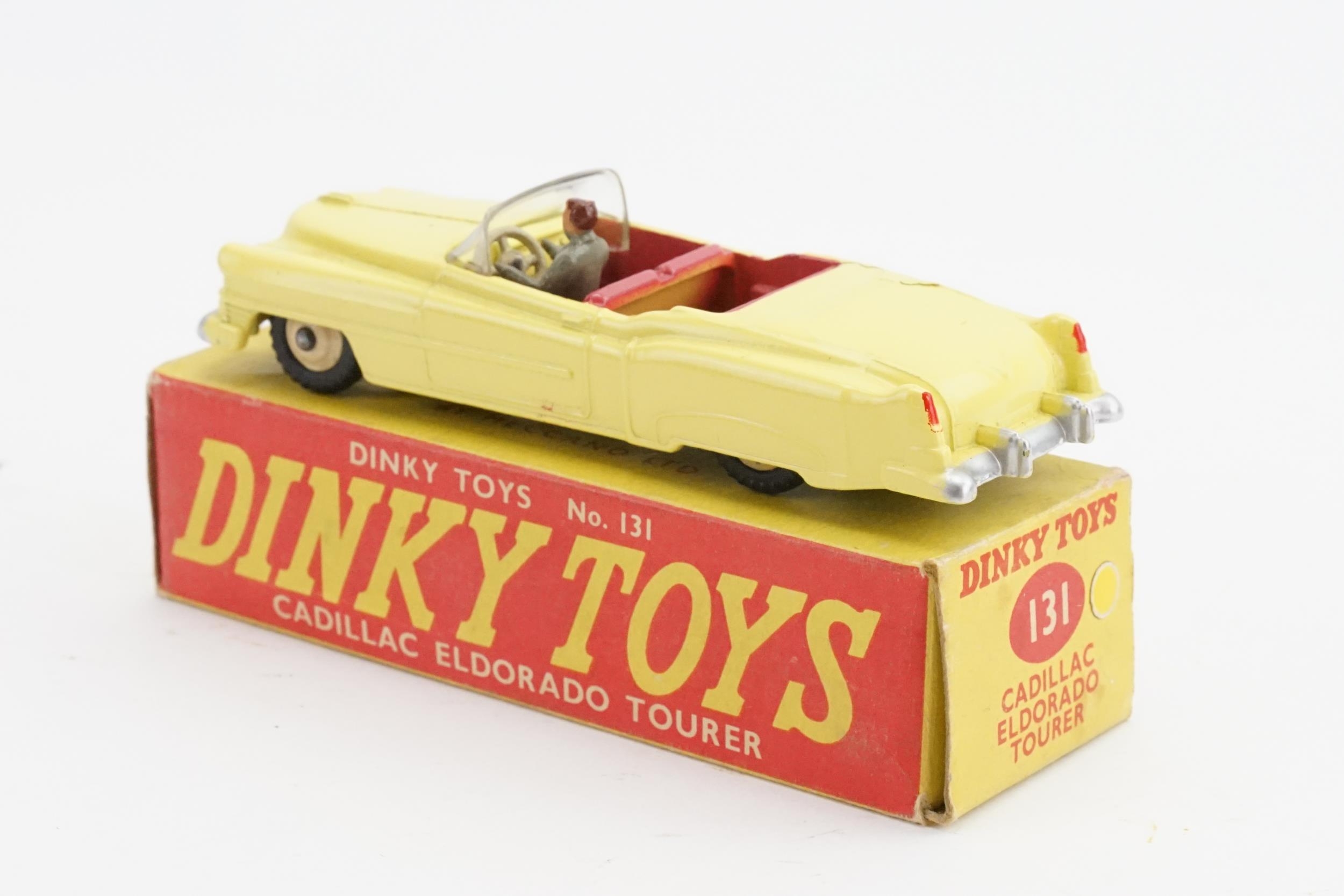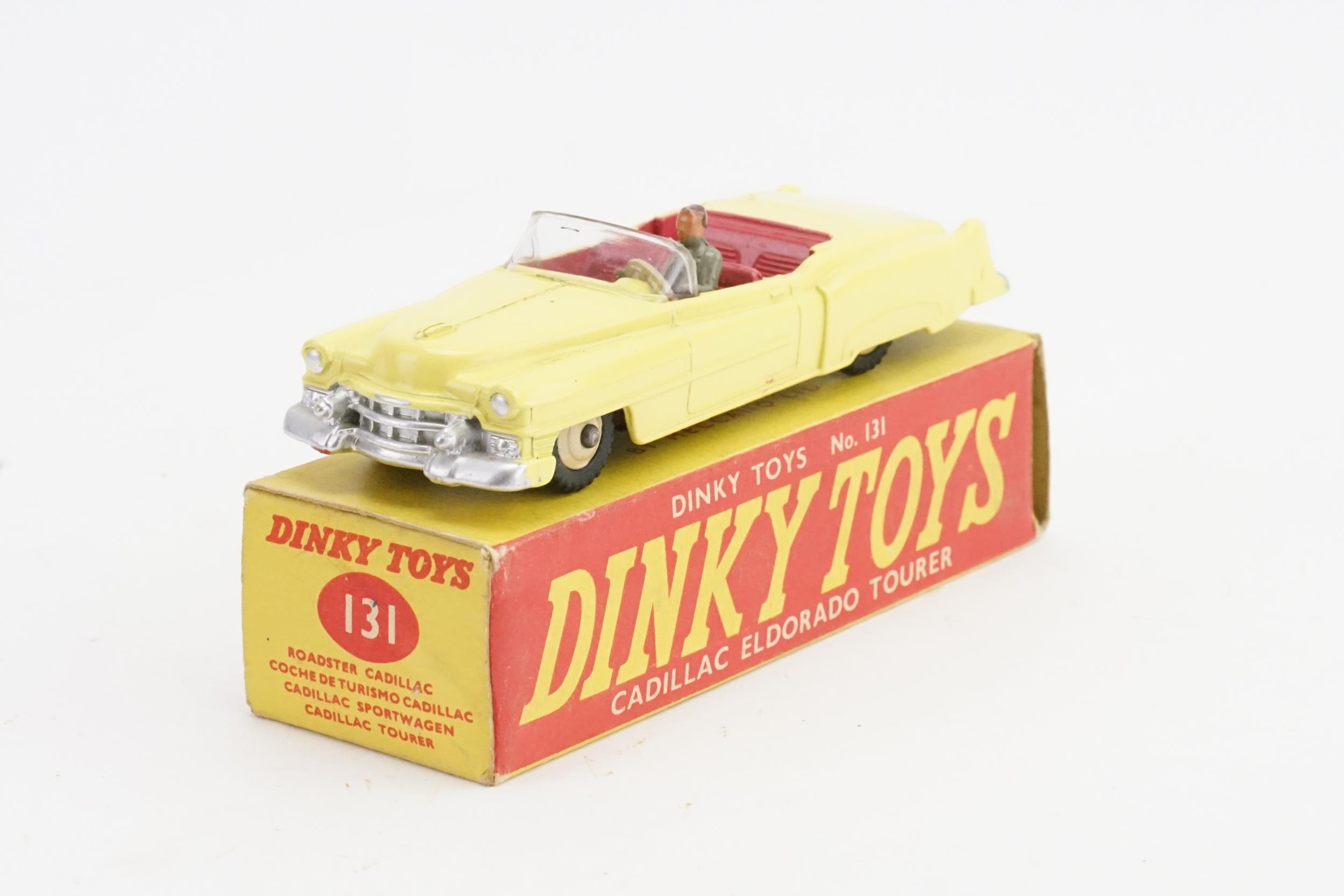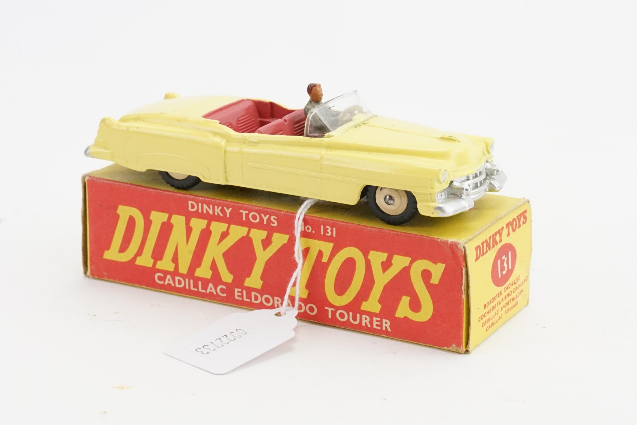 A Dinky No: 131 "Cadillac Eldorado Convertible" finished in Yellow with Pinky/Red interior, Driver, Cream Hubs & Treaded Tyres. The model is in Near Mint Original Condition & comes in a Good/Excellent Original Correct Colour Spot Box.