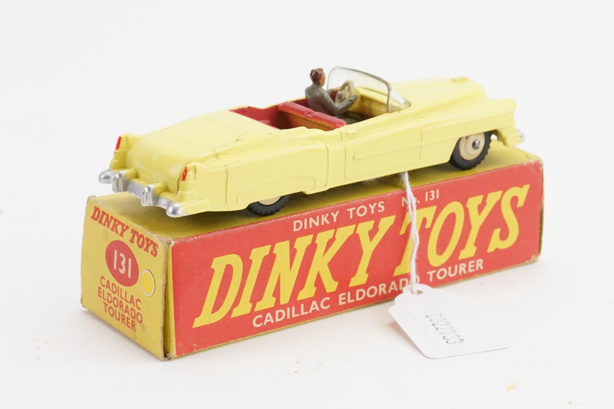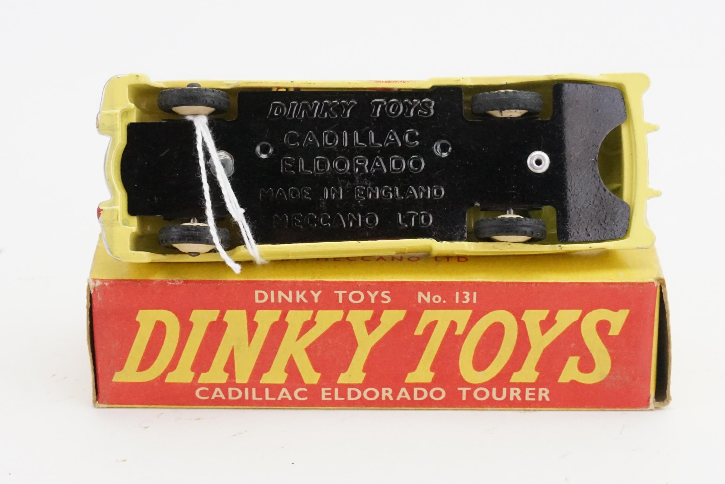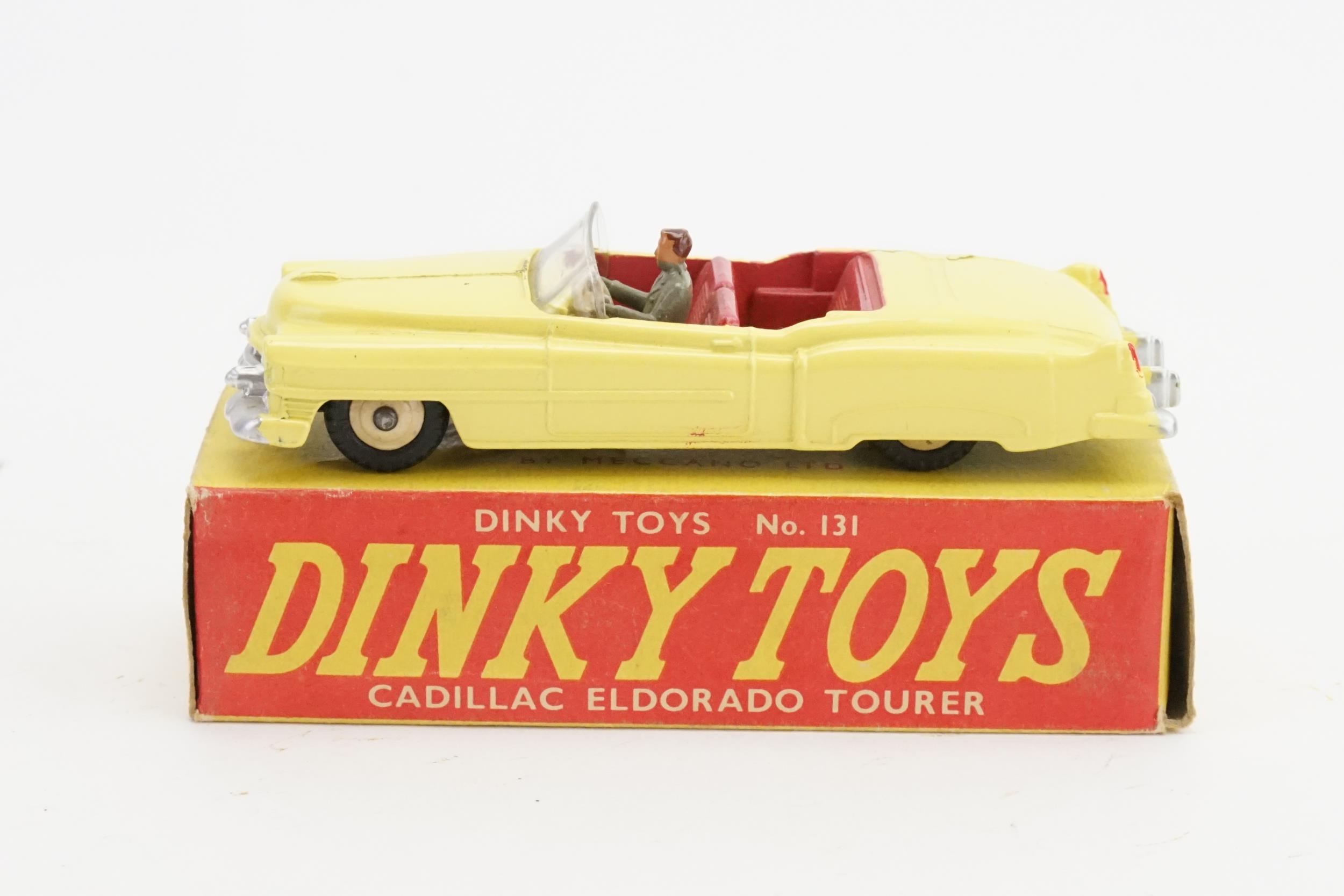 A Dinky No: 131 "Cadillac Eldorado Convertible" finished in Yellow with Pinky/Red interior, Driver, Cream Hubs & Treaded Tyres. The model is in Near Mint Original Condition & comes in a Good/Excellent Original Correct Colour Spot Box.