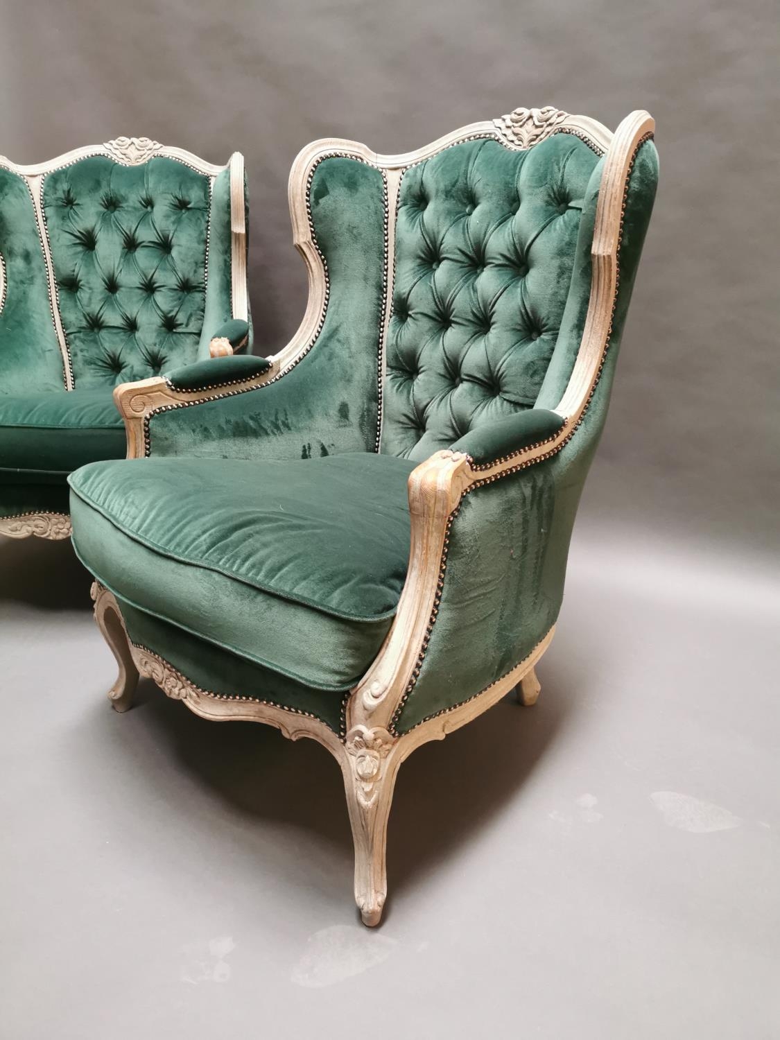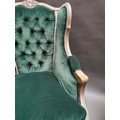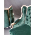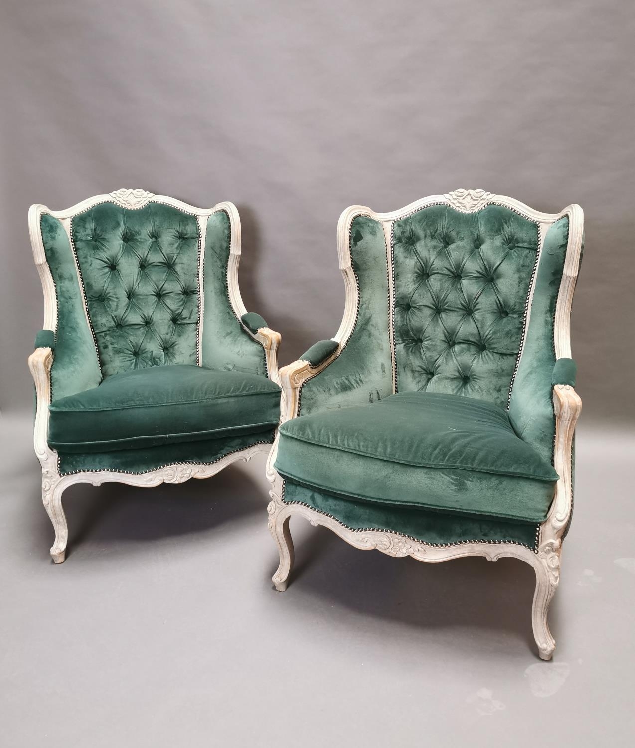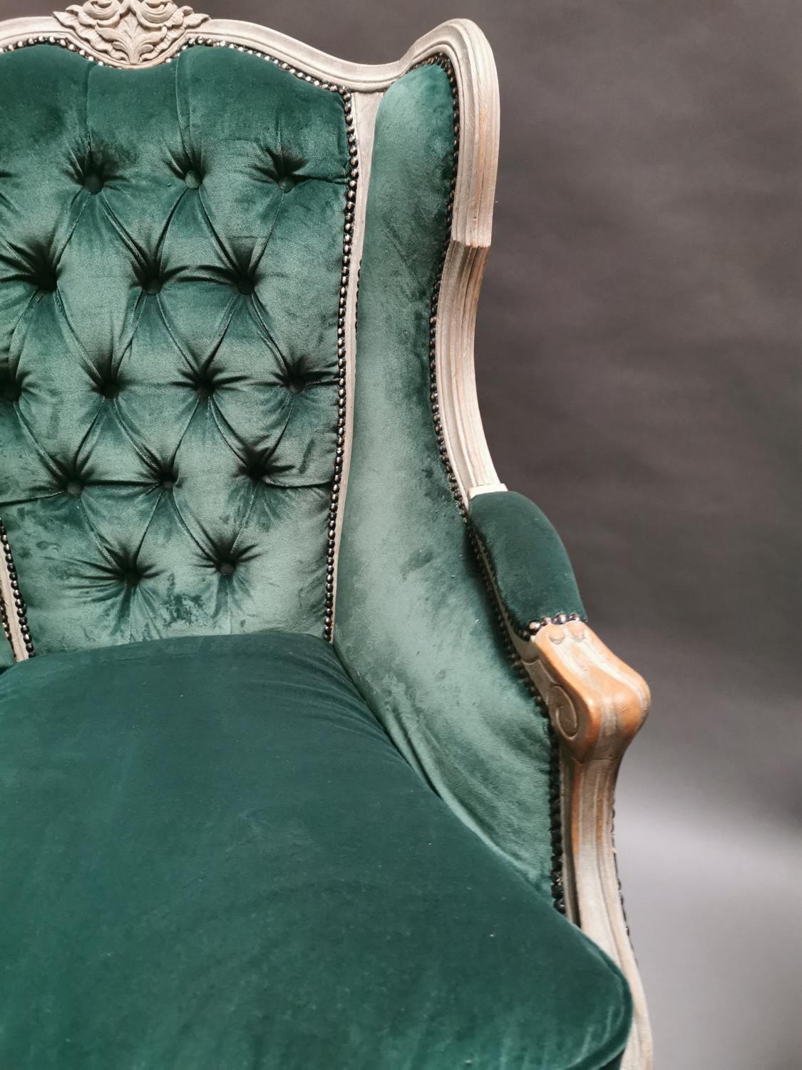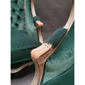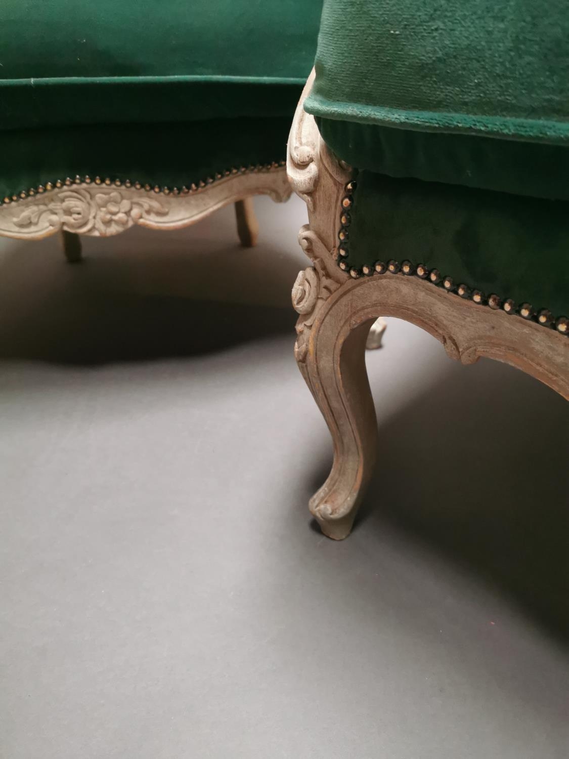 Pair of early 20th C. bleached oak and crushed green velvet upholstered arm chairs in the French style.